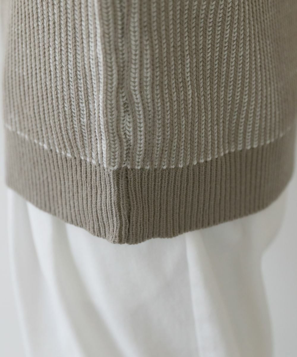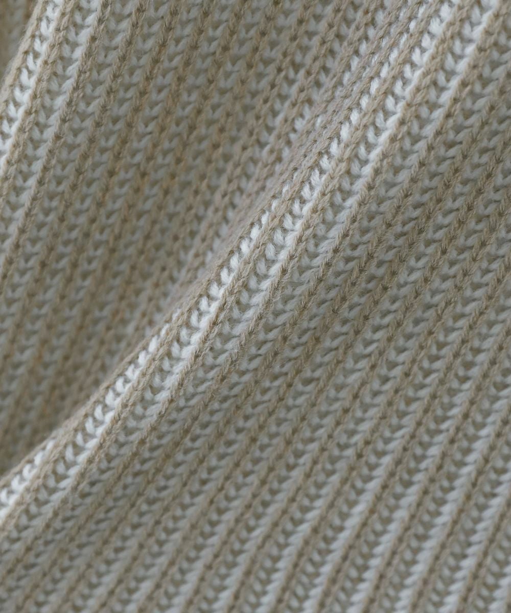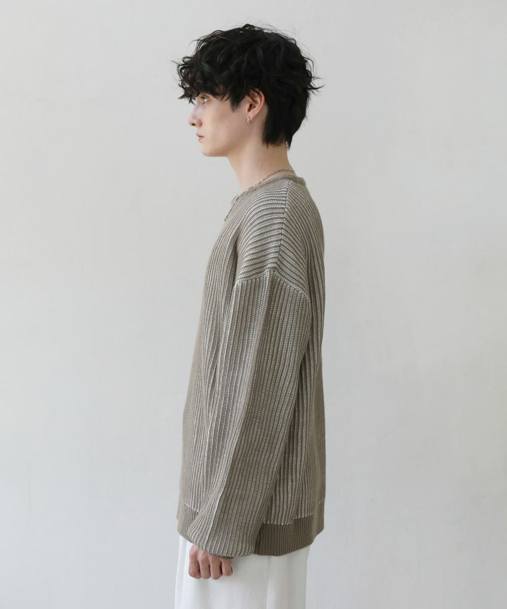 立体的な表情の編地が特長の二重臼ニット。ボリュームのあるリブ仕立てのデザインが特徴。2色の糸を編み込んでいるため、裏面の色との絶妙な配色が着こなしのアクセントになります。ドロップショルダーデザインと余裕を持たせた身幅で、ゆったりしたシルエットが抜け感を作り出してくれる一着。春や秋の1枚着として、また寒い時期はアウターのインナーとしてもおすすめです。