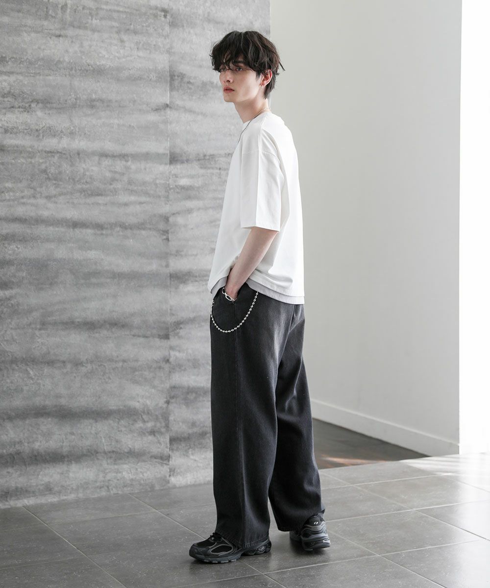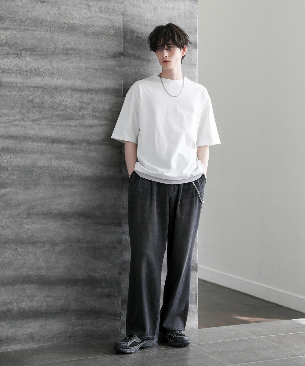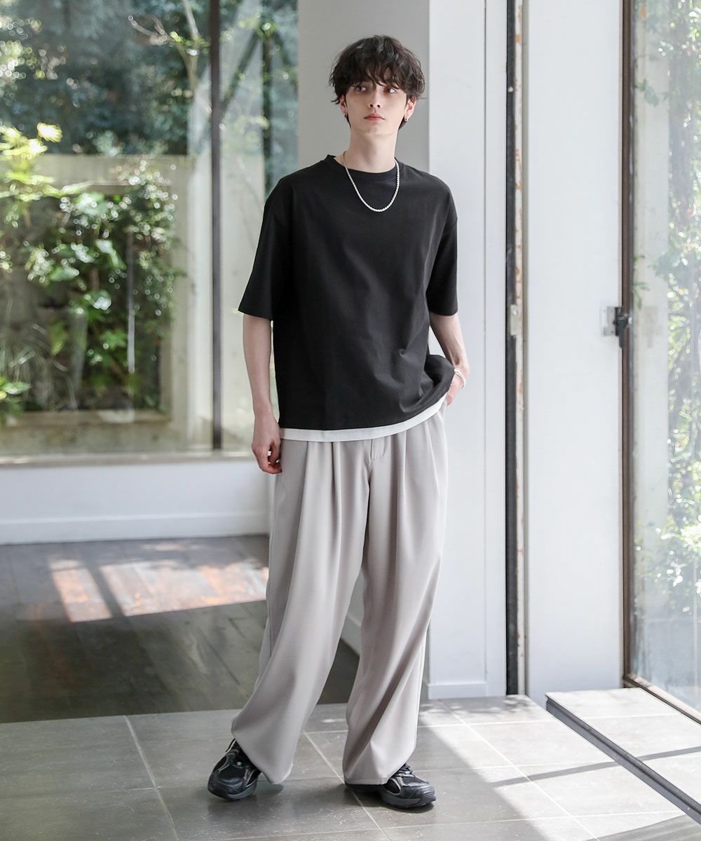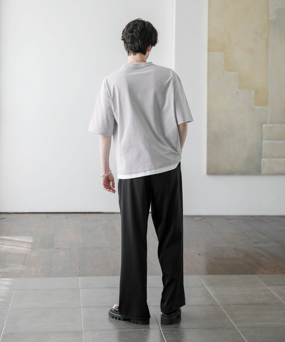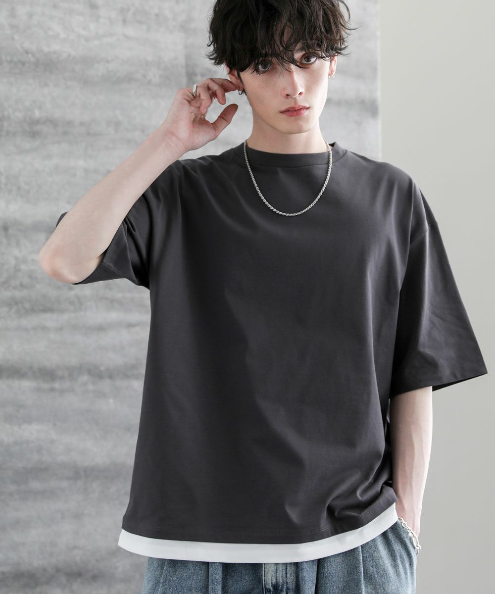 裾からインナーがチラッと見えているようなフェイクレイヤード仕様になっており、1枚でレイヤードスタイルが完成するアイテム。