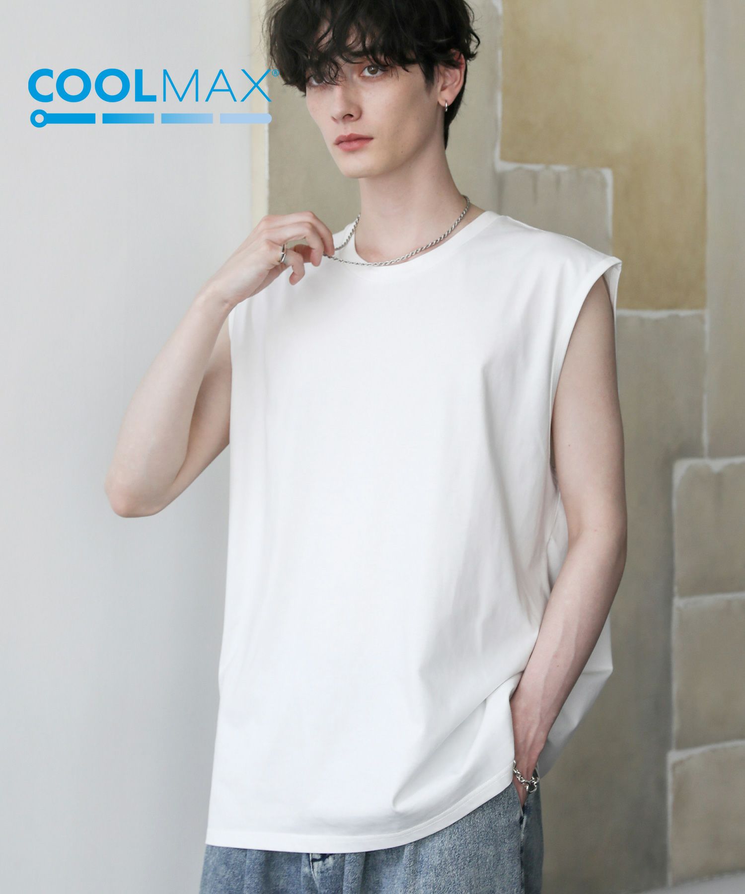 ドライな着心地を保つ機能素材、COOLMAX(R)(クールマックス)を使用したノースリーブカットソー。COOLMAXとは、優れた吸水速乾性を持つ夏の定番素材。