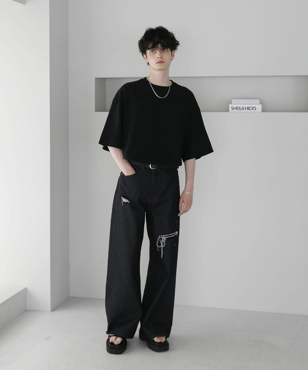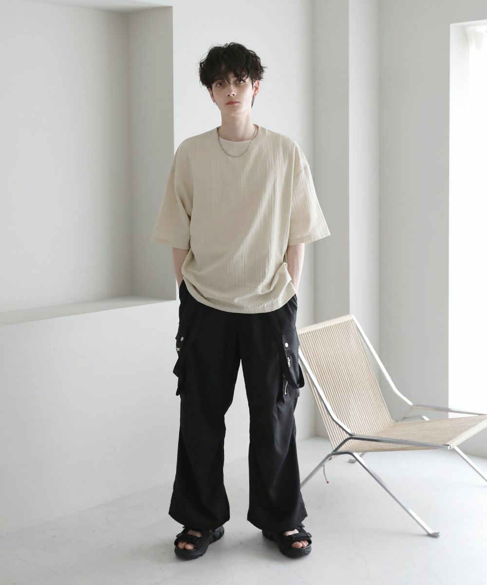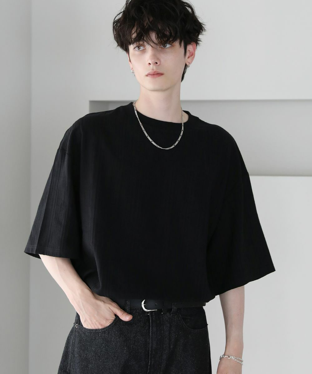 着回しのしやすいシンプルなデザインで、ジャガードの立体感が一味違うスタイルに魅せてくれます。ワイドめのボトムを合わせたリラックス感のある着こなしがおすすめです。