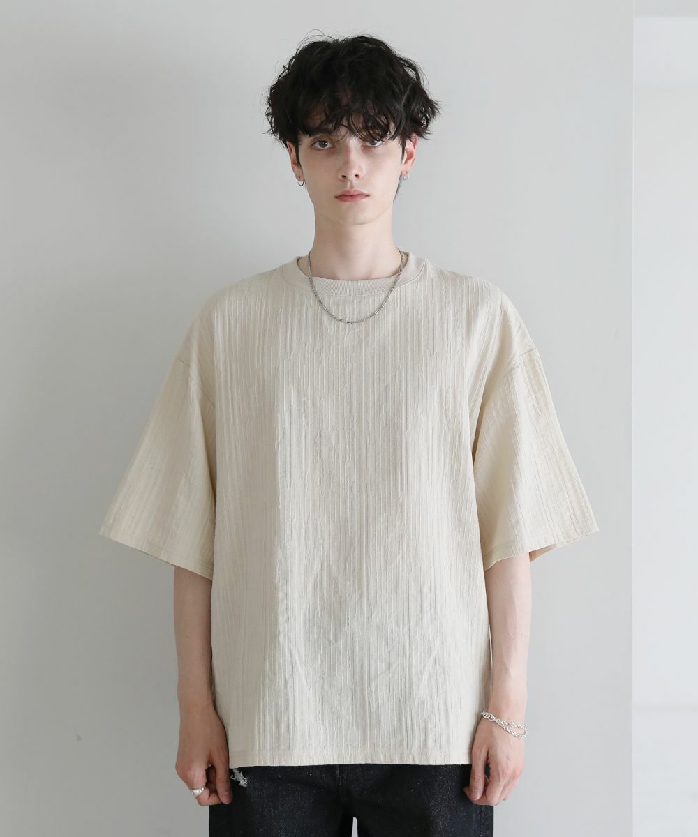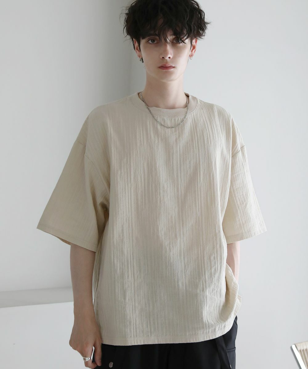 柔らかな肌触りの綿100%を使用。表面に凹凸のあるジャガードニットは立体感があり、コーディネートのアクセントに。軽やかな着心地が魅力で夏でも快適に着られる素材感です。