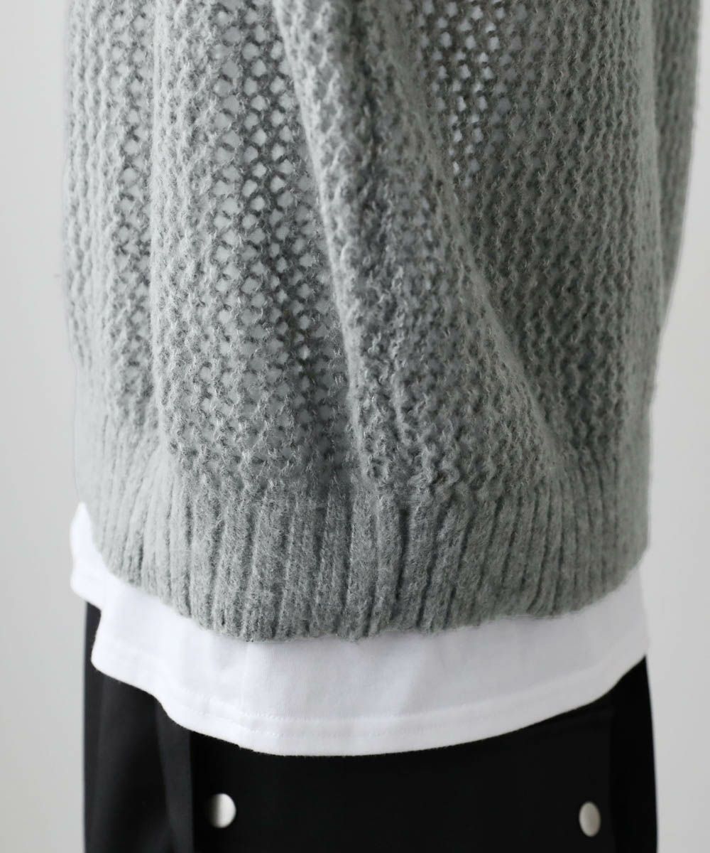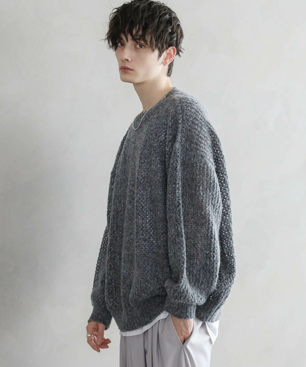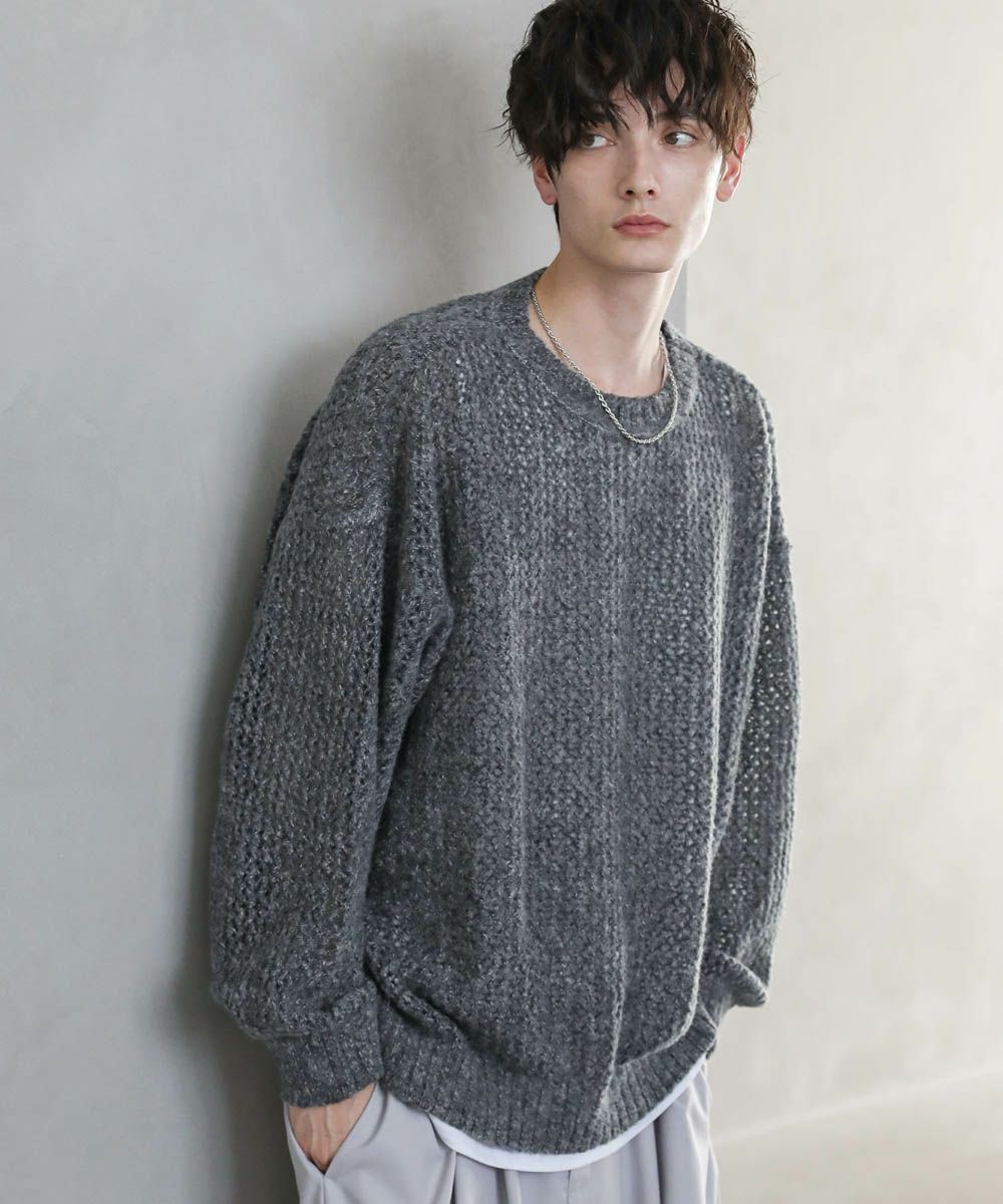 1枚でトレンドの着こなしを作る、透かし編みニットが登場。ざっくりとした編み地で、インナーとのレイヤードを楽しめる1着です。ゆとりのあるルーズシルエットにドロップショルダー、丸みのある溜まり袖がアクセントに。起毛感のあるモヘアタッチのニットは、秋冬らしい温かみのある雰囲気をプラスしてくれます。
