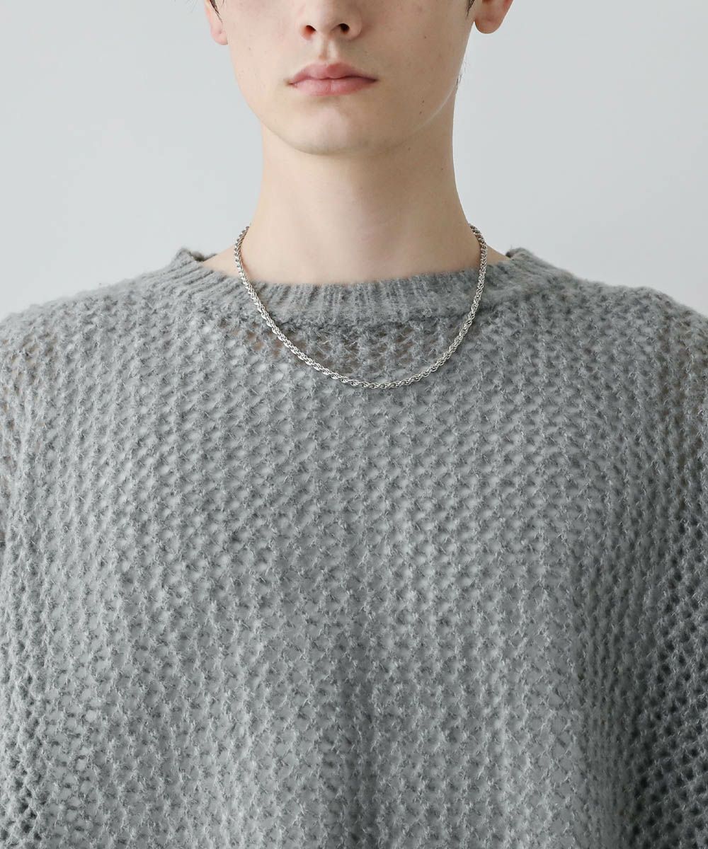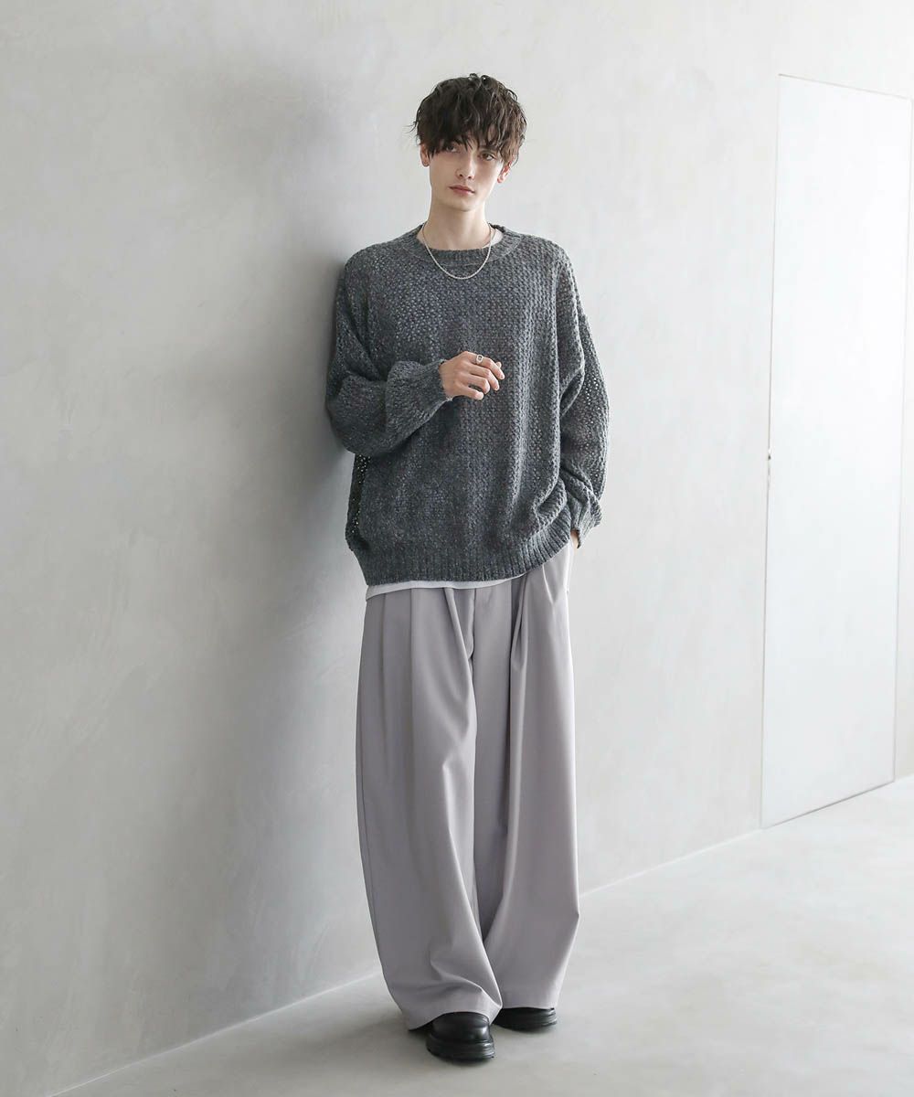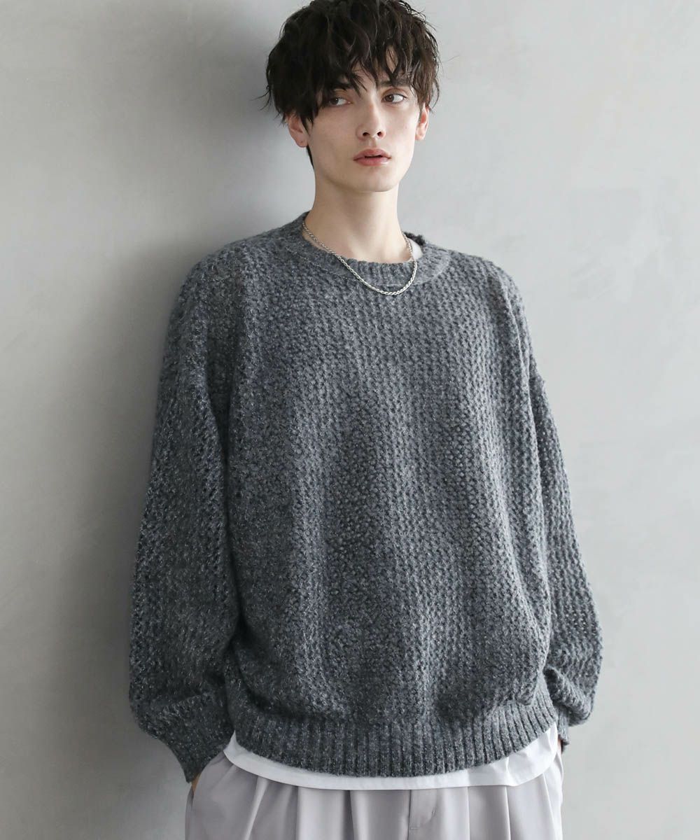 1枚でトレンドの着こなしを作る、透かし編みニットが登場。ざっくりとした編み地で、インナーとのレイヤードを楽しめる1着です。ゆとりのあるルーズシルエットにドロップショルダー、丸みのある溜まり袖がアクセントに。起毛感のあるモヘアタッチのニットは、秋冬らしい温かみのある雰囲気をプラスしてくれます。