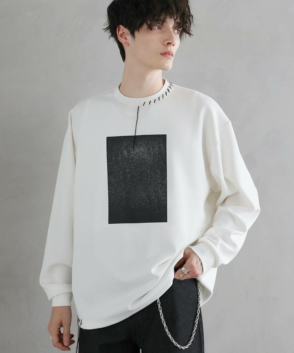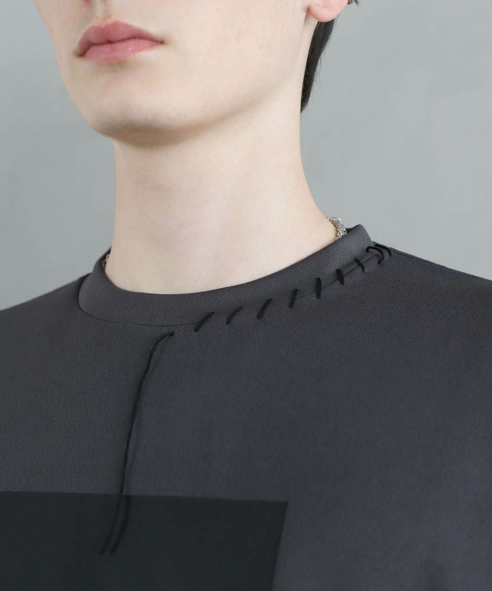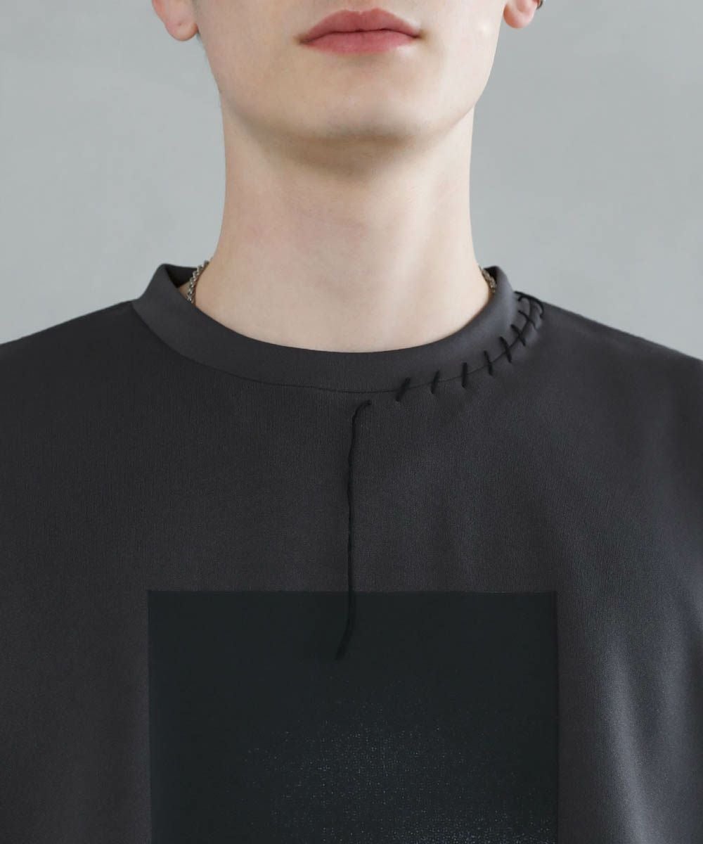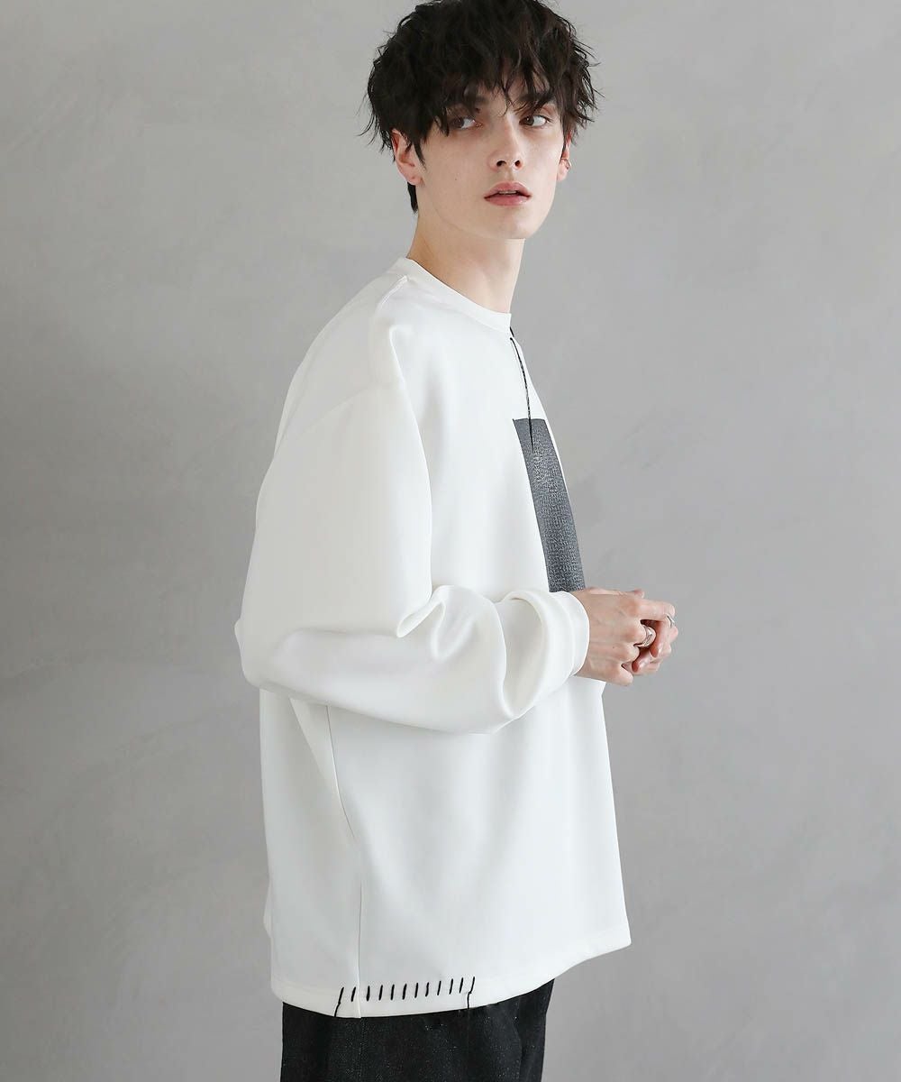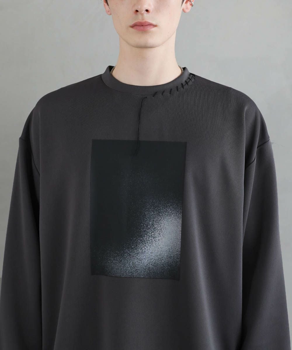 グラフィックプリントとステッチを装飾した、ポンチロンT。フロントにはボディのカラーごとに異なるプリントを配置しました。首元と右サイドにステッチを施し、どの角度から見ても動きのあるデザインに。デザイン性を加えつつ全体をモノトーンで統一したことで、お手持ちのワードローブに馴染みやすいアイテムに仕上げました。程よい光沢と艶のあるポンチ生地を使用し、カジュアルになりですすぎず雰囲気のあるスタイルに。マンネリしがちなコーデも簡単に決めてくれる頼れる1枚です。