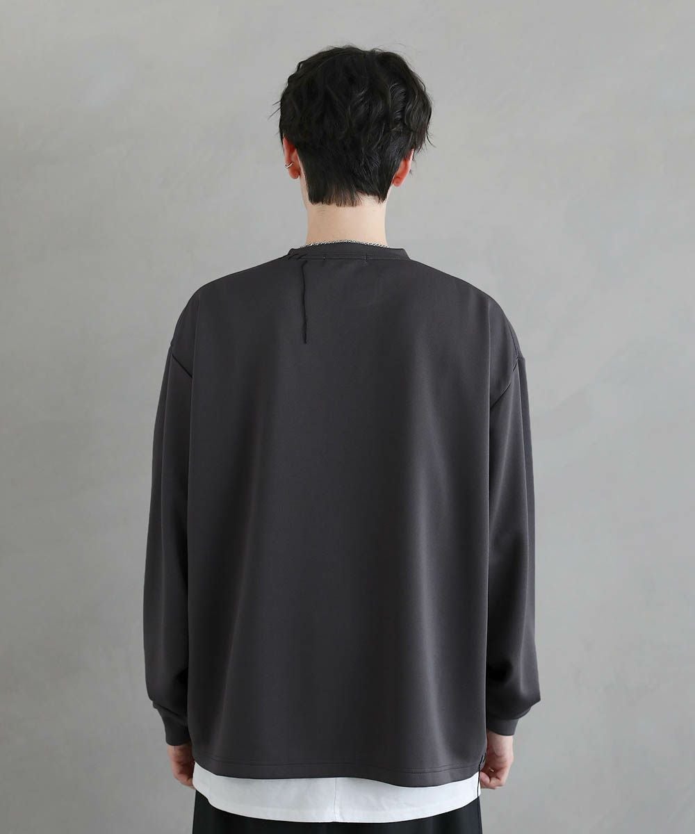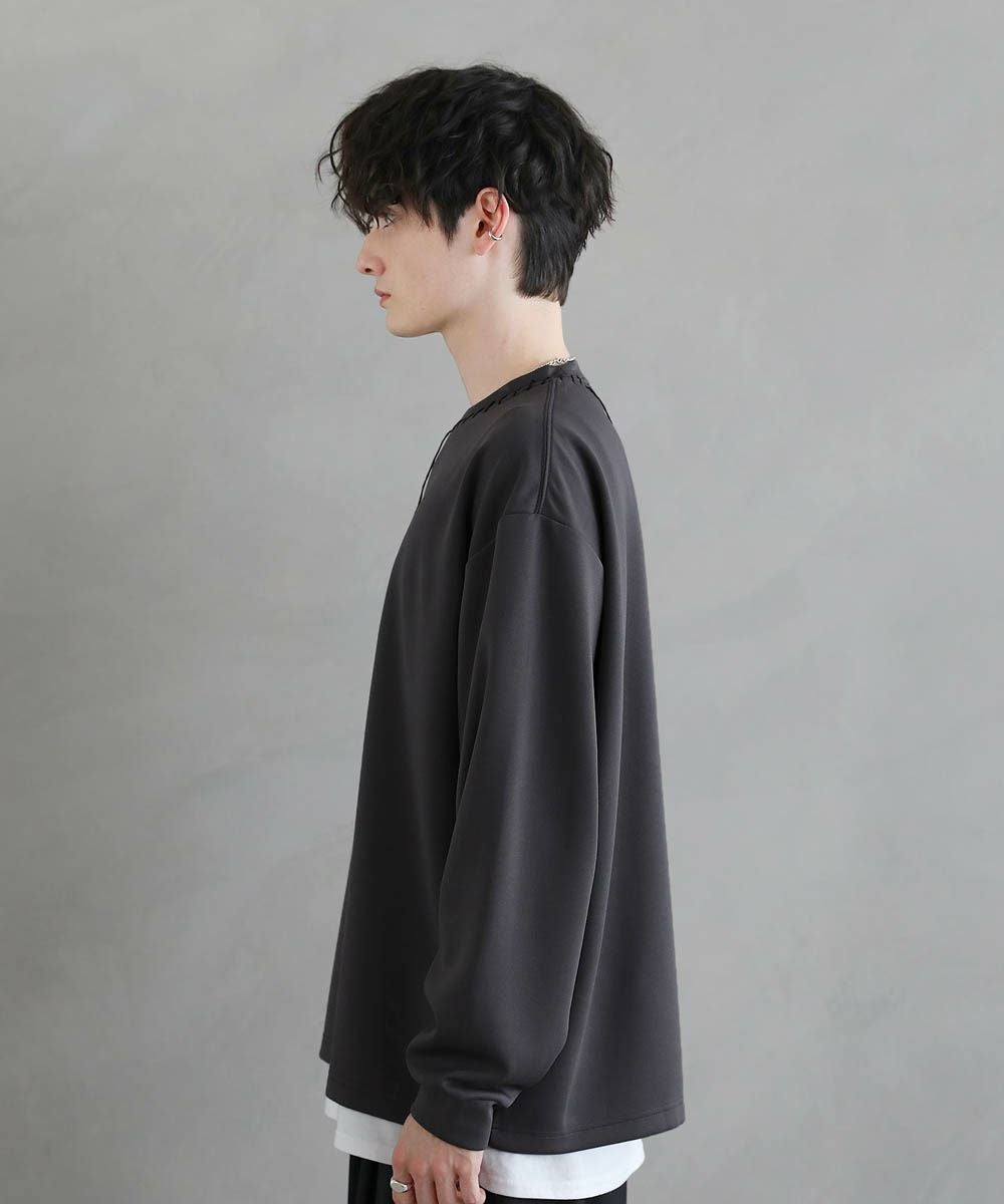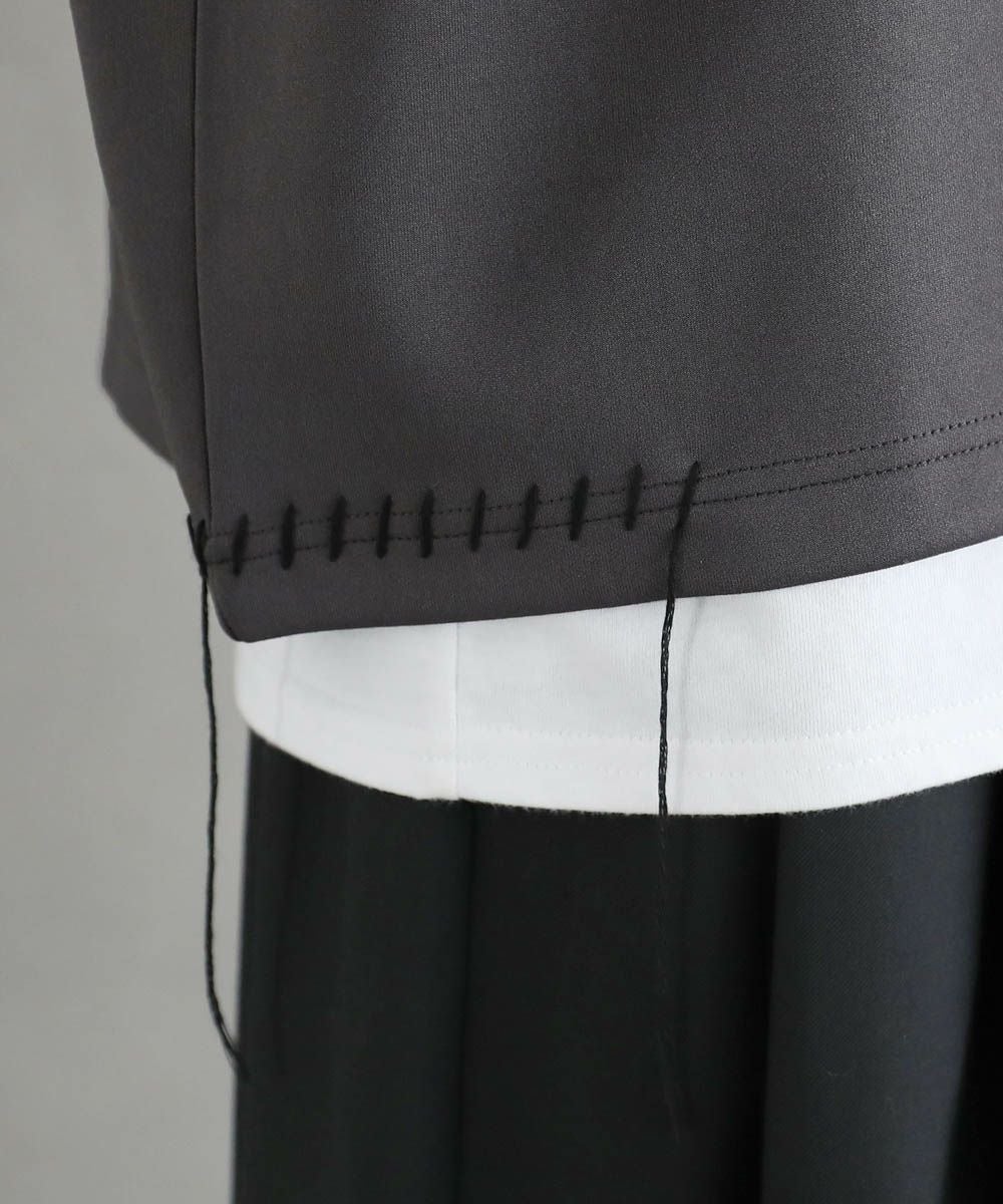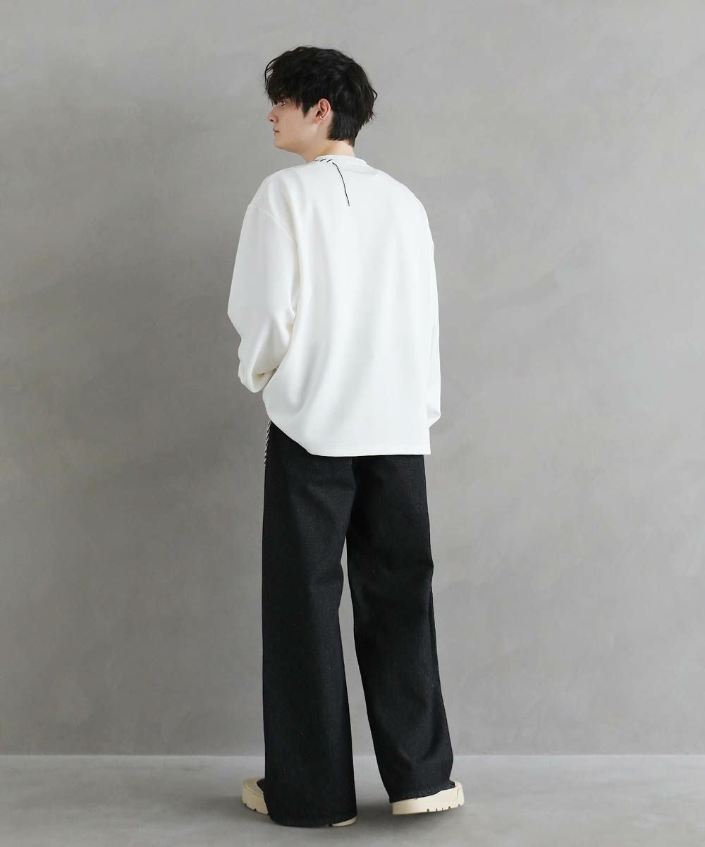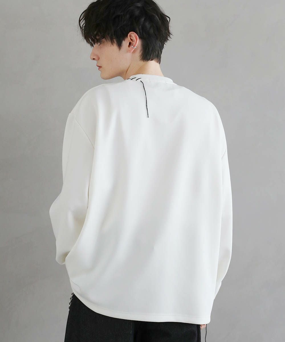 グラフィックプリントとステッチを装飾した、ポンチロンT。フロントにはボディのカラーごとに異なるプリントを配置しました。首元と右サイドにステッチを施し、どの角度から見ても動きのあるデザインに。デザイン性を加えつつ全体をモノトーンで統一したことで、お手持ちのワードローブに馴染みやすいアイテムに仕上げました。程よい光沢と艶のあるポンチ生地を使用し、カジュアルになりですすぎず雰囲気のあるスタイルに。マンネリしがちなコーデも簡単に決めてくれる頼れる1枚です。