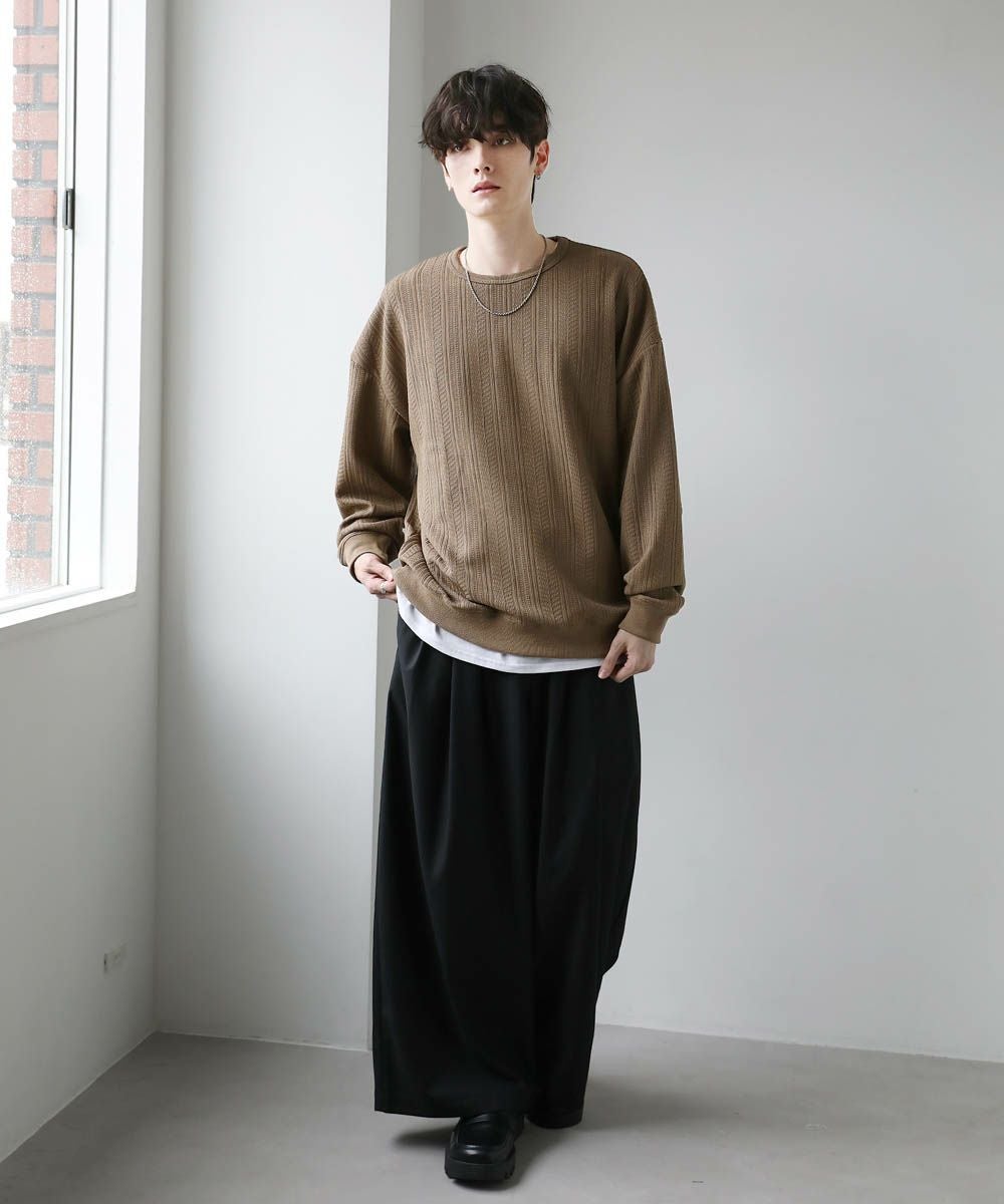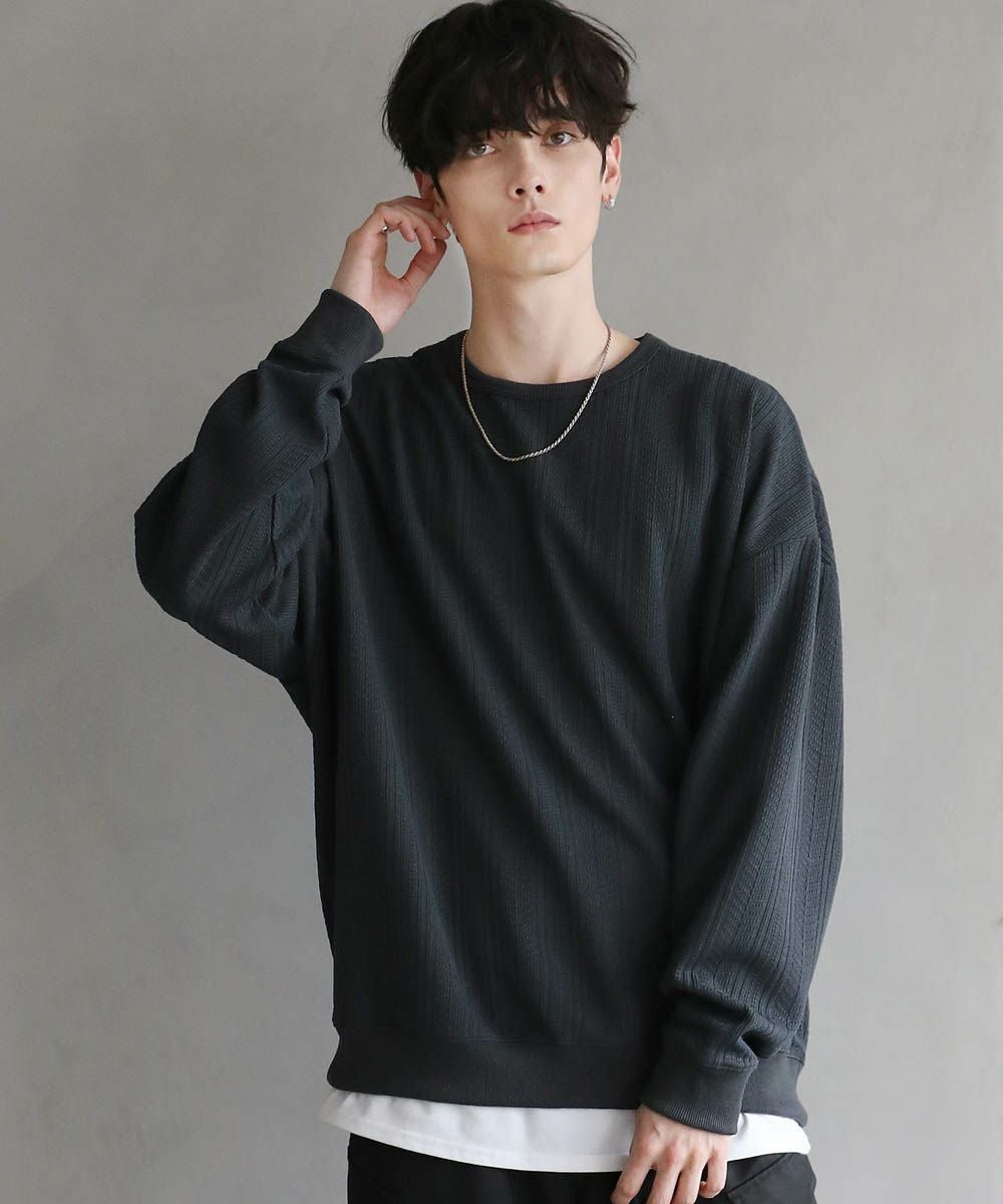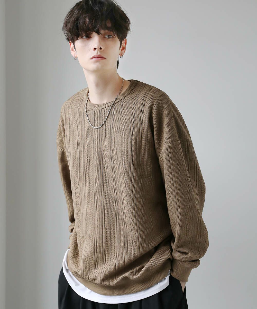 シンプルながらも表面に凹凸のあるデザインが特徴的なカットソーが登場。高級感のあるジャガード生地とキラキラ光るラメをちりばめたトレンド感ある生地の2パターンご用意。ゆとりのあるシルエットとにドルマンスリーブ仕様で、ストレスフリーな着心地です。首元はシンプルなクルーネックタイプでお手持ちのアクセサリーと合わせやすいデザイン。定番のブラックとアイボリー、クリーンな色合いのチャコール、柔らかな雰囲気のブラウンにくわえ、ラメを施したブラック系の5色展開です。1枚で着映える今期のおすすめアイテムです。