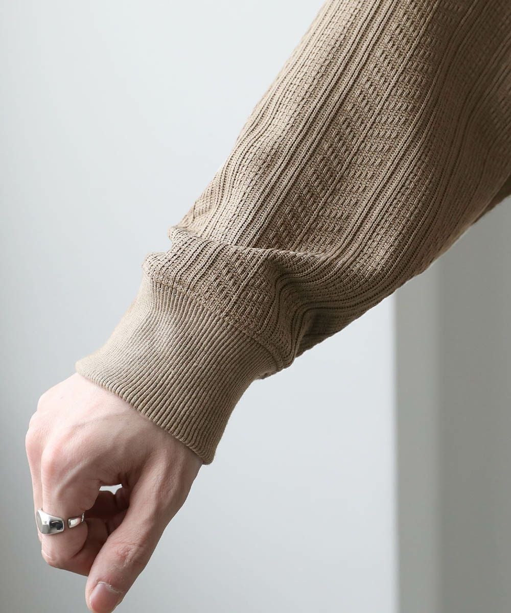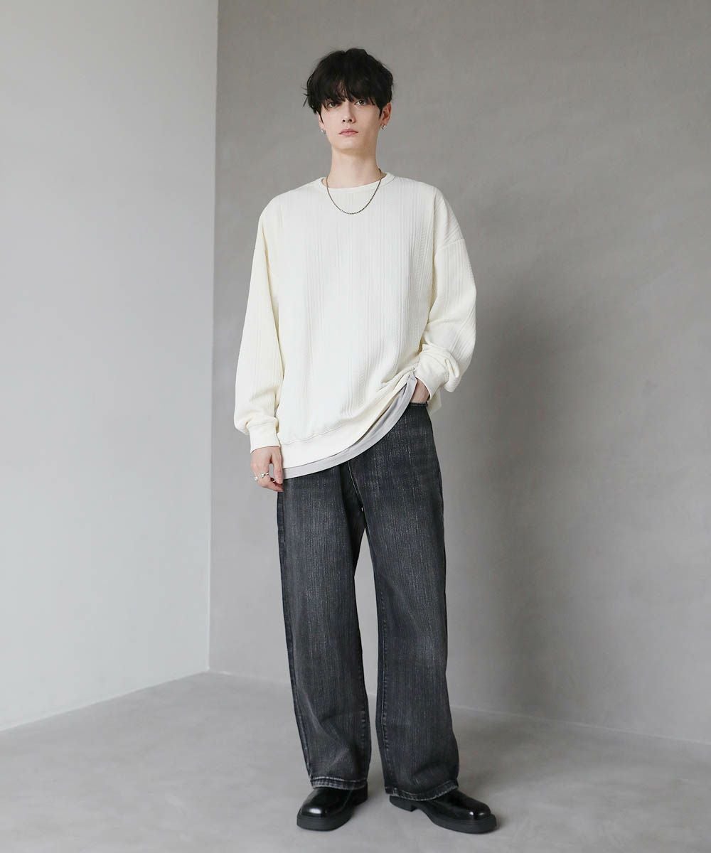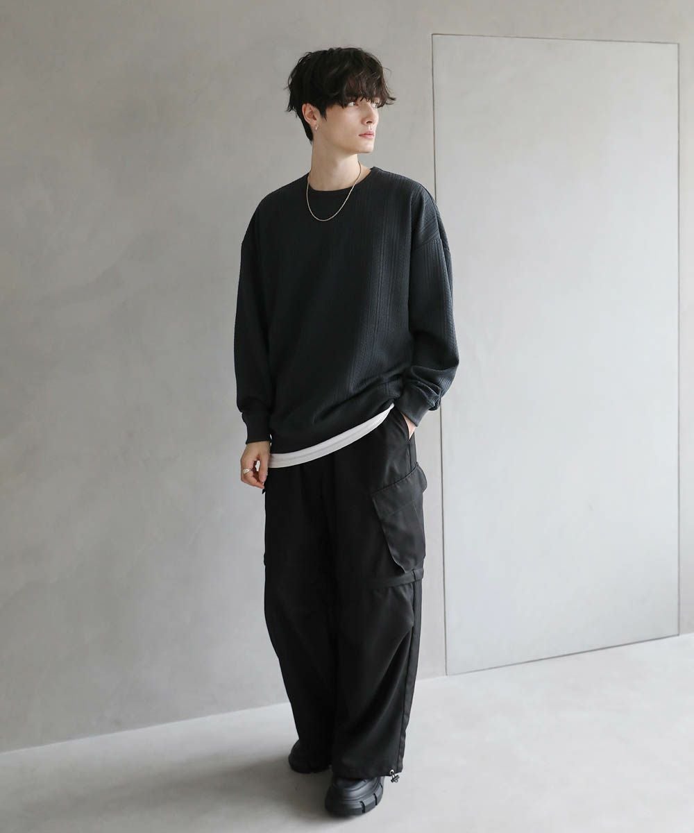 シンプルながらも表面に凹凸のあるデザインが特徴的なカットソーが登場。高級感のあるジャガード生地とキラキラ光るラメをちりばめたトレンド感ある生地の2パターンご用意。ゆとりのあるシルエットとにドルマンスリーブ仕様で、ストレスフリーな着心地です。首元はシンプルなクルーネックタイプでお手持ちのアクセサリーと合わせやすいデザイン。定番のブラックとアイボリー、クリーンな色合いのチャコール、柔らかな雰囲気のブラウンにくわえ、ラメを施したブラック系の5色展開です。1枚で着映える今期のおすすめアイテムです。