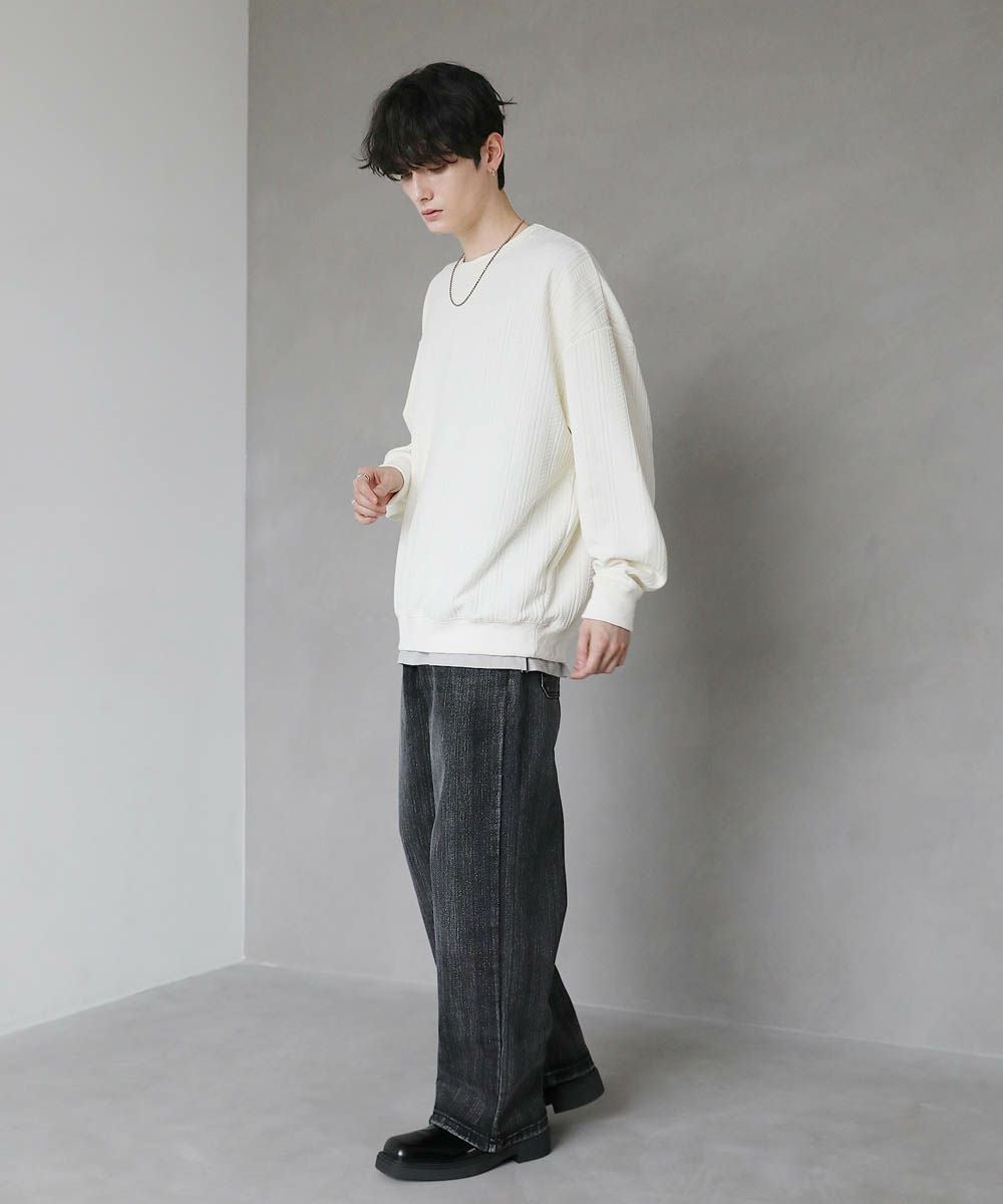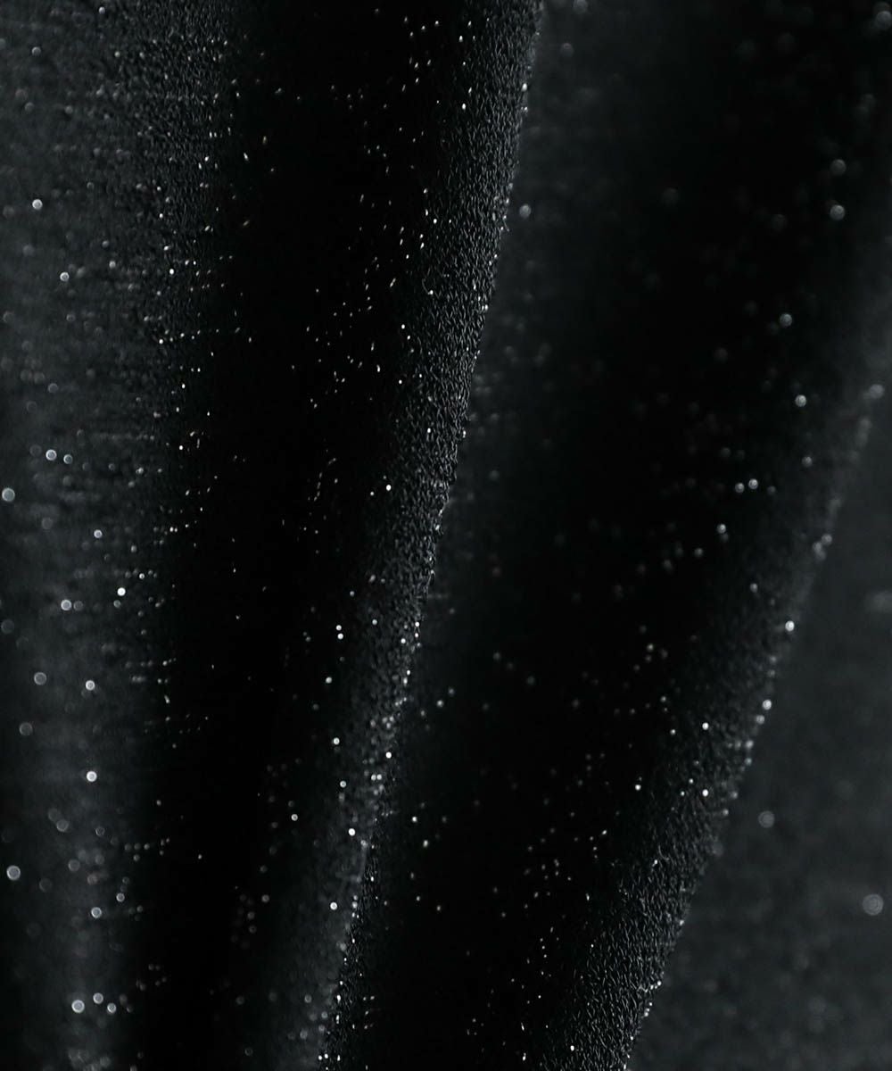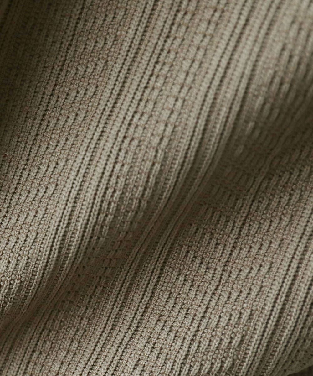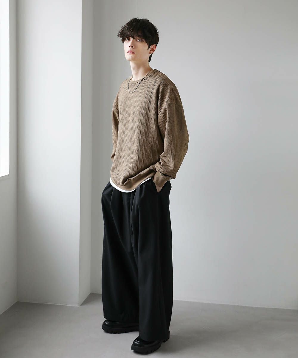 着回しのしやすいシンプルなデザインで、ジャガードの立体感やラメの光沢感が一味違うスタイルに魅せてくれます。ワイドめのボトムを合わせたリラックス感のある着こなしがおすすめです。