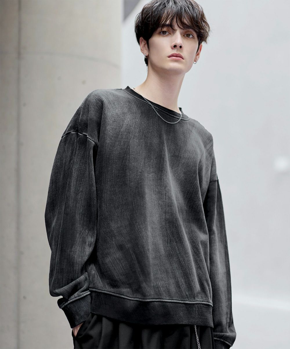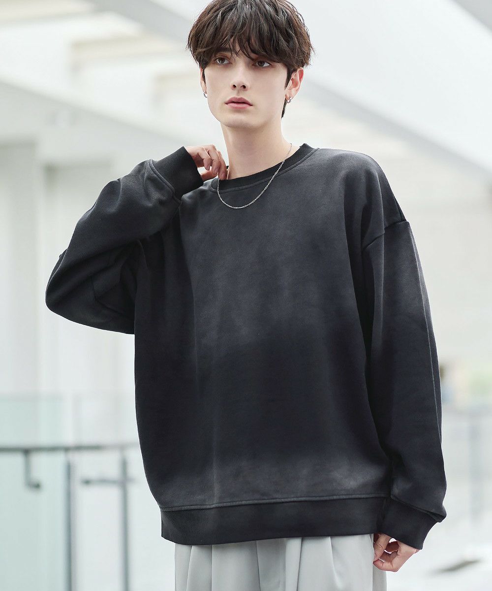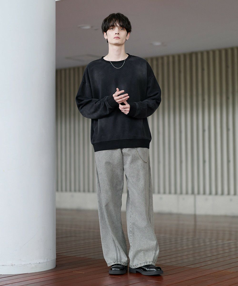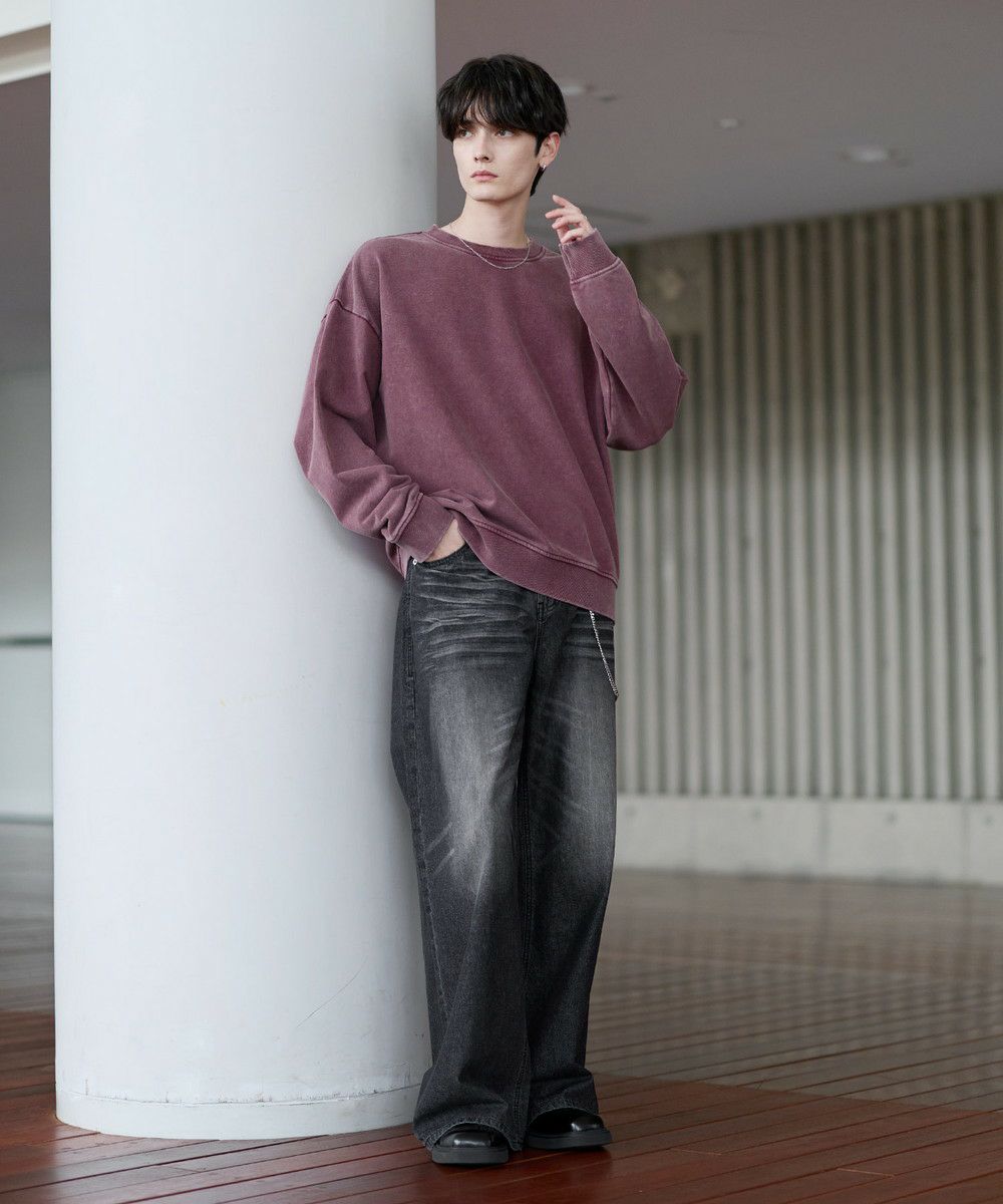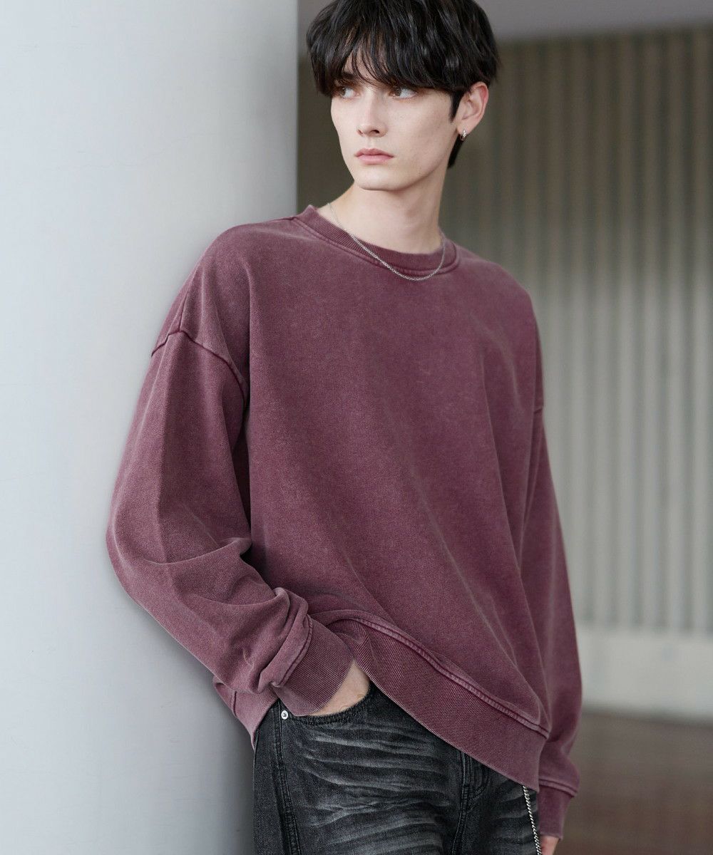 雰囲気のあるピグメント加工が主役感のあるクルースウェット。ワイド、バギーパンツなどボリュームのあるボトムやデニムパンツなどと合わせたスタイリングがおすすめです。