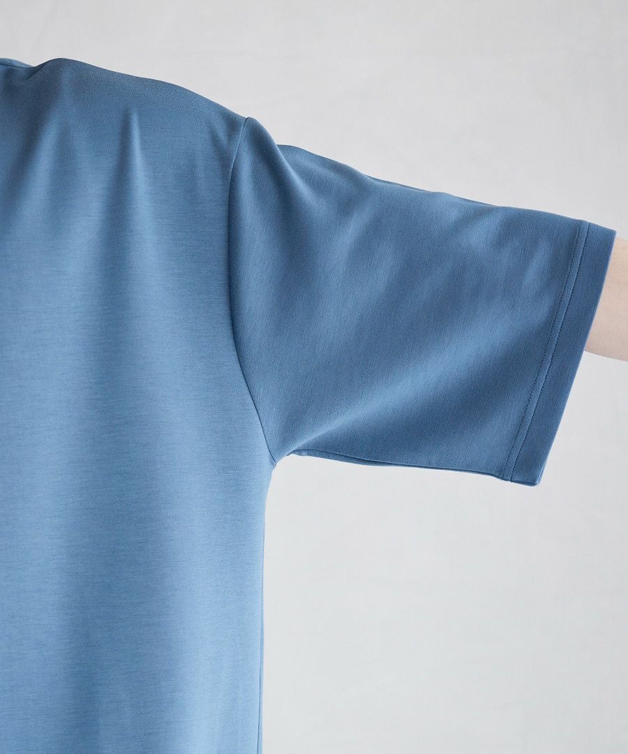 滑らかな質感とハリのあるタッチが特徴のポンチ素材を使用。とろみがある生地が動くたびゆるやかに揺れ動き、キレイなドレープを生み出します。肌に触れると冷たく感じる接触冷感機能付きで、暑さからのストレスを感じにくくしてくれるのも嬉しいポイント。汗ばむ季節のデイリーウェアとして気兼ねなくご着用いただけます。