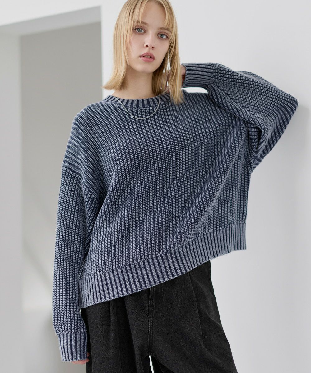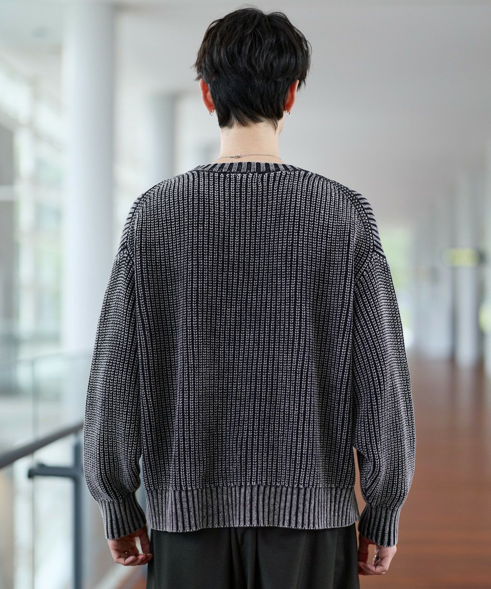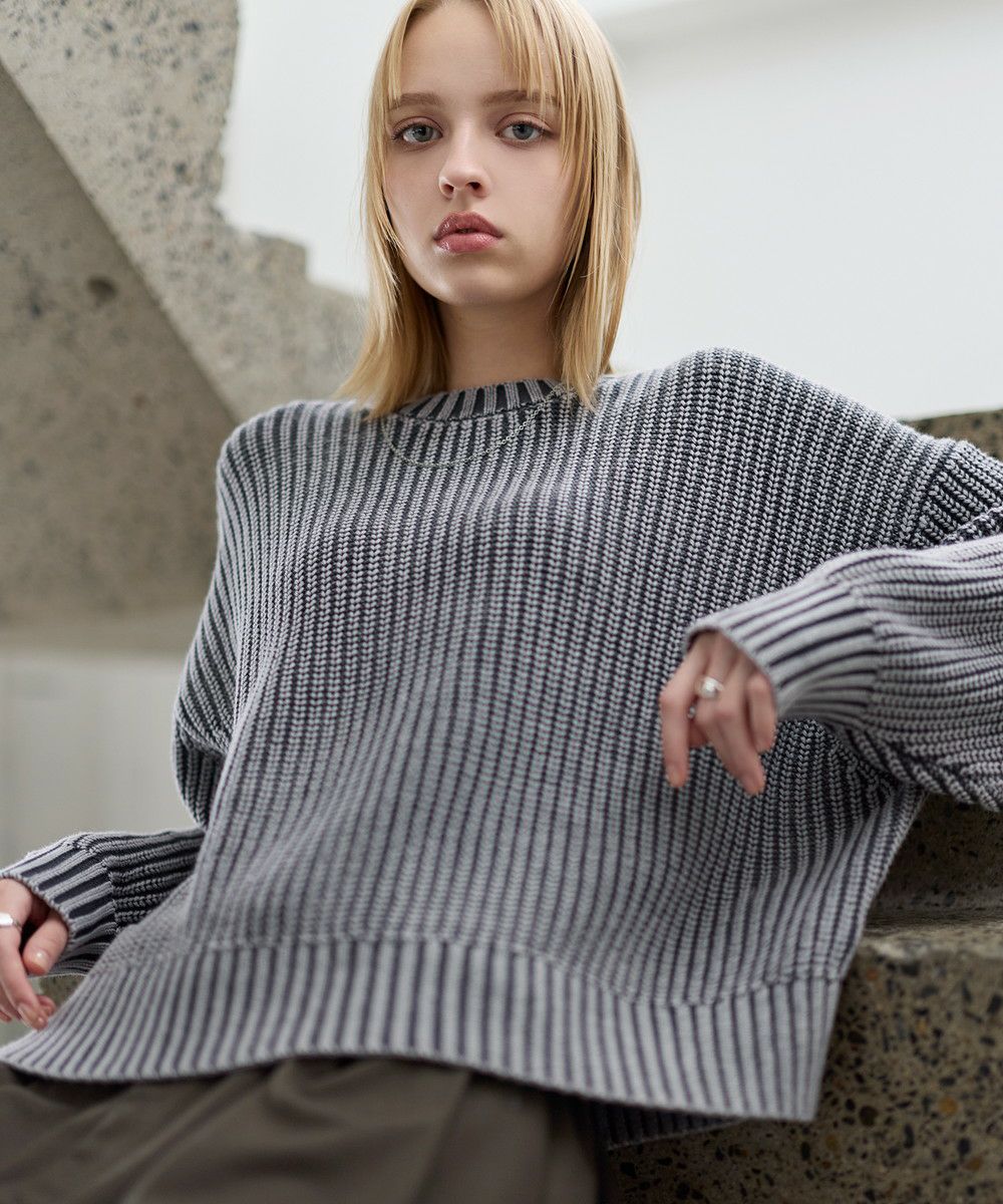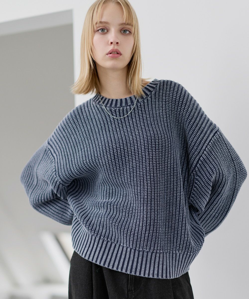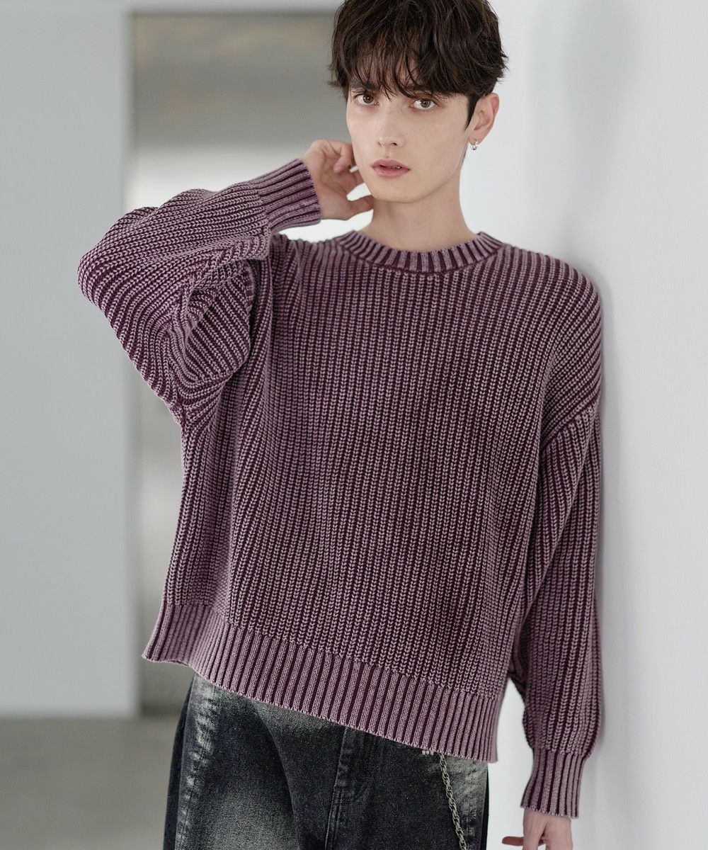 ピグメント加工がヴィンテージ感を醸す畦編みニット。ゆったりとした身幅とドロップショルダーがこなれた印象を生み出します。シンプルなクルーネックデザインでクセが無く、様々なアイテムと合わせて着用可能。着丈を短めに設定し、トレンドライクなシルエットに仕上げました。カラーは落ち着いたくすみカラーのブラック、グレー、ブルー、ワインの4色展開。表情のある生地感のため、1枚でもお洒落に着こなしていただけます。
