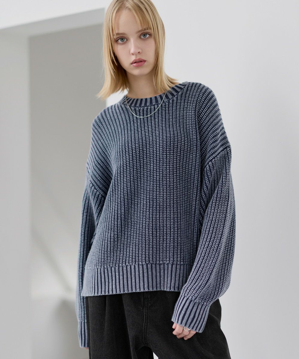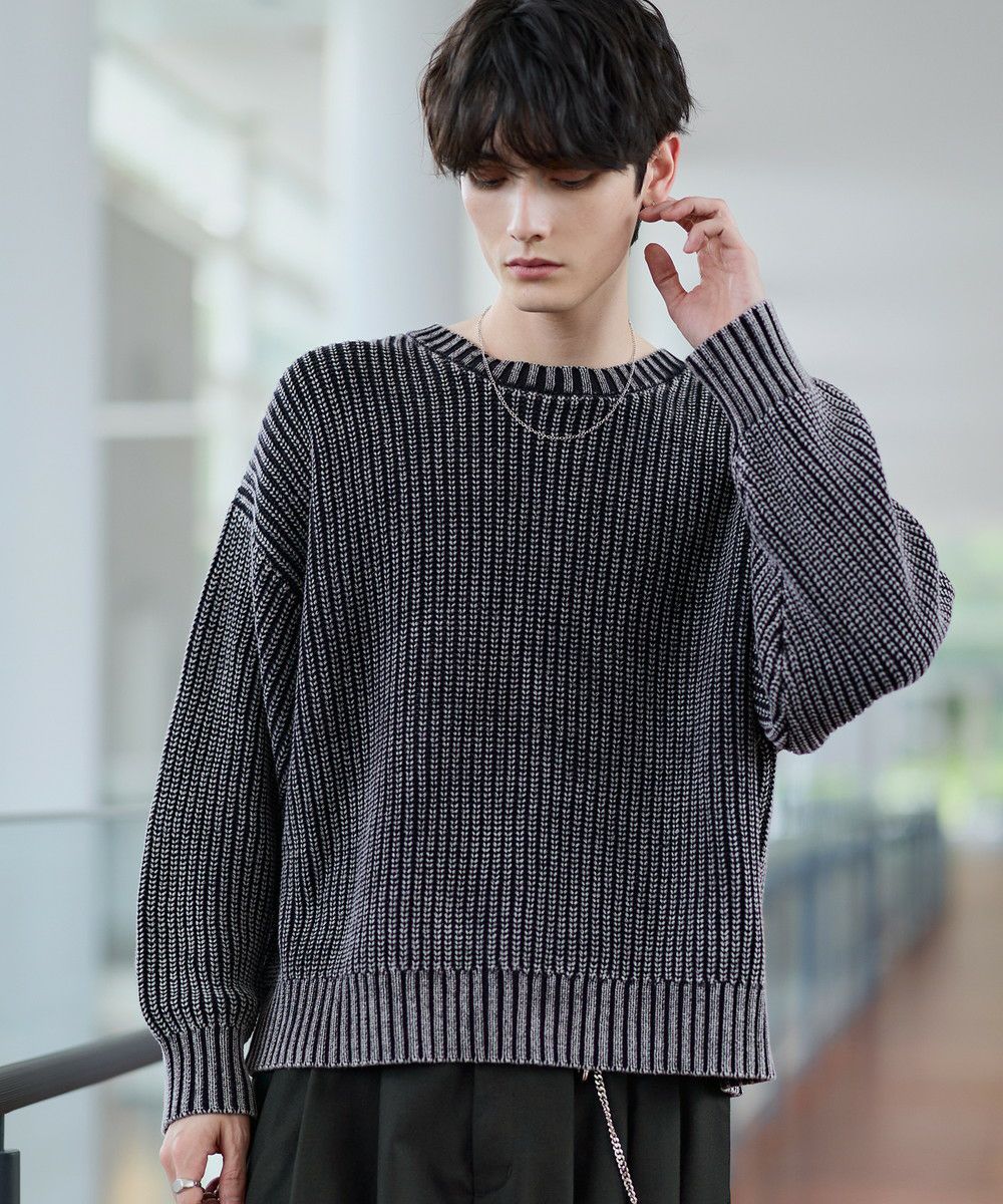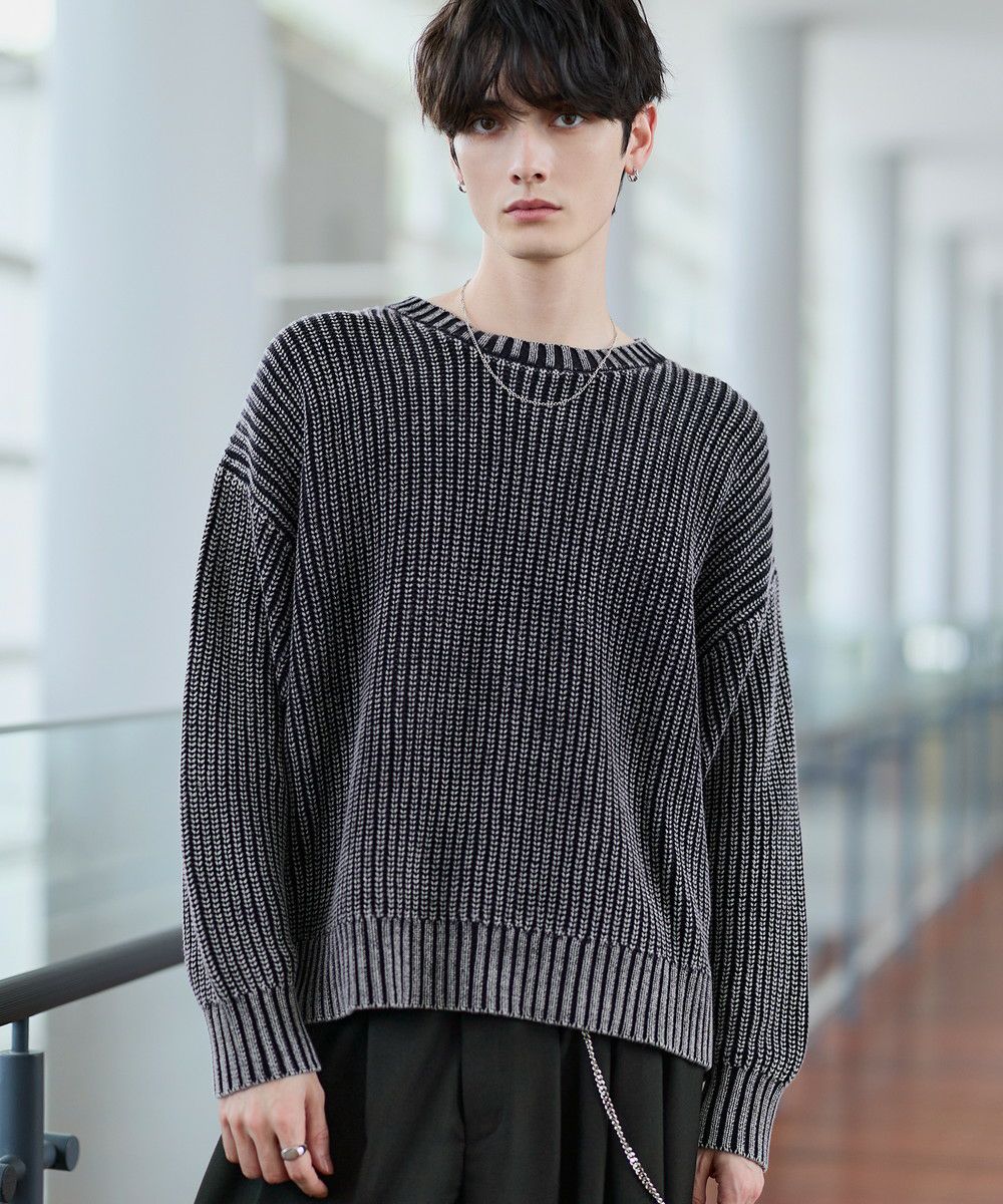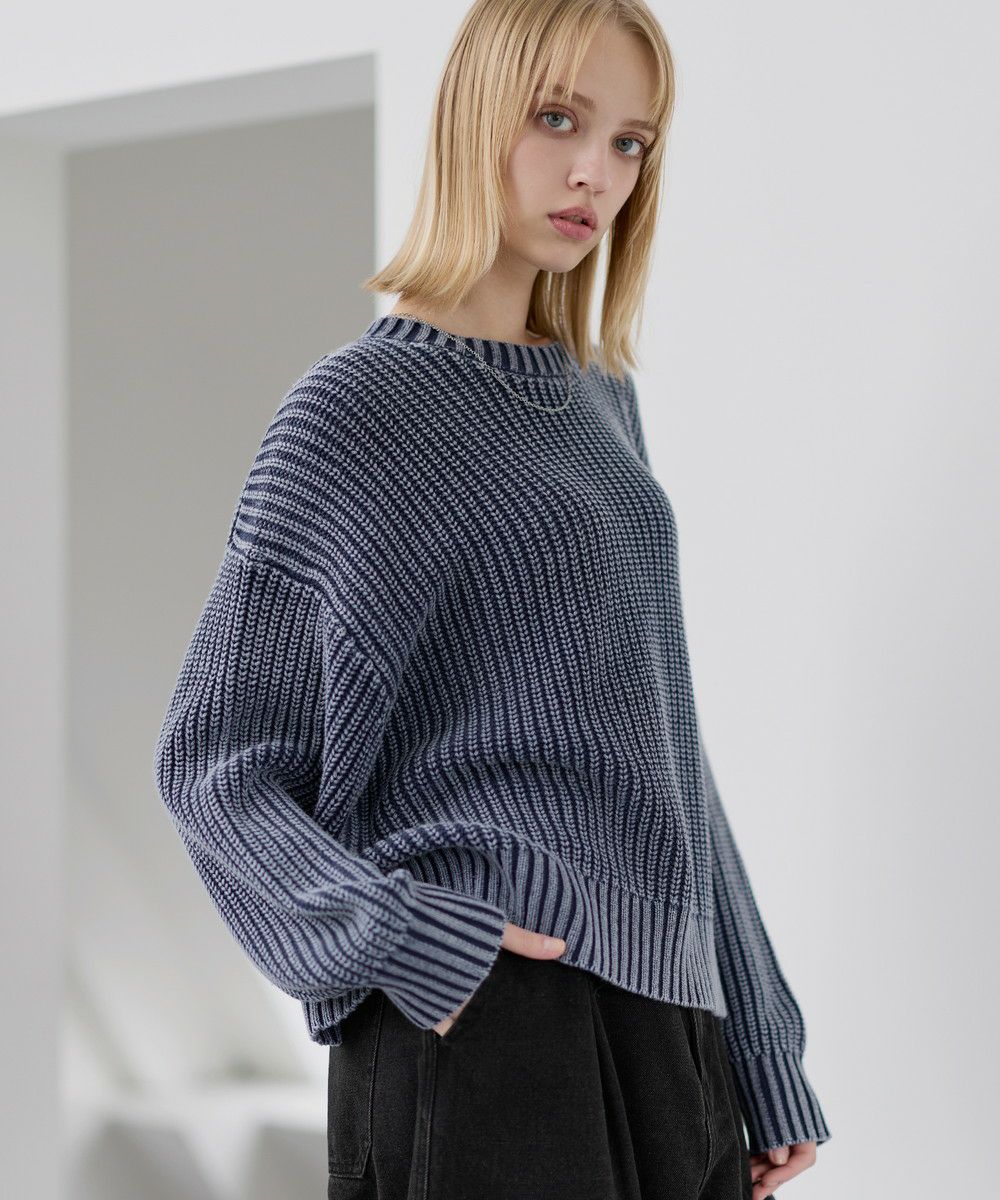 ピグメント加工がヴィンテージ感を醸す畦編みニット。ゆったりとした身幅とドロップショルダーがこなれた印象を生み出します。シンプルなクルーネックデザインでクセが無く、様々なアイテムと合わせて着用可能。着丈を短めに設定し、トレンドライクなシルエットに仕上げました。カラーは落ち着いたくすみカラーのブラック、グレー、ブルー、ワインの4色展開。表情のある生地感のため、1枚でもお洒落に着こなしていただけます。