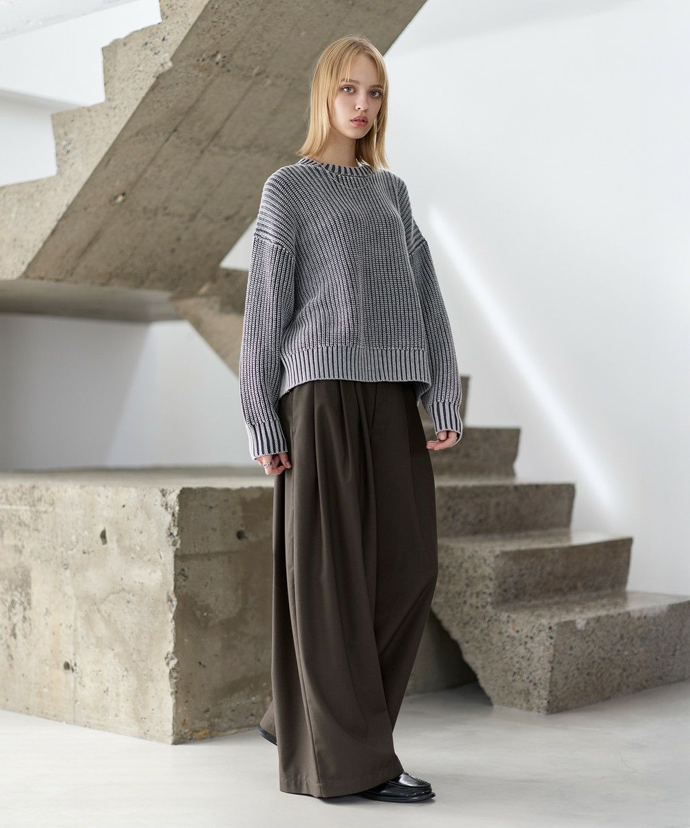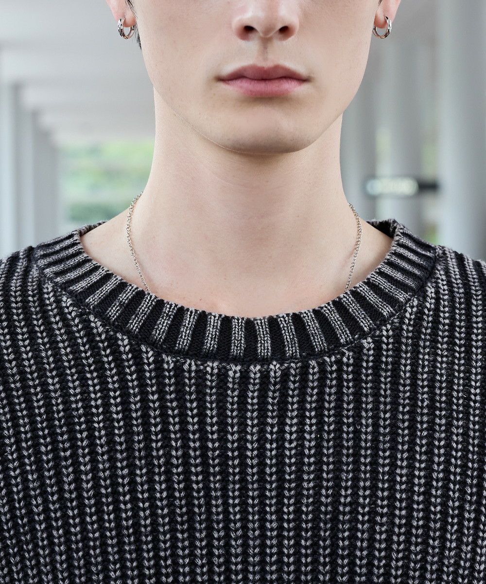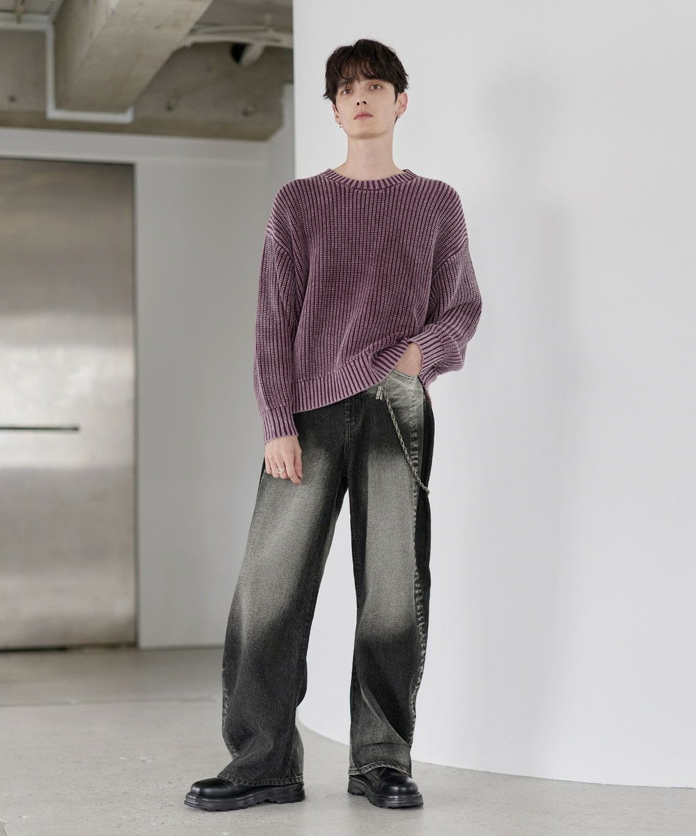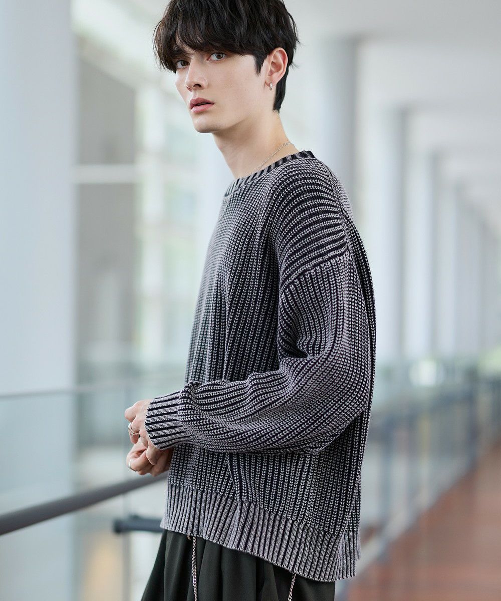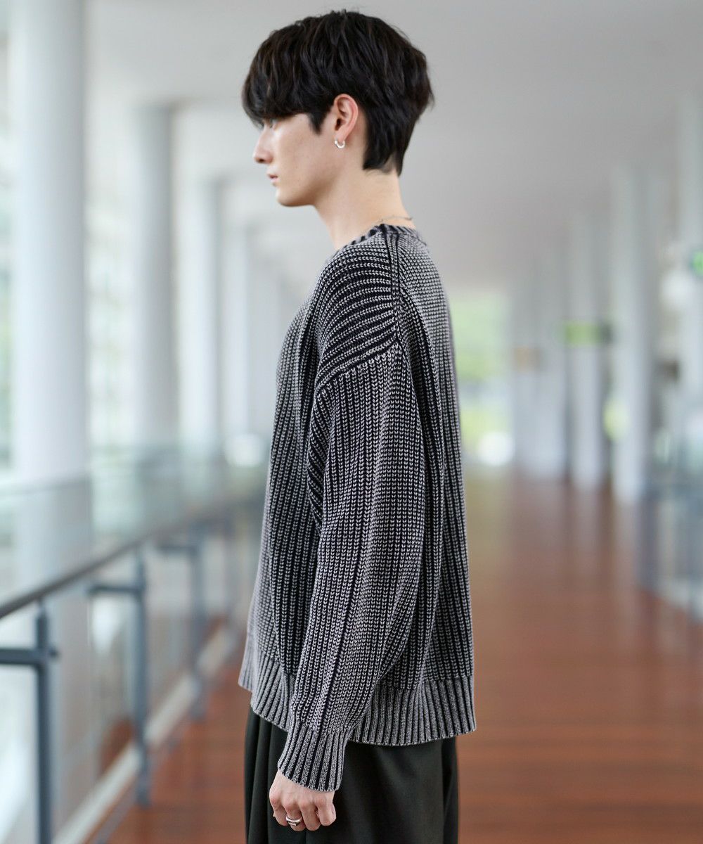 ピグメント加工がヴィンテージ感を醸す畦編みニット。ゆったりとした身幅とドロップショルダーがこなれた印象を生み出します。シンプルなクルーネックデザインでクセが無く、様々なアイテムと合わせて着用可能。着丈を短めに設定し、トレンドライクなシルエットに仕上げました。カラーは落ち着いたくすみカラーのブラック、グレー、ブルー、ワインの4色展開。表情のある生地感のため、1枚でもお洒落に着こなしていただけます。