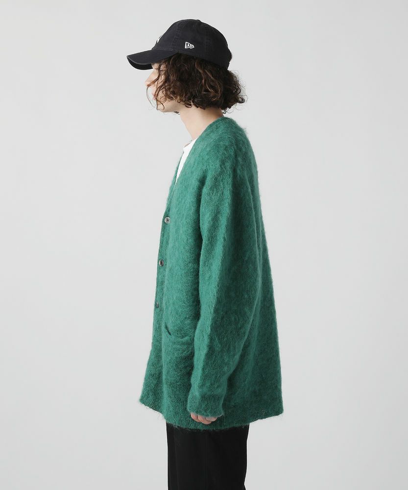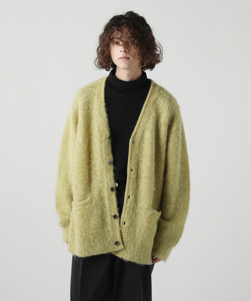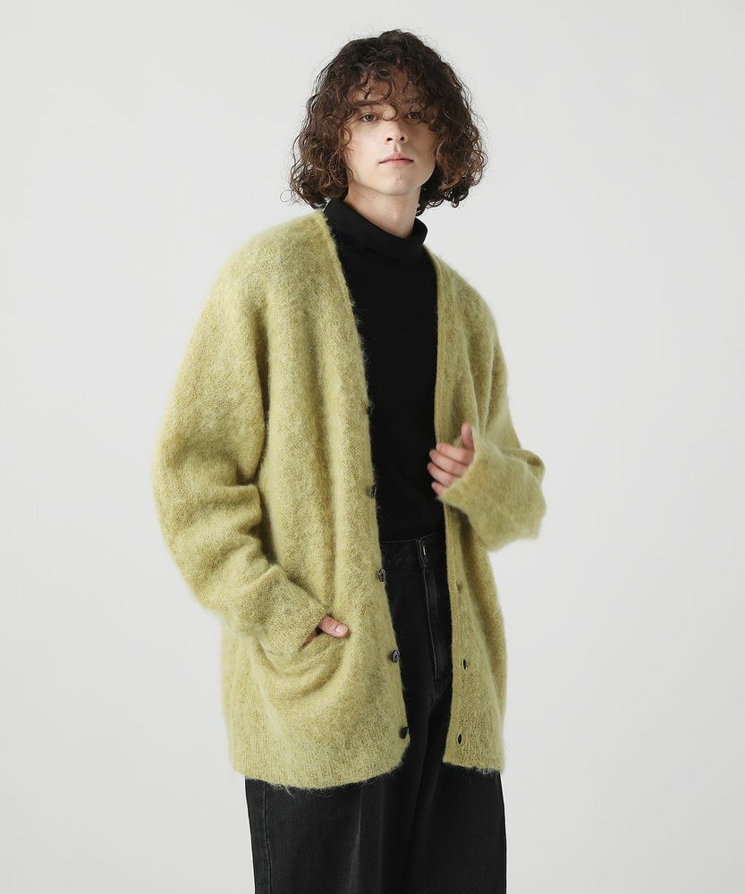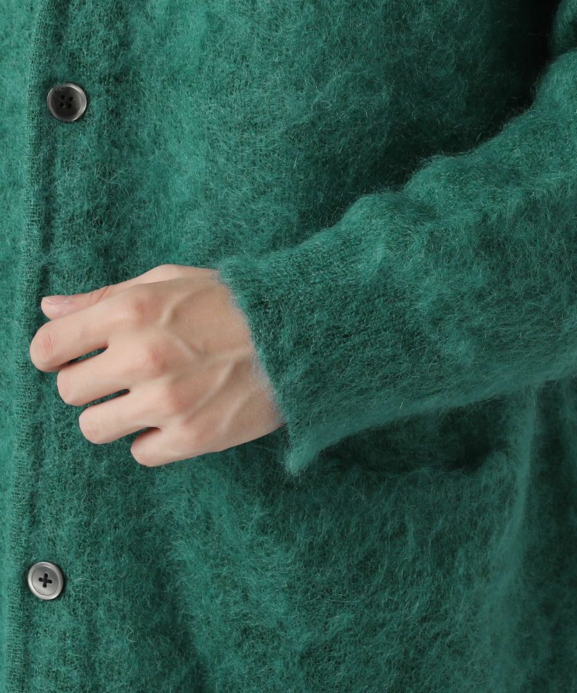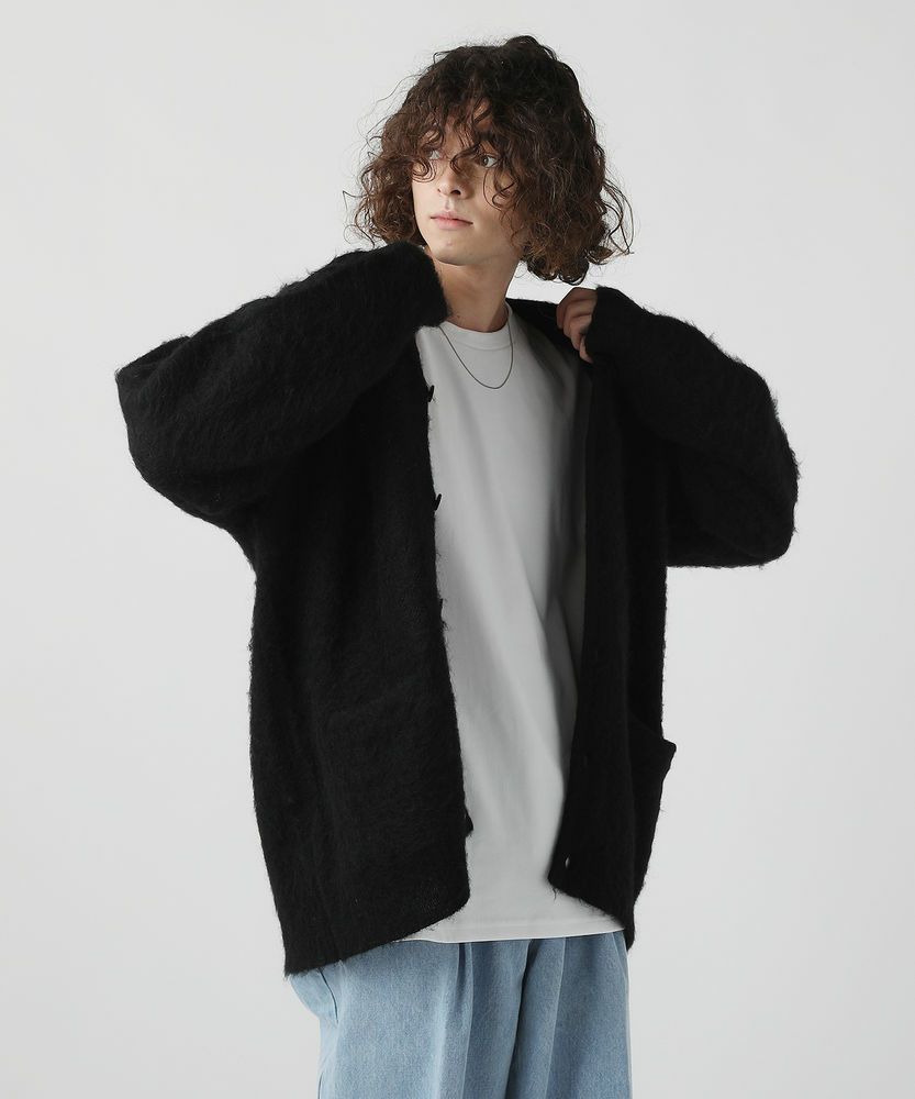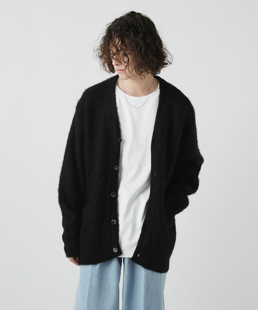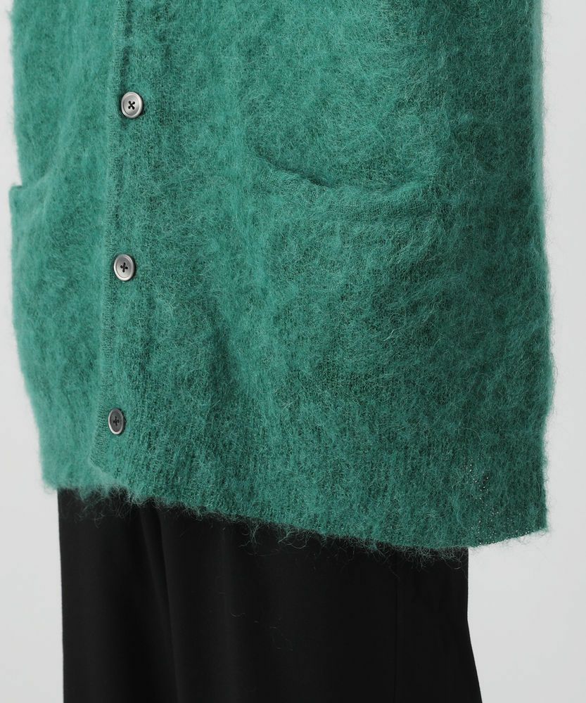 起毛掛かったふんわり柔らかな編地のカーディガン。見た目にも暖かみのあるニット地で、取り入れるだけで季節感が演出されます。素材にウールとモヘアを混紡しているため、保温性の高さも抜群。ゆとりのあるルーズなシルエットでライトアウターとしても重宝するアイテムです。