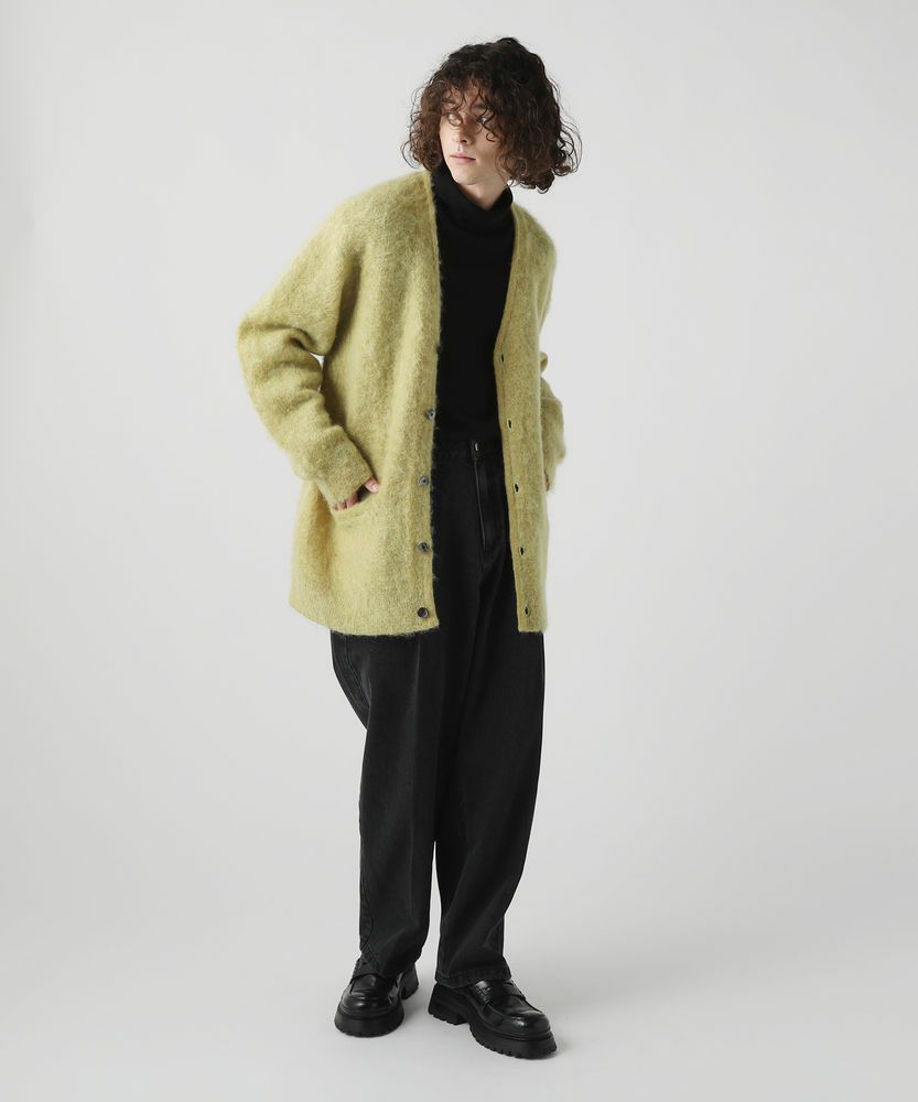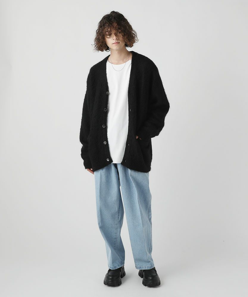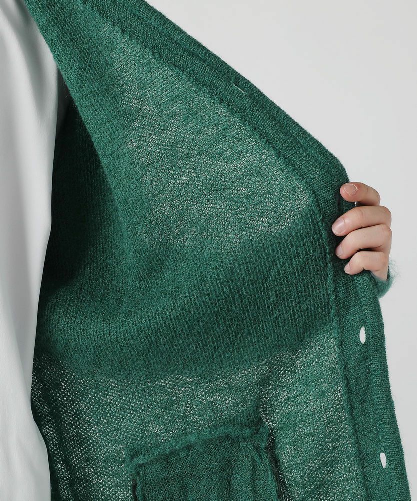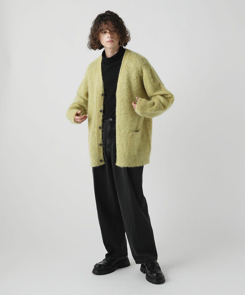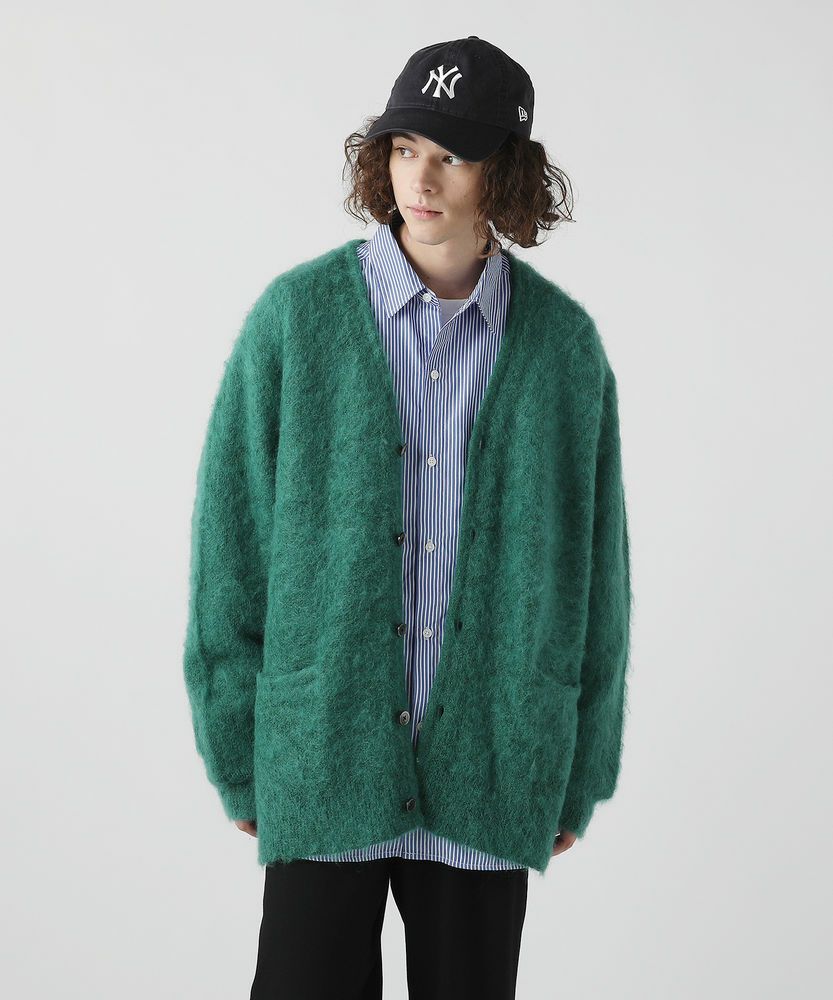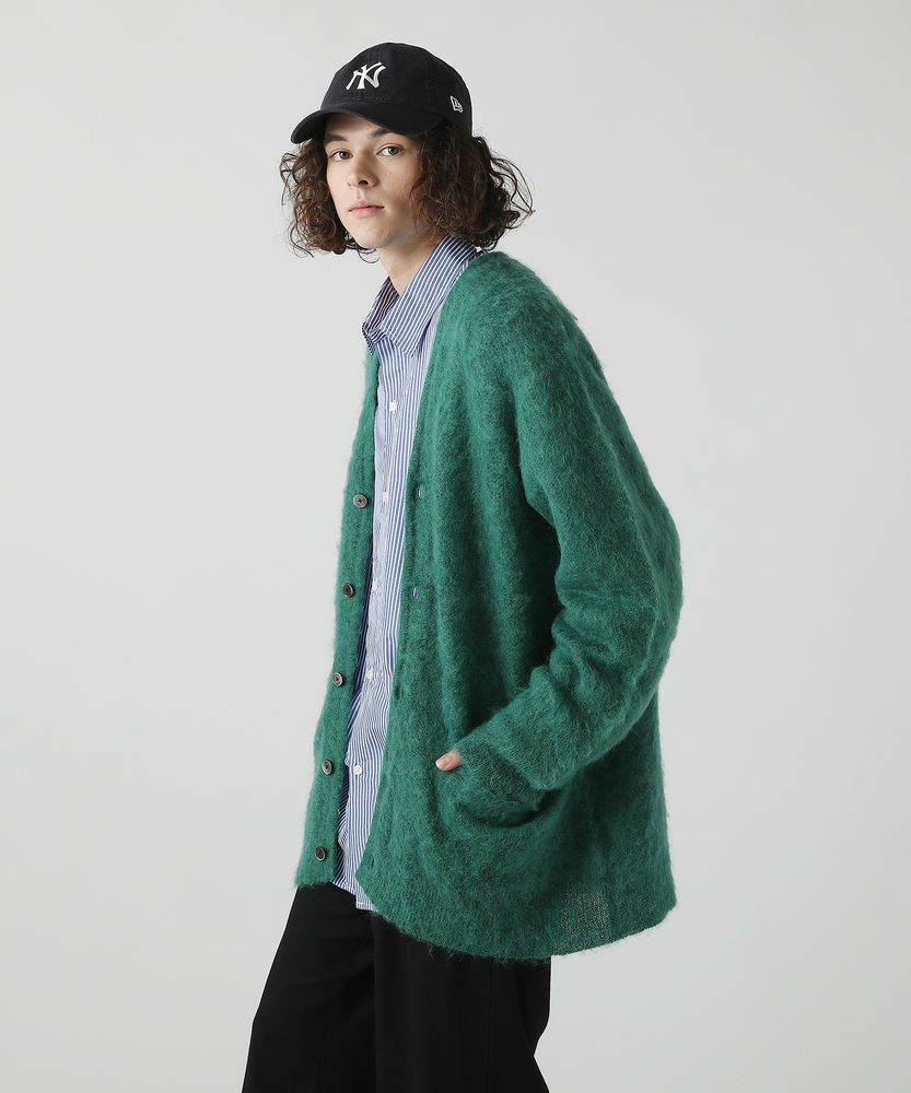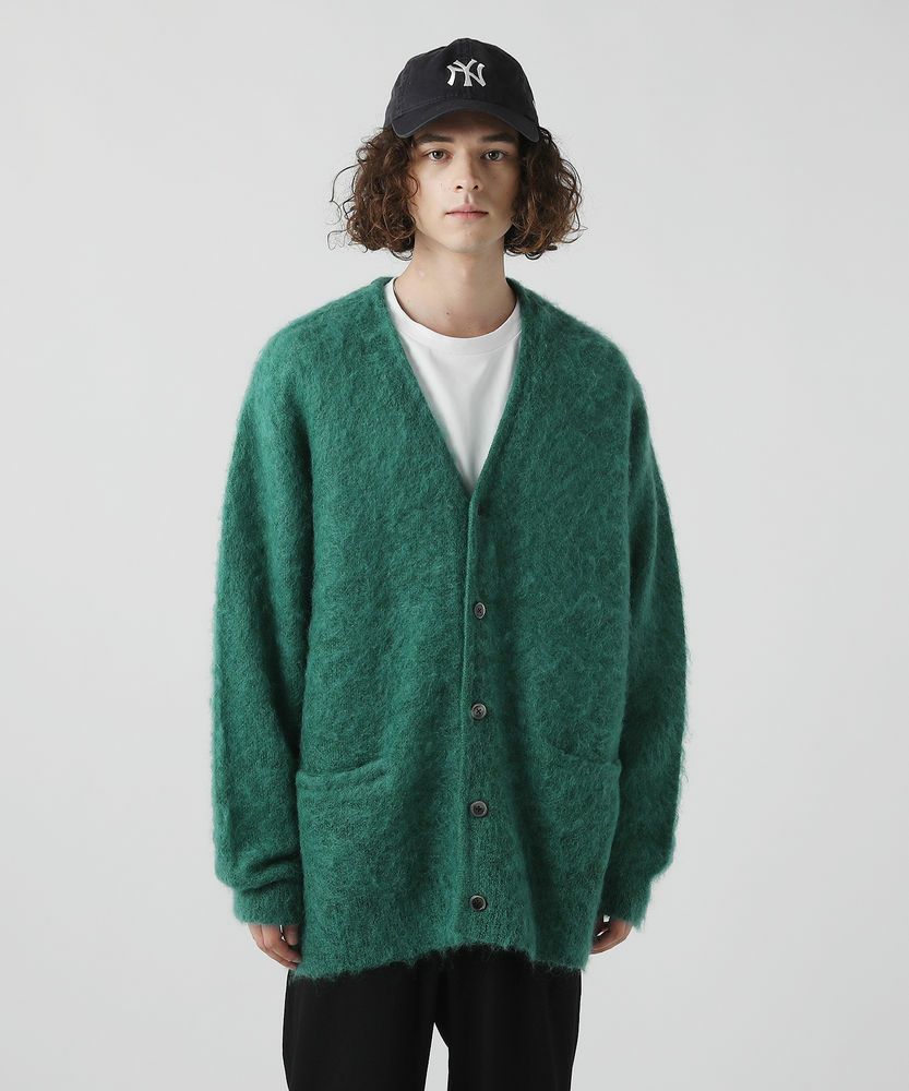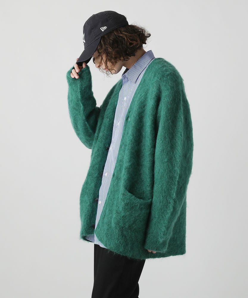 起毛掛かったふんわり柔らかな編地のカーディガン。見た目にも暖かみのあるニット地で、取り入れるだけで季節感が演出されます。素材にウールとモヘアを混紡しているため、保温性の高さも抜群。ゆとりのあるルーズなシルエットでライトアウターとしても重宝するアイテムです。