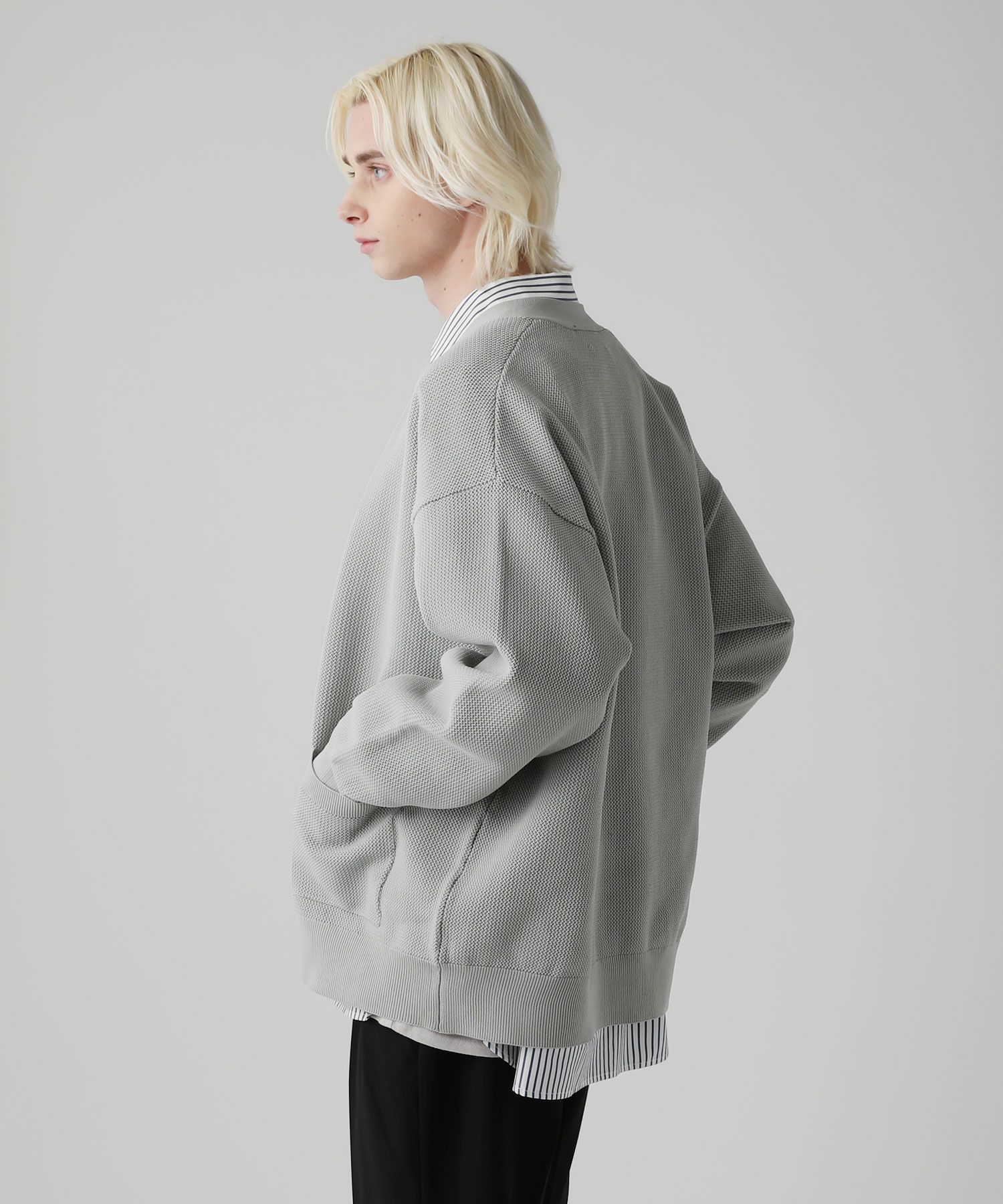 リサイクルのポリエステル糸を使用し、ざっくりとしたメッシュパターンで編みたてたルーズカーディガン。軽くてシワになりにくく適度なハリ感としっかりとした厚みのある素材で、春先のアウターとしてもご着用いただけます。