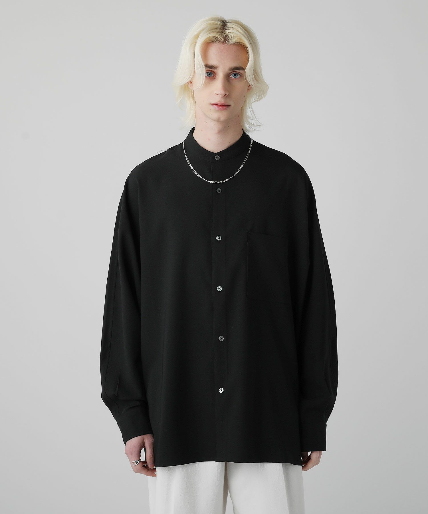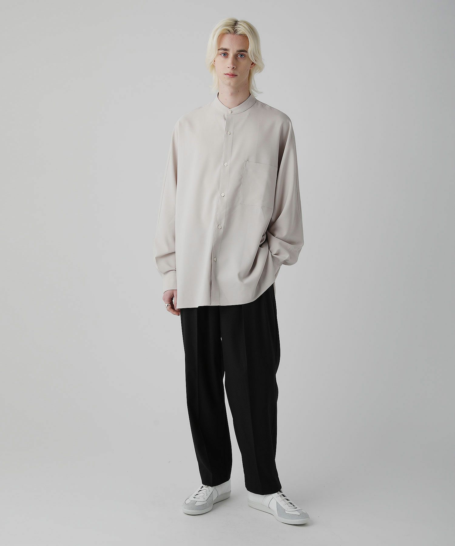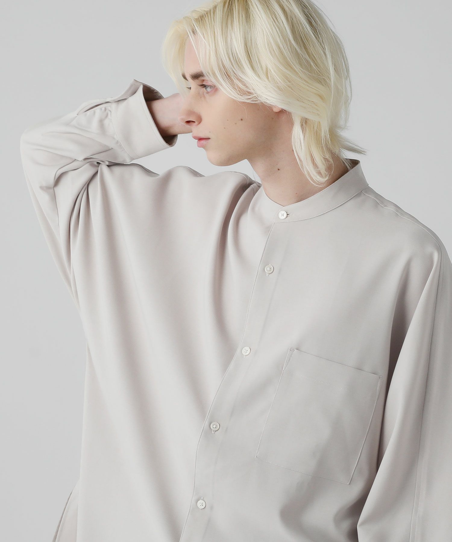 麻のようなナチュラル感とドライな風合いのリネンライクファブリックを使用したドルマンスリーブシャツ。ネック部分はバンドカラーを採用しクラシカルな印象をプラス。リラックス感のある上品なシャツはスラックスなどキレイめなボトムとのスタイリングがおすすめです。