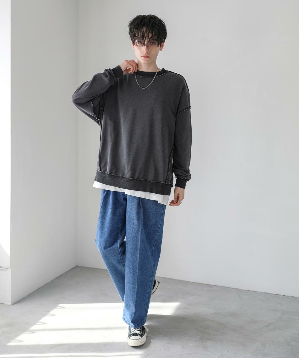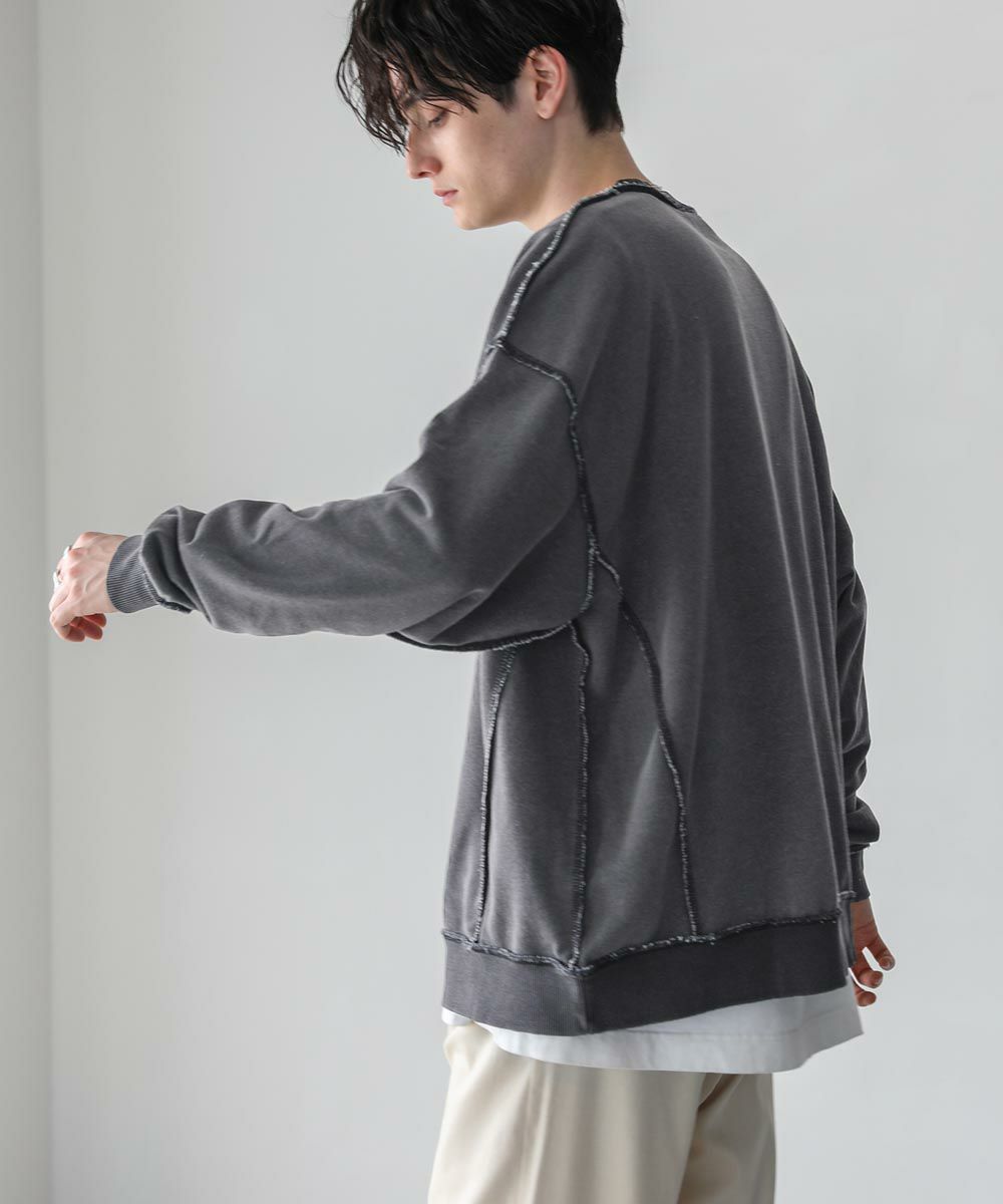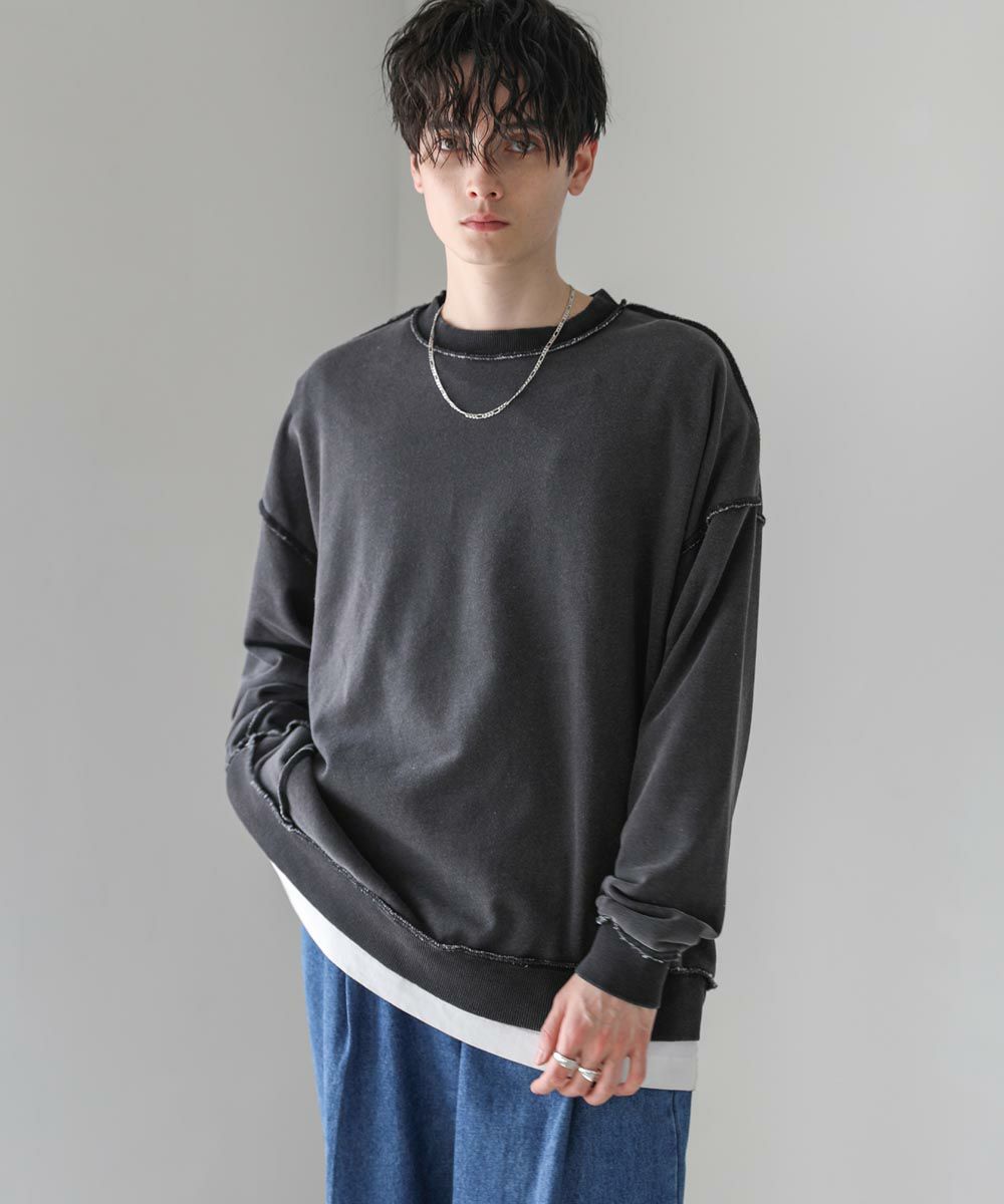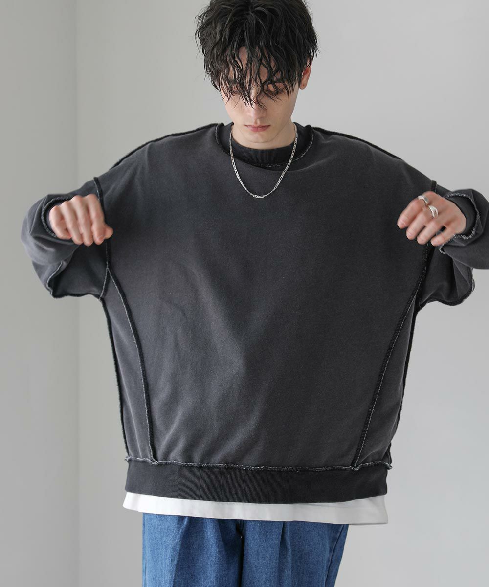 配色ステッチがアクセントになったスウェットプルオーバー。シンプルながらデザイン性のあるスウェットは春や秋に一枚でさらっと着ても着こなしが決まります。ヴィンテージアイテムのような風合いのインディゴ染を施した雰囲気抜群の一枚。ドロップショルダーにゆるっとしたルーズなシルエットがリラックス感のあるアイテムです。裏毛スウェットはサラッとした肌触りと軽い着心地で、カットソー感覚でロングシーズン着用が可能。