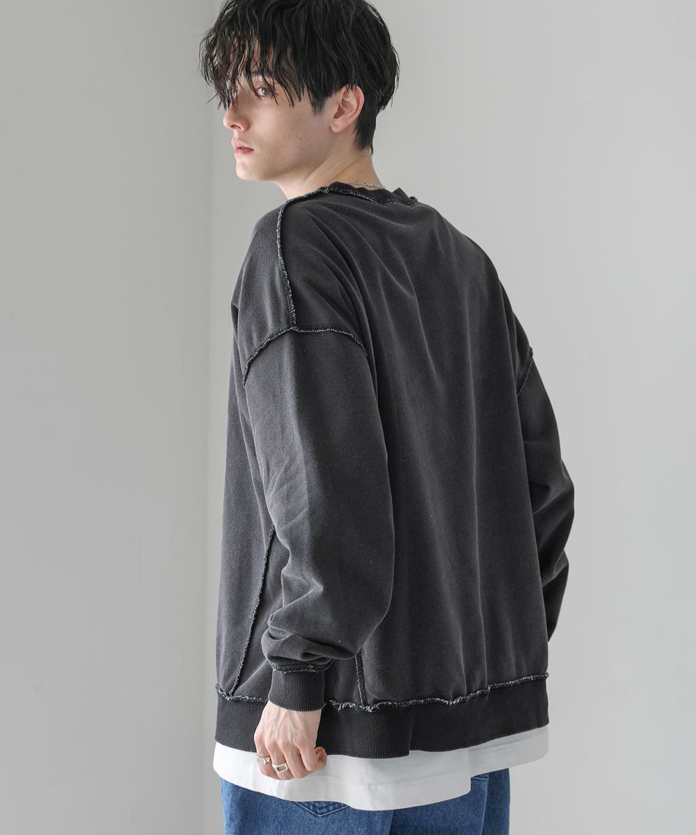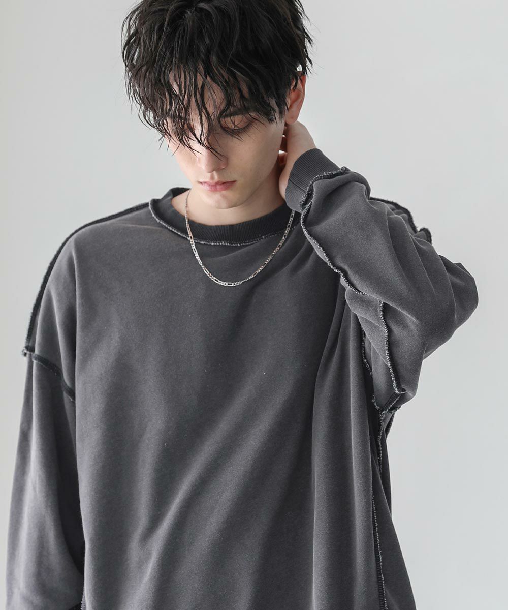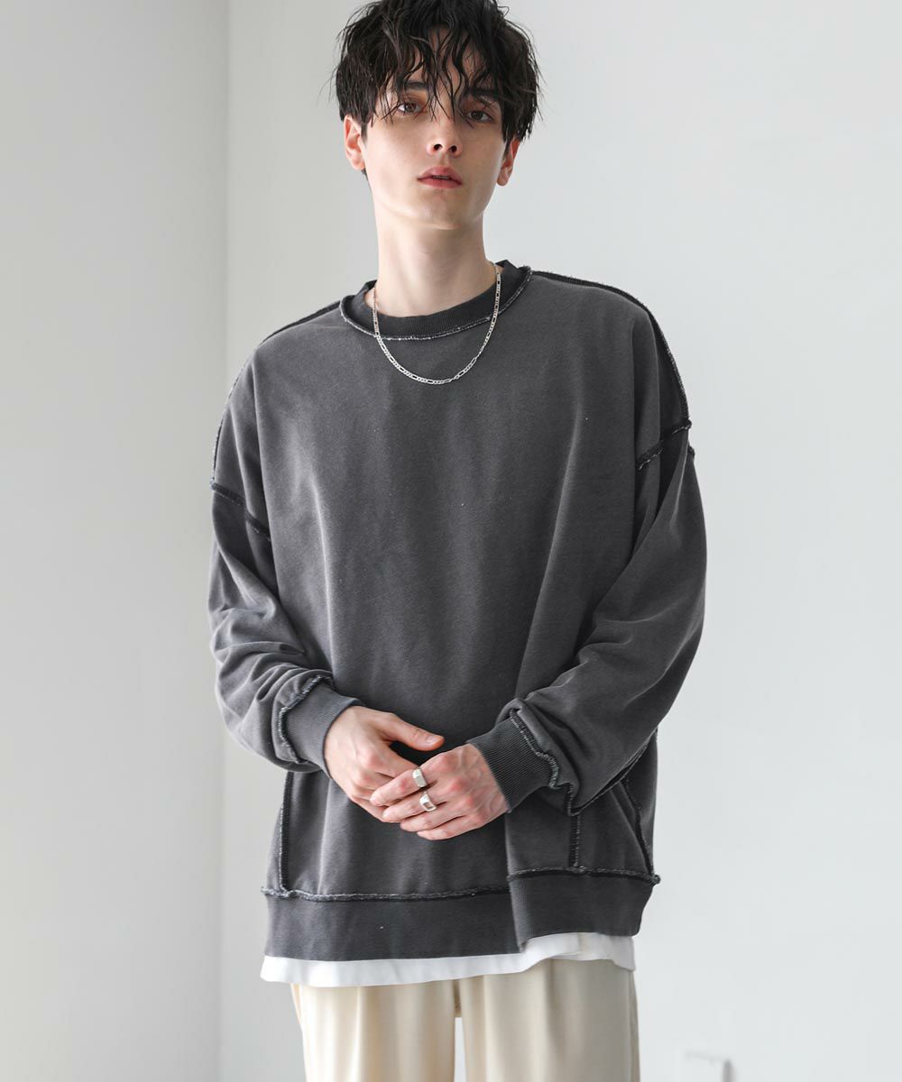 配色ステッチがアクセントになったスウェットプルオーバー。シンプルながらデザイン性のあるスウェットは春や秋に一枚でさらっと着ても着こなしが決まります。ヴィンテージアイテムのような風合いのインディゴ染を施した雰囲気抜群の一枚。ドロップショルダーにゆるっとしたルーズなシルエットがリラックス感のあるアイテムです。裏毛スウェットはサラッとした肌触りと軽い着心地で、カットソー感覚でロングシーズン着用が可能。