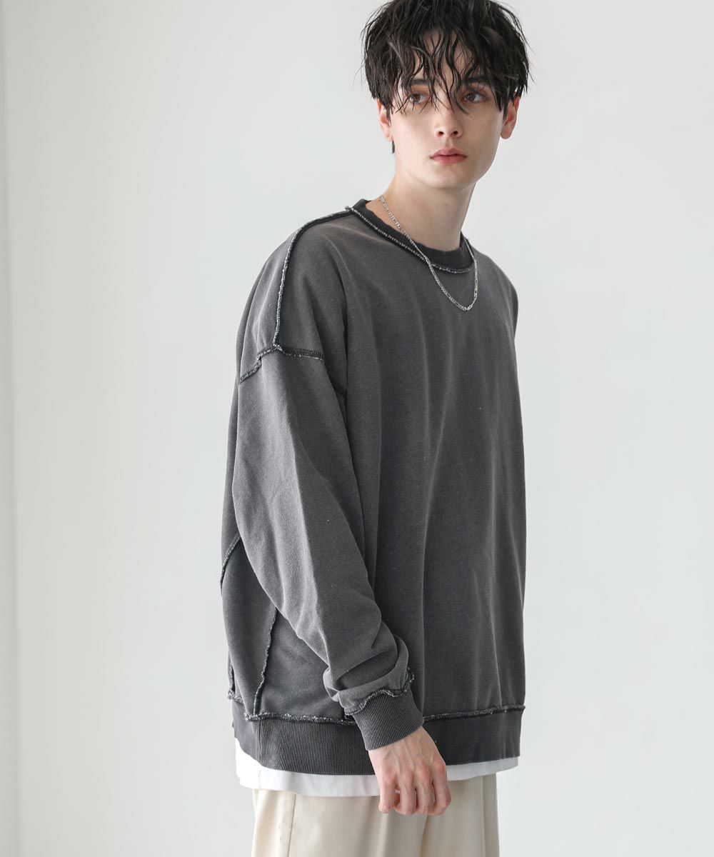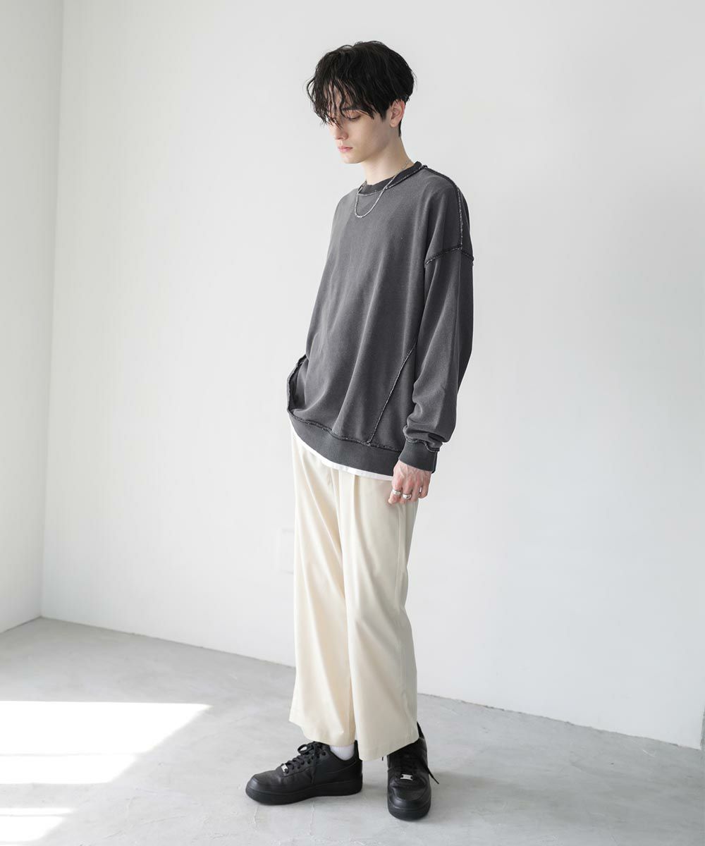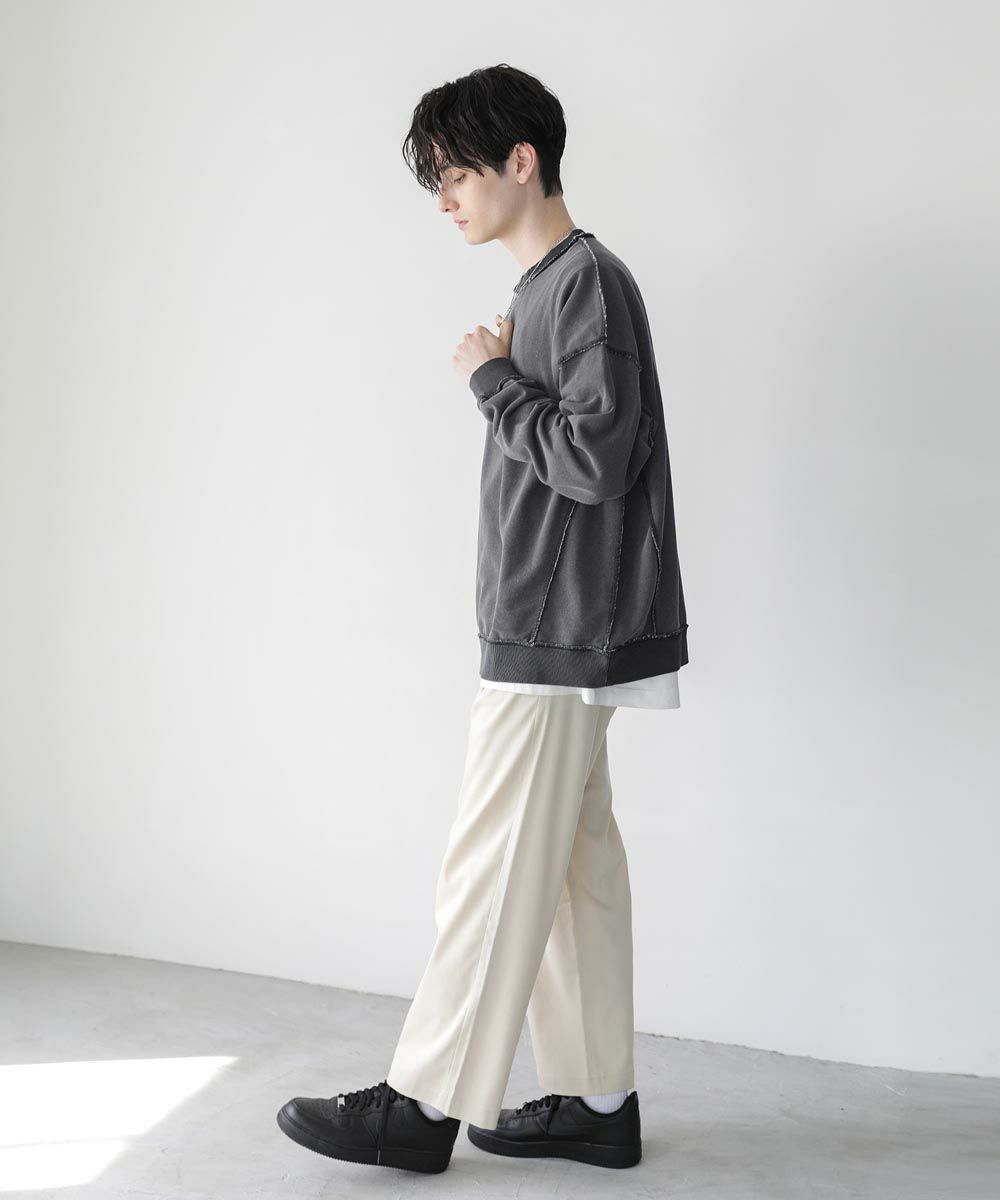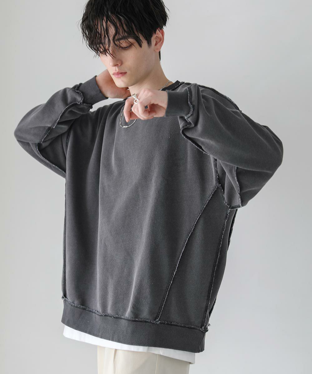 配色ステッチがアクセントになったスウェットプルオーバー。シンプルながらデザイン性のあるスウェットは春や秋に一枚でさらっと着ても着こなしが決まります。ヴィンテージアイテムのような風合いのインディゴ染を施した雰囲気抜群の一枚。ドロップショルダーにゆるっとしたルーズなシルエットがリラックス感のあるアイテムです。裏毛スウェットはサラッとした肌触りと軽い着心地で、カットソー感覚でロングシーズン着用が可能。