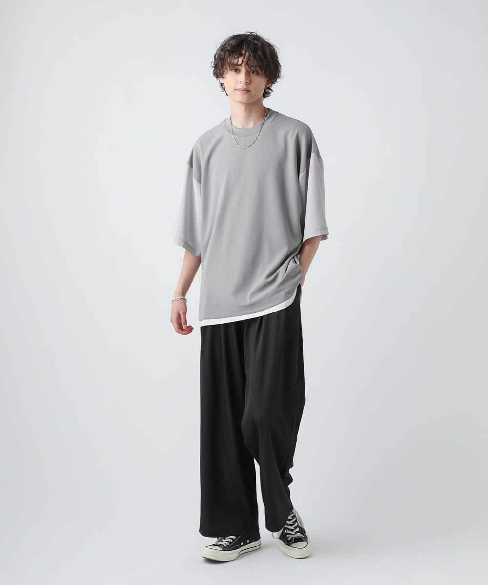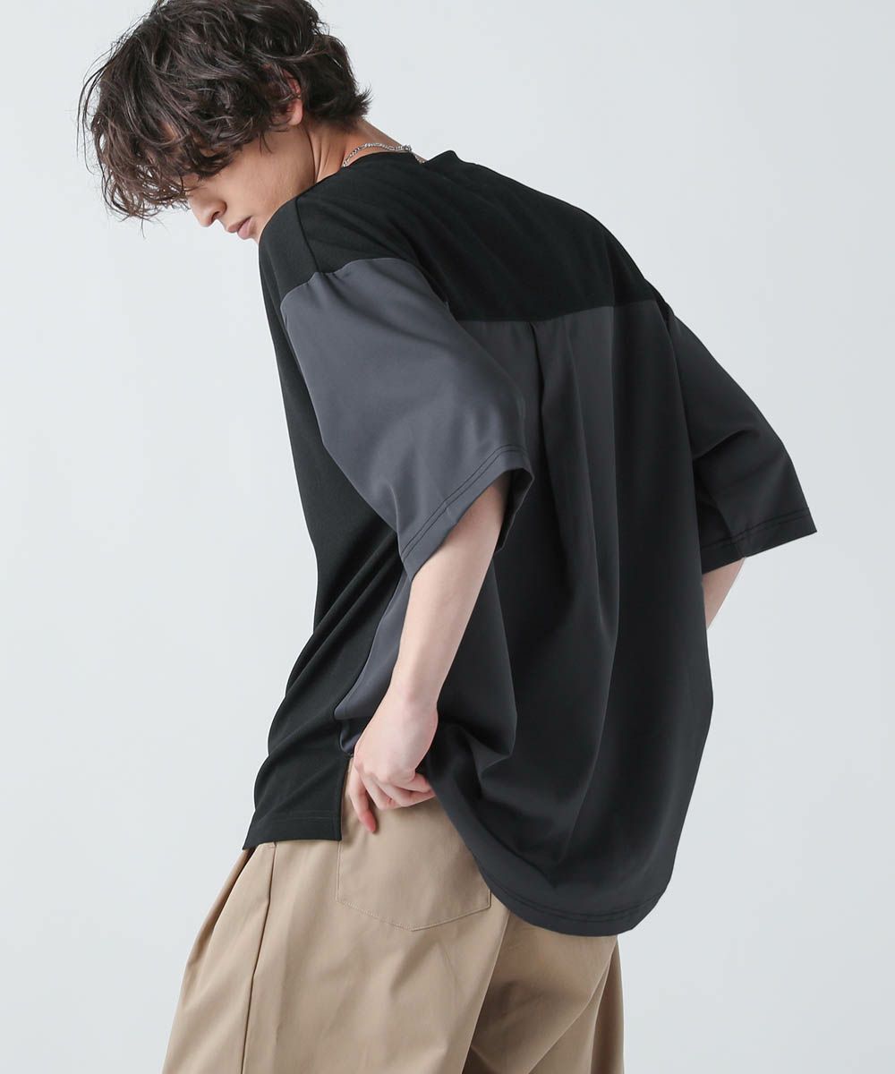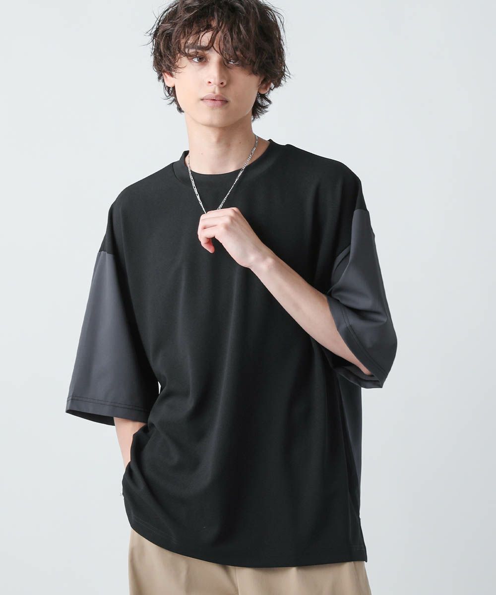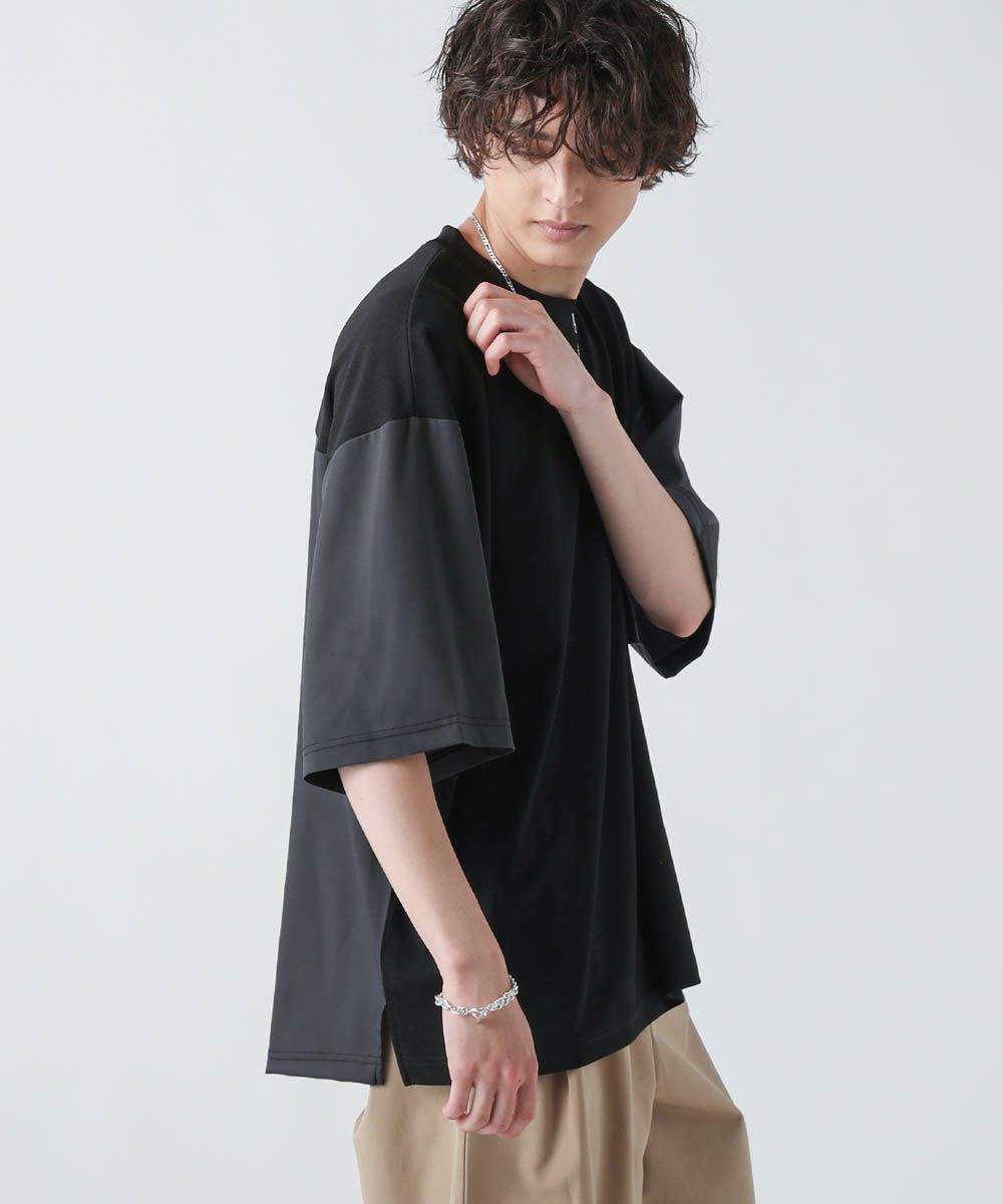 切り替えデザインが目を惹くオーバーサイズTシャツ。フロント身頃はドレープ感があり、軽くさらっとしたカットジョーゼット素材。袖とバックは布帛の切り替えになっており、カットソーとシャツをMIXしたようなデザインです。ゆったりとしたサイジングとドロップショルダー、裾のスリットなどリラックス感のあるシルエットで、1枚でトレンドの着こなしが完成します。ほんのりと光沢感があり、キレイめな印象で着こなせるのもポイント。シンプルになりがちな夏のコーディネートに変化をつけられるアイテムです。
