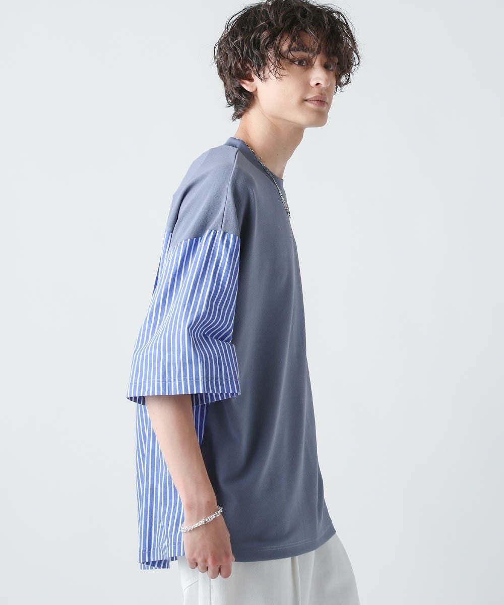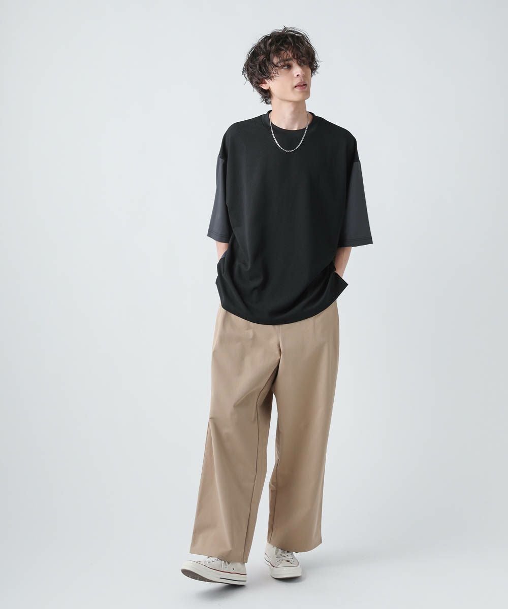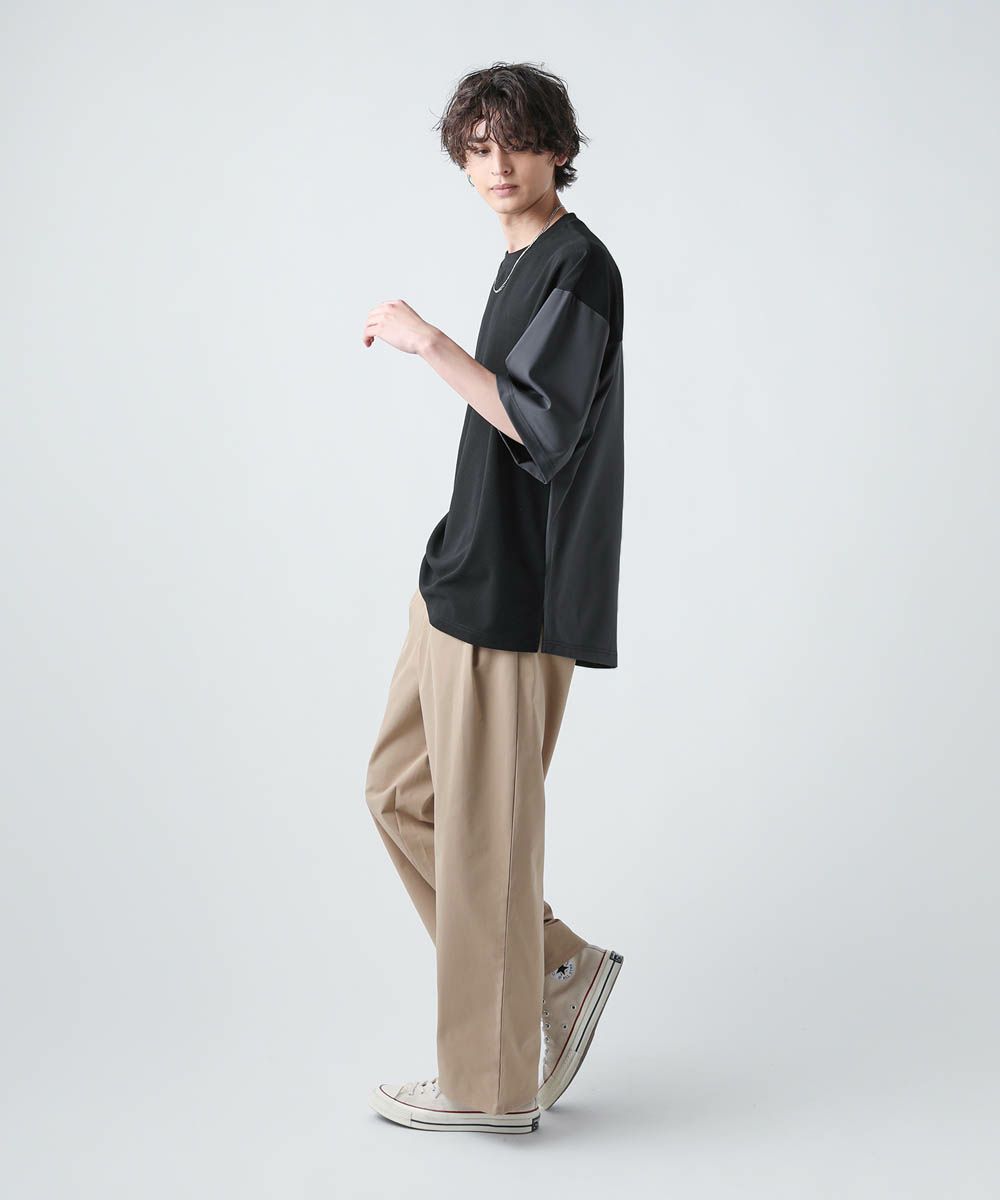 切り替えデザインが目を惹くオーバーサイズTシャツ。フロント身頃はドレープ感があり、軽くさらっとしたカットジョーゼット素材。袖とバックは布帛の切り替えになっており、カットソーとシャツをMIXしたようなデザインです。ゆったりとしたサイジングとドロップショルダー、裾のスリットなどリラックス感のあるシルエットで、1枚でトレンドの着こなしが完成します。ほんのりと光沢感があり、キレイめな印象で着こなせるのもポイント。シンプルになりがちな夏のコーディネートに変化をつけられるアイテムです。