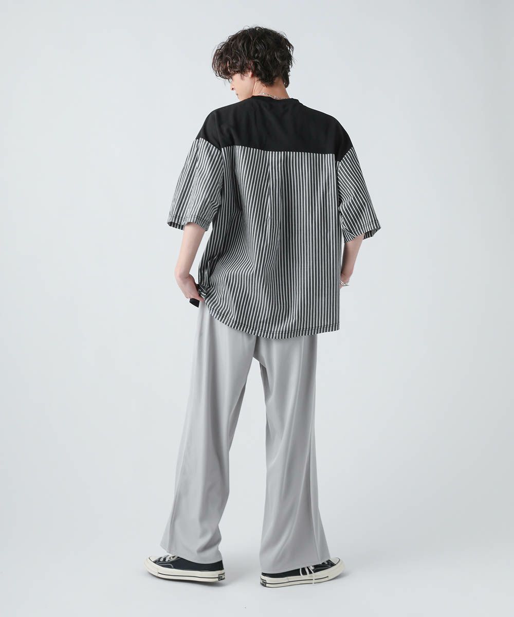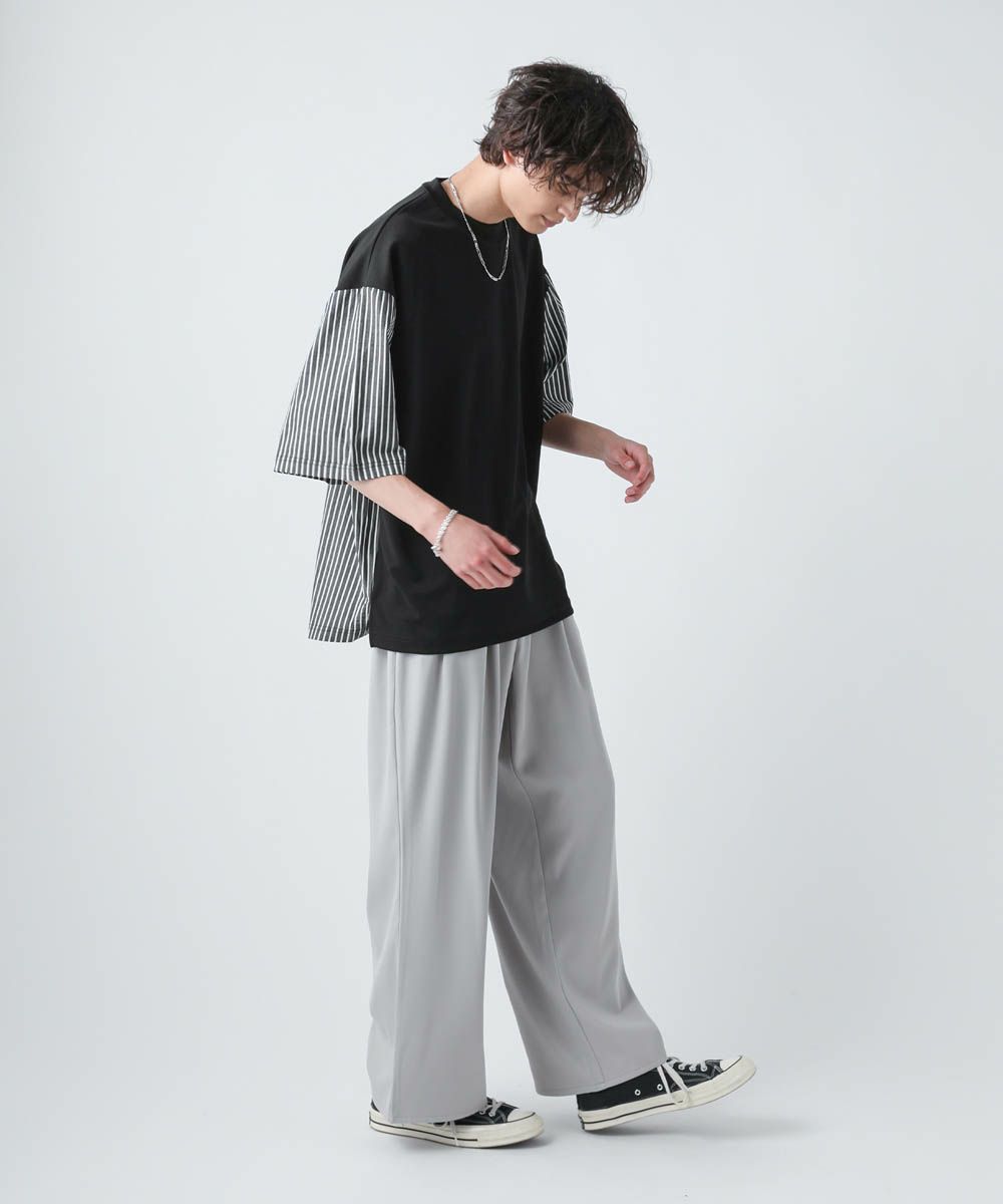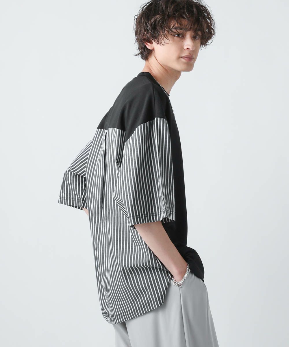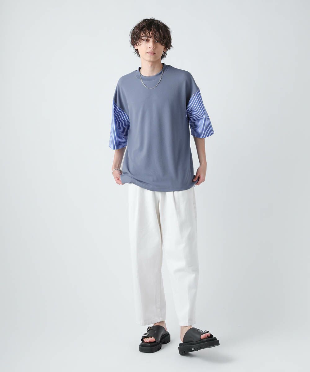 切り替えデザインが目を惹くオーバーサイズTシャツ。フロント身頃はドレープ感があり、軽くさらっとしたカットジョーゼット素材。袖とバックは布帛の切り替えになっており、カットソーとシャツをMIXしたようなデザインです。ゆったりとしたサイジングとドロップショルダー、裾のスリットなどリラックス感のあるシルエットで、1枚でトレンドの着こなしが完成します。ほんのりと光沢感があり、キレイめな印象で着こなせるのもポイント。シンプルになりがちな夏のコーディネートに変化をつけられるアイテムです。