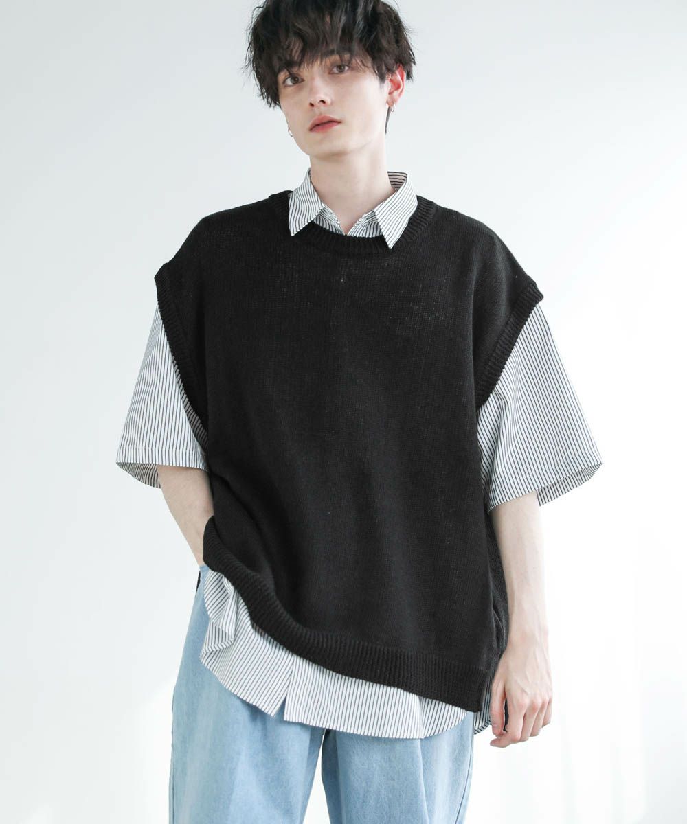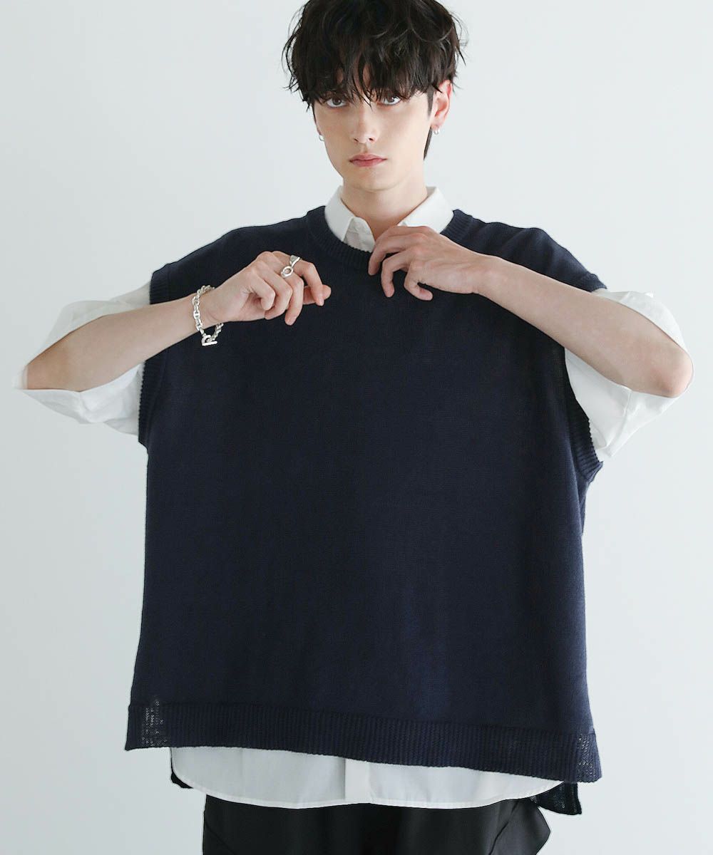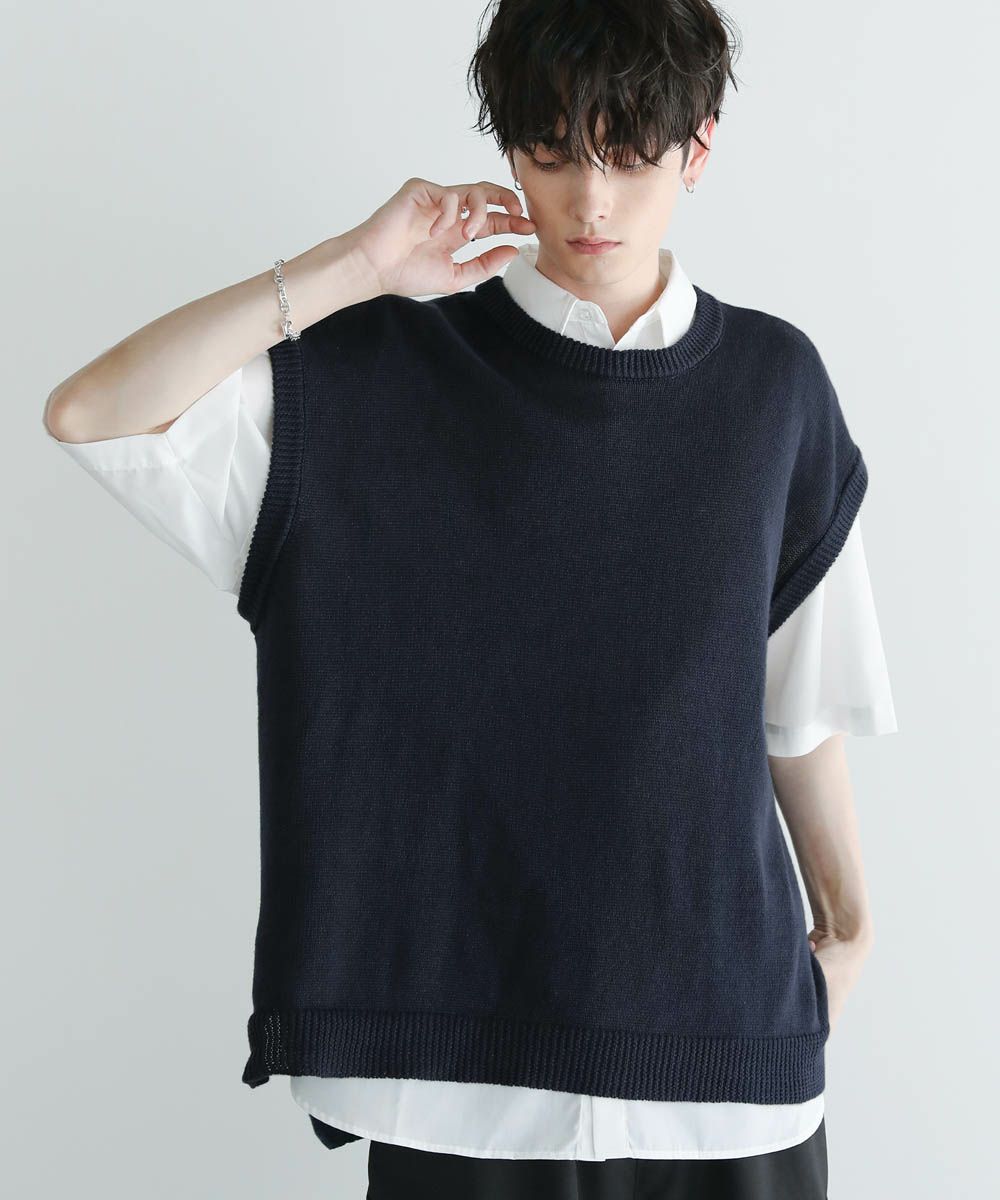 清涼感のある綿麻素材を使用したサマーニットベスト。シンプルになりがちな春夏の着こなしに変化をつけられるアイテムです。