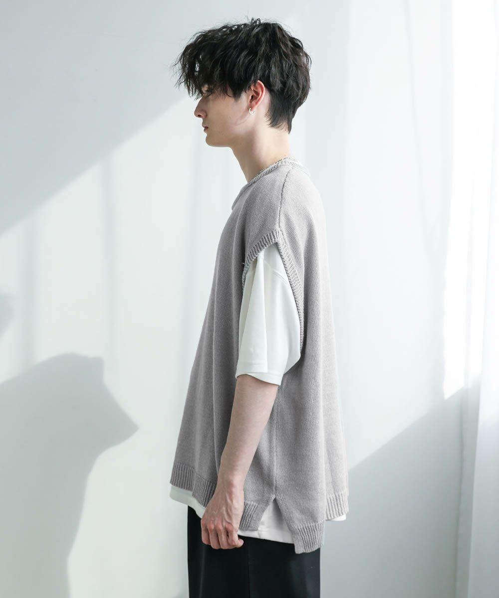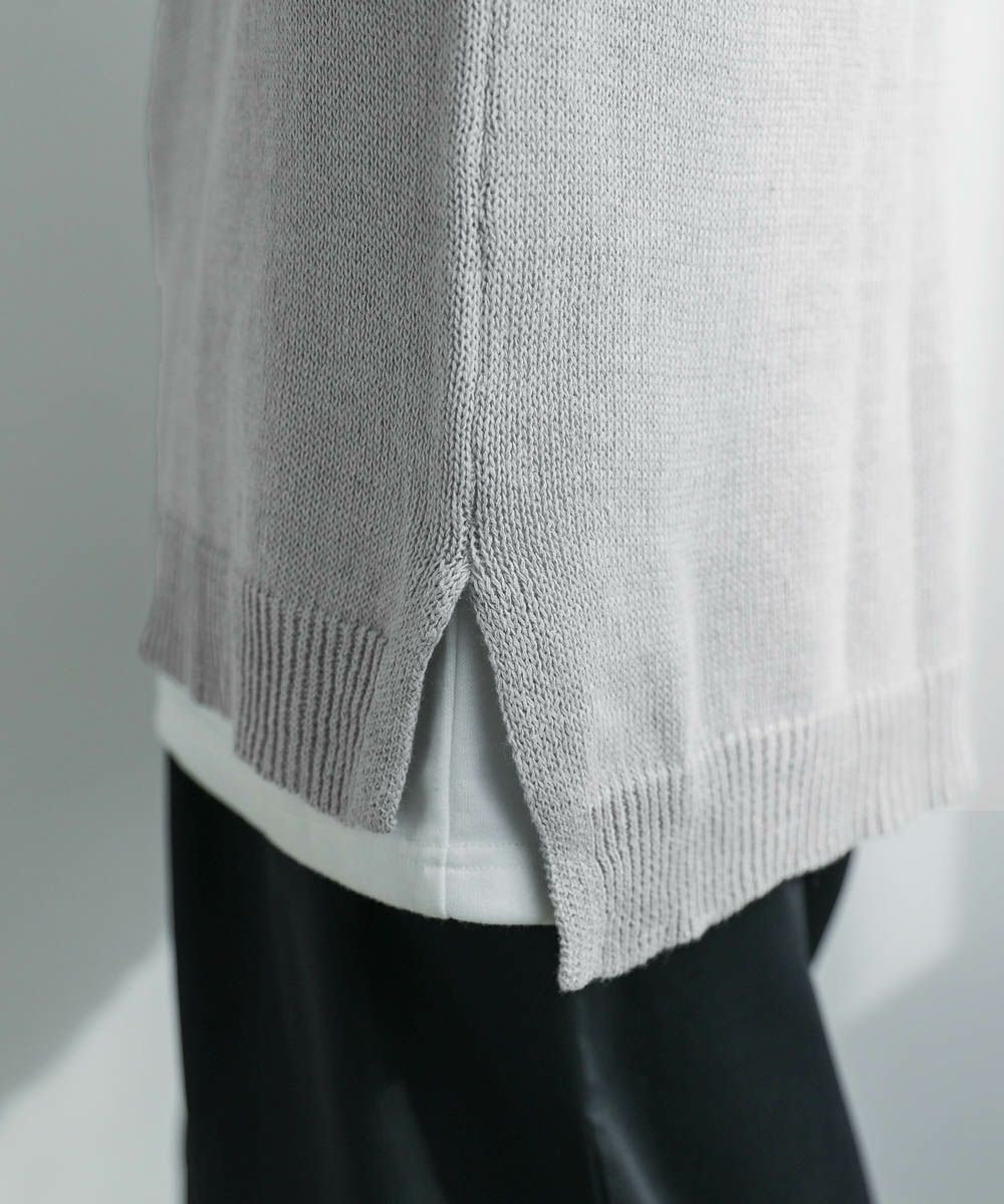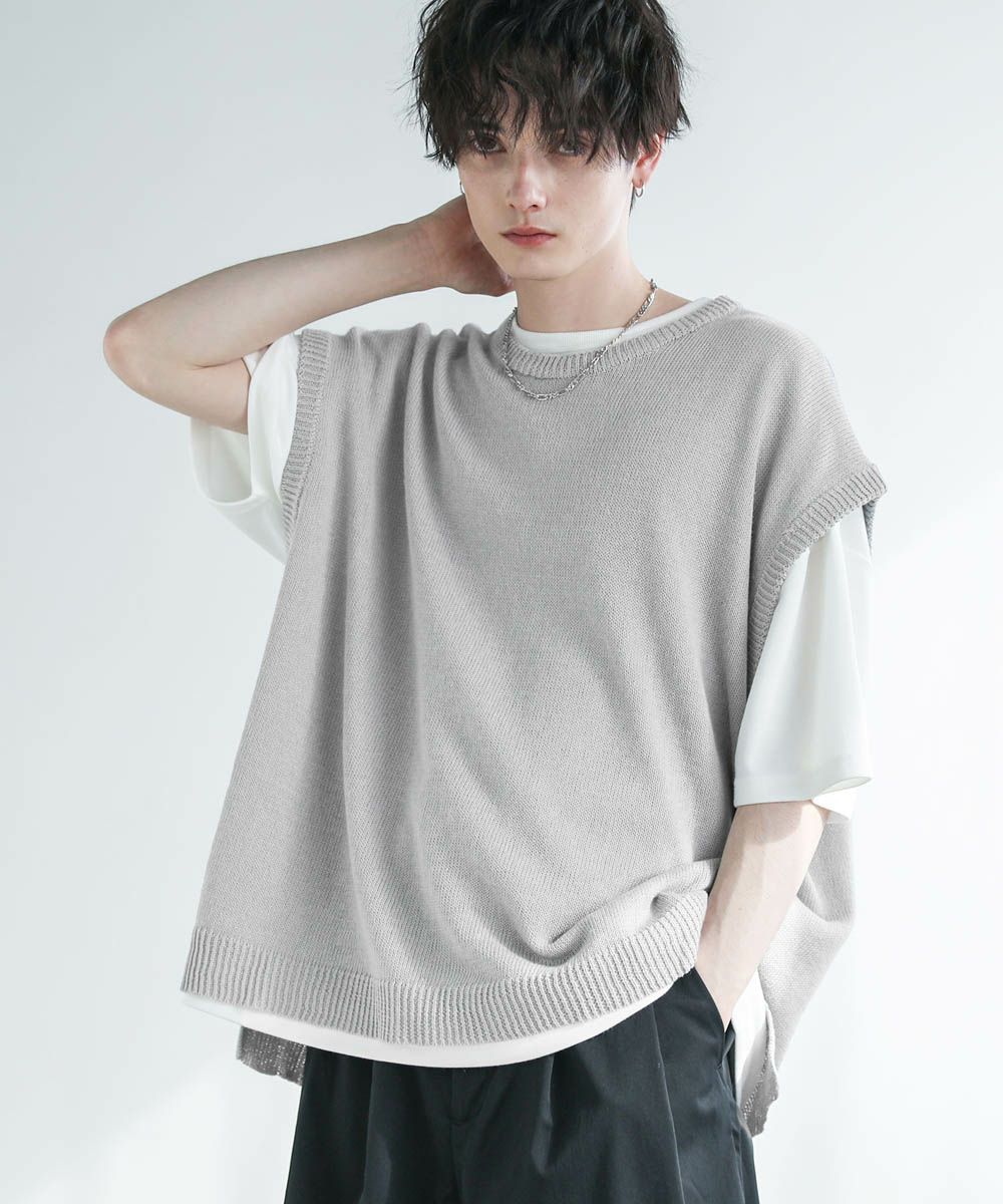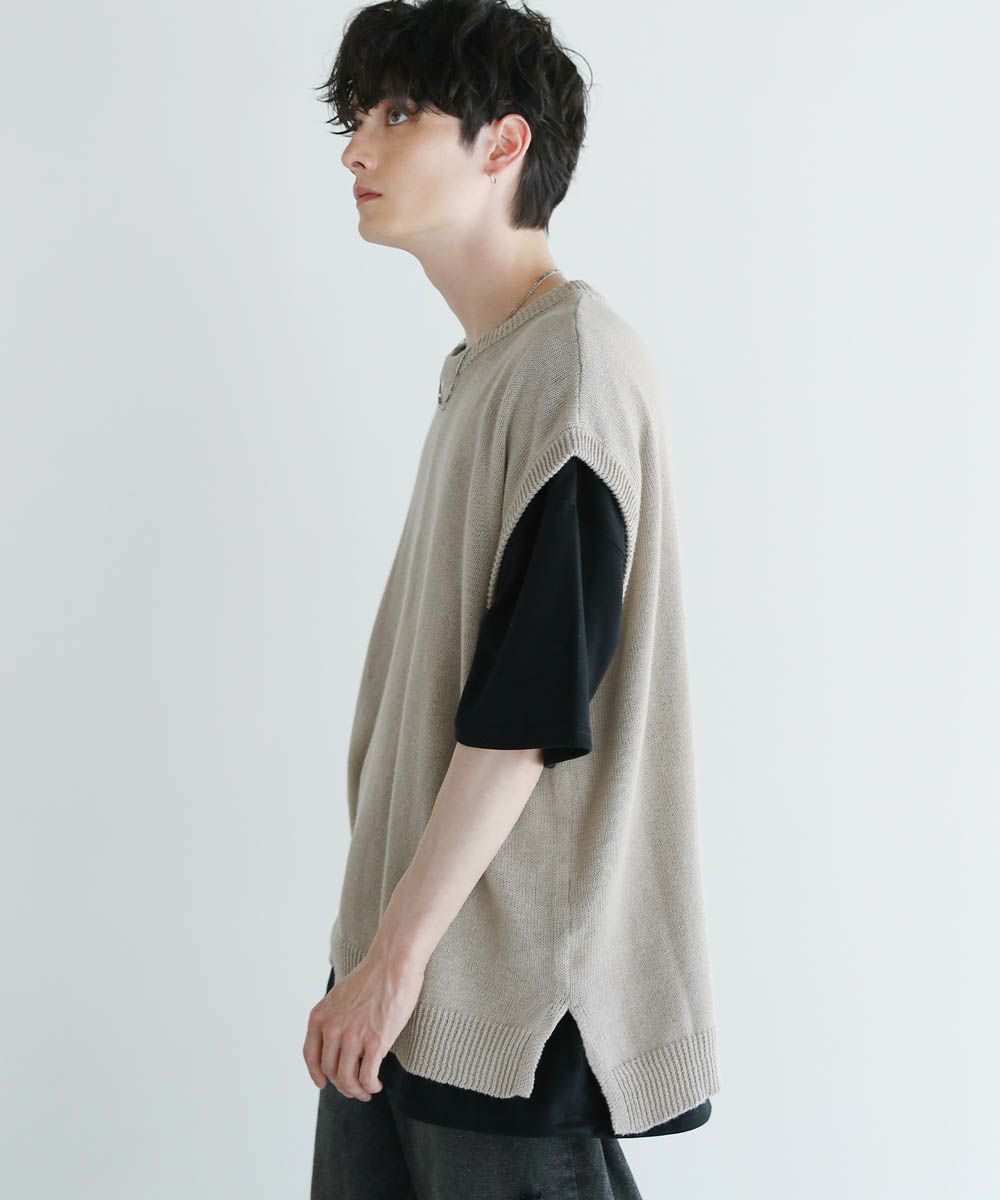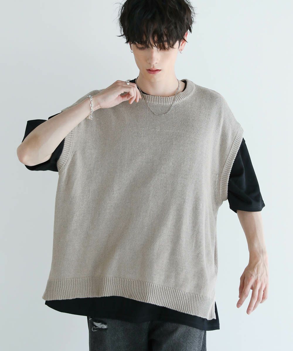 ゆったりとしたシルエットと浅めに入ったサイドスリットが抜け感をプラス。腕ぐりにゆとりを持たせているので、ビッグTやルーズシャツなど大きめのインナーともレイヤードがキレイに決まります。サラッとした肌触り&通気性に優れた薄手の綿麻ニット素材は暑い季節も快適に着用できます。季節感のあるリラックスした雰囲気&着こなしの幅を広げてくれるおすすめの1枚です。