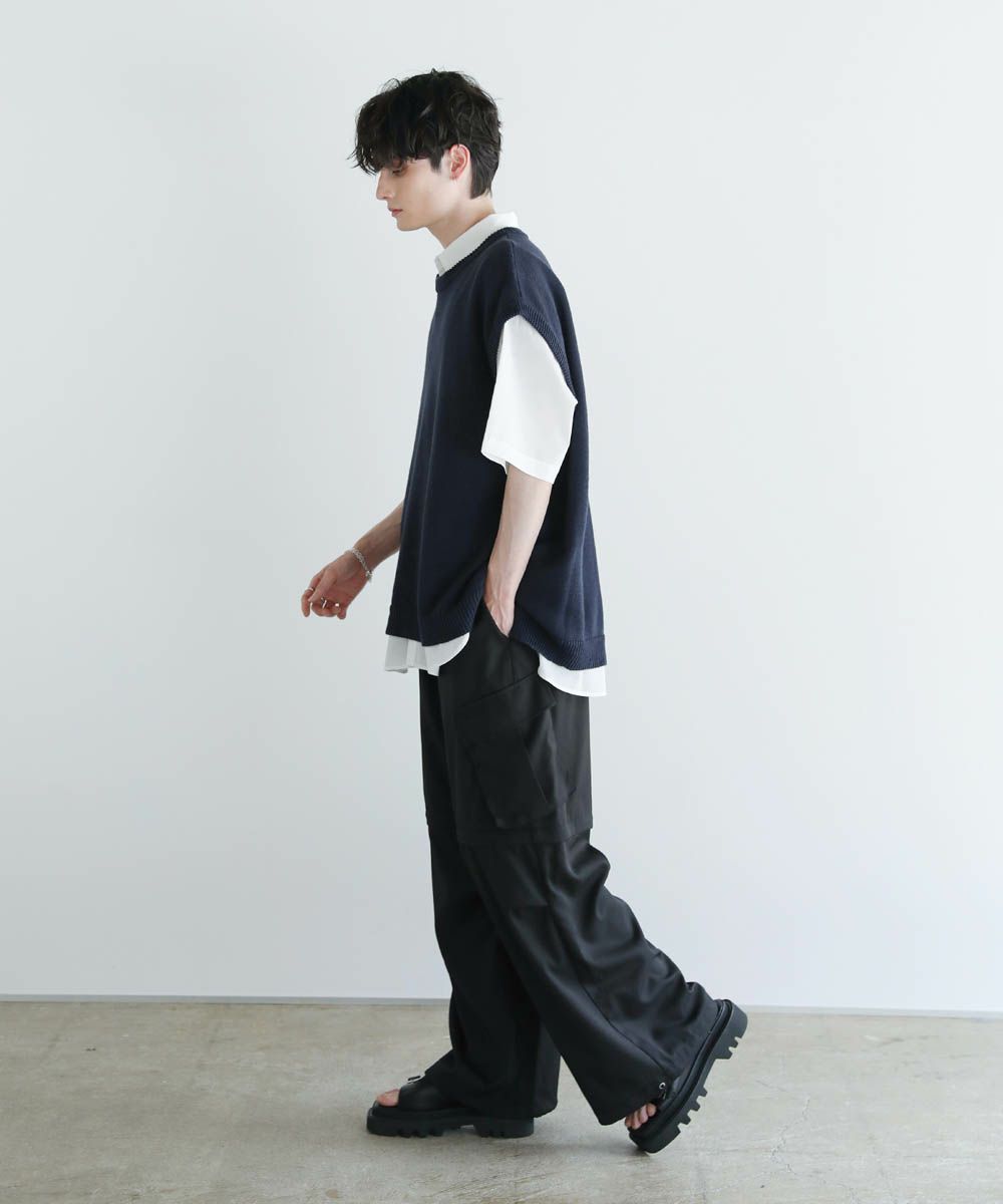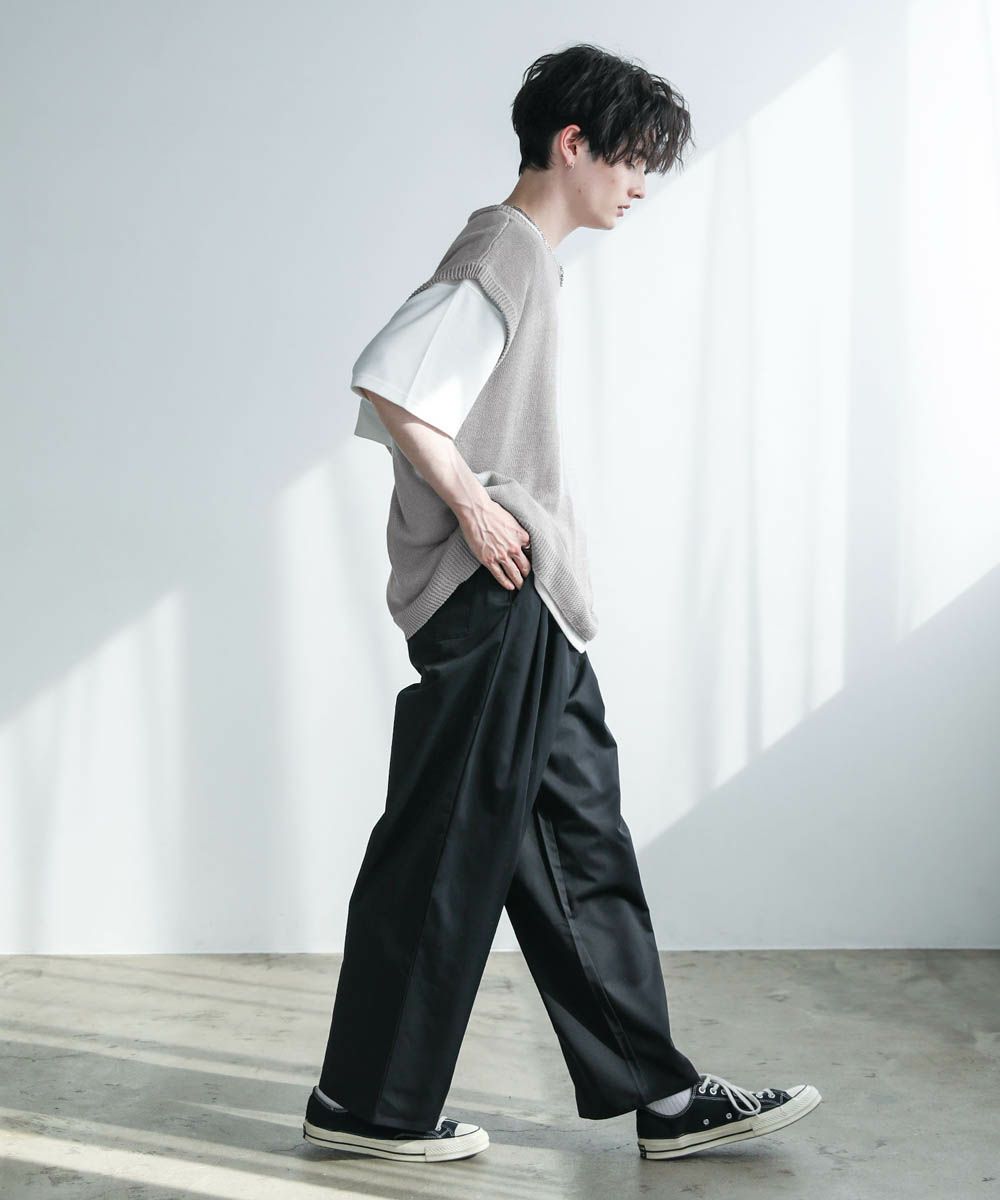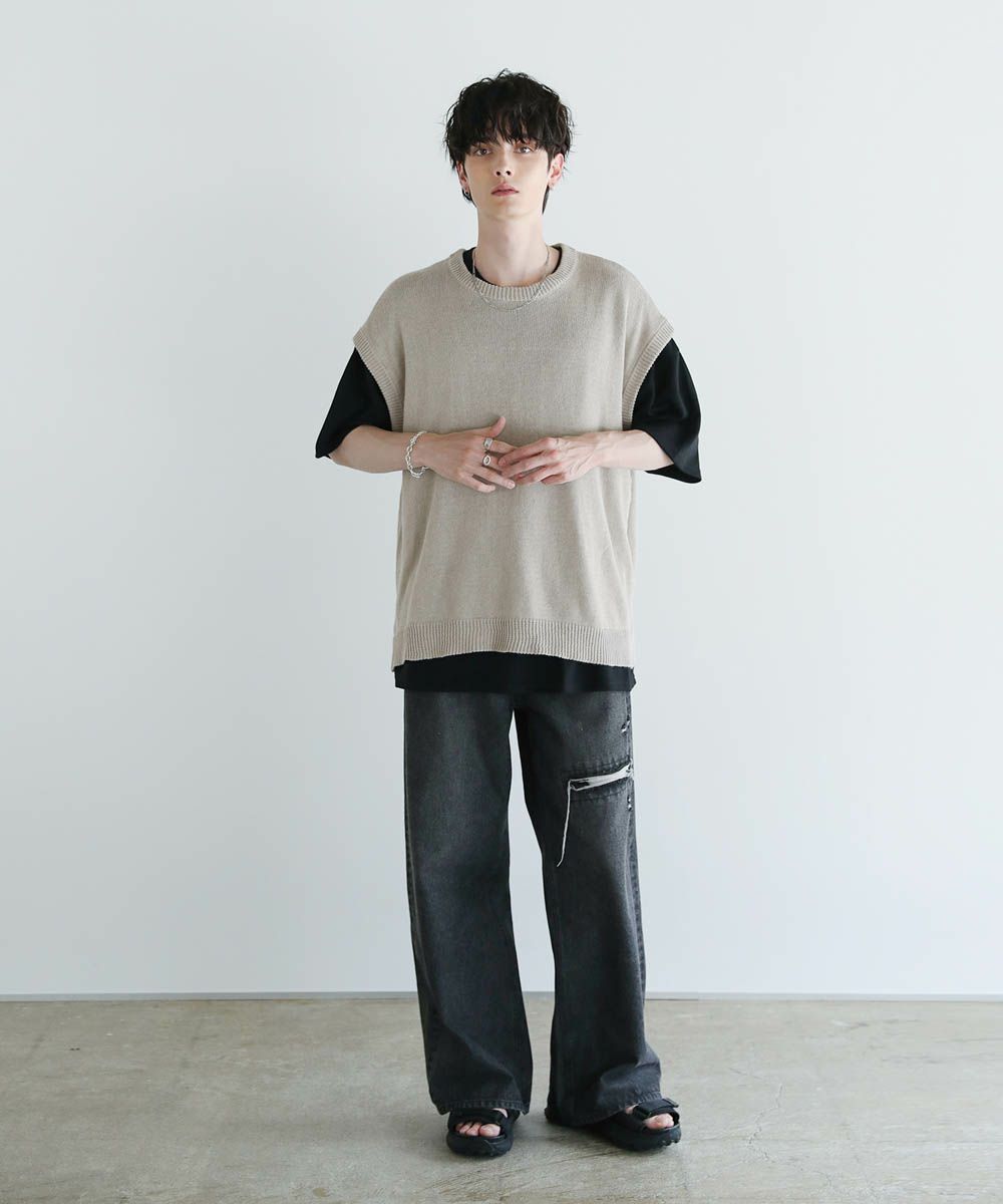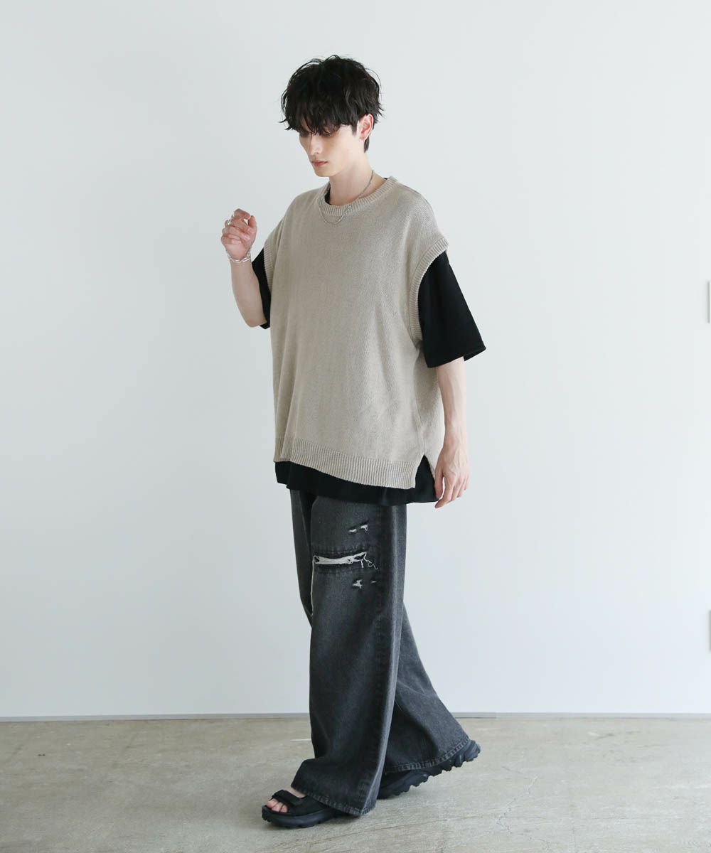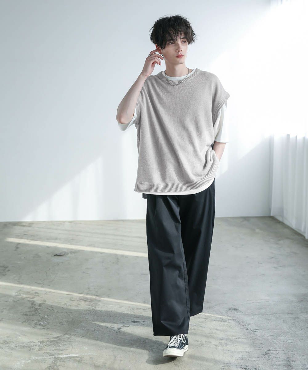 ゆったりとしたシルエットと浅めに入ったサイドスリットが抜け感をプラス。腕ぐりにゆとりを持たせているので、ビッグTやルーズシャツなど大きめのインナーともレイヤードがキレイに決まります。サラッとした肌触り&通気性に優れた薄手の綿麻ニット素材は暑い季節も快適に着用できます。季節感のあるリラックスした雰囲気&着こなしの幅を広げてくれるおすすめの1枚です。