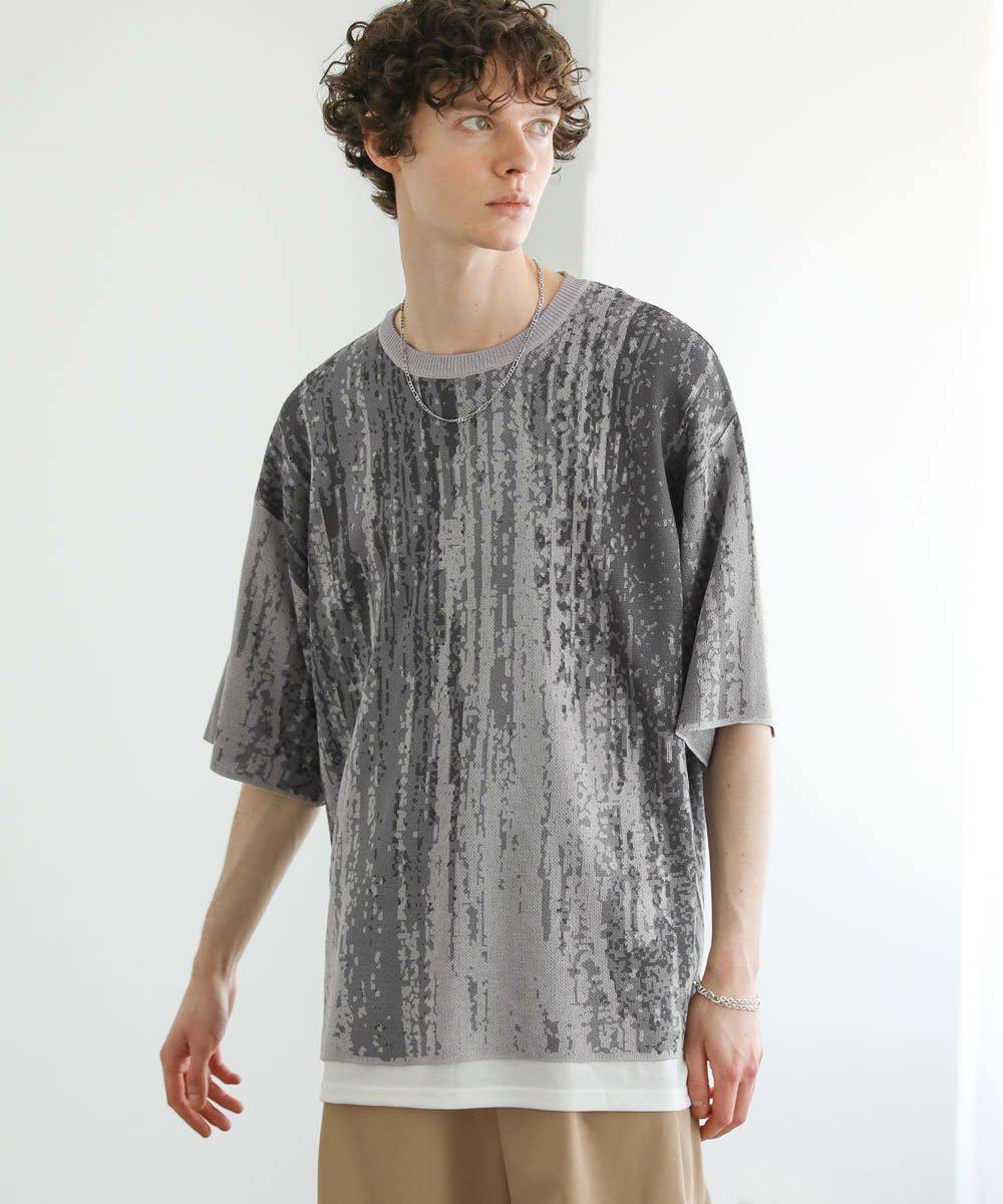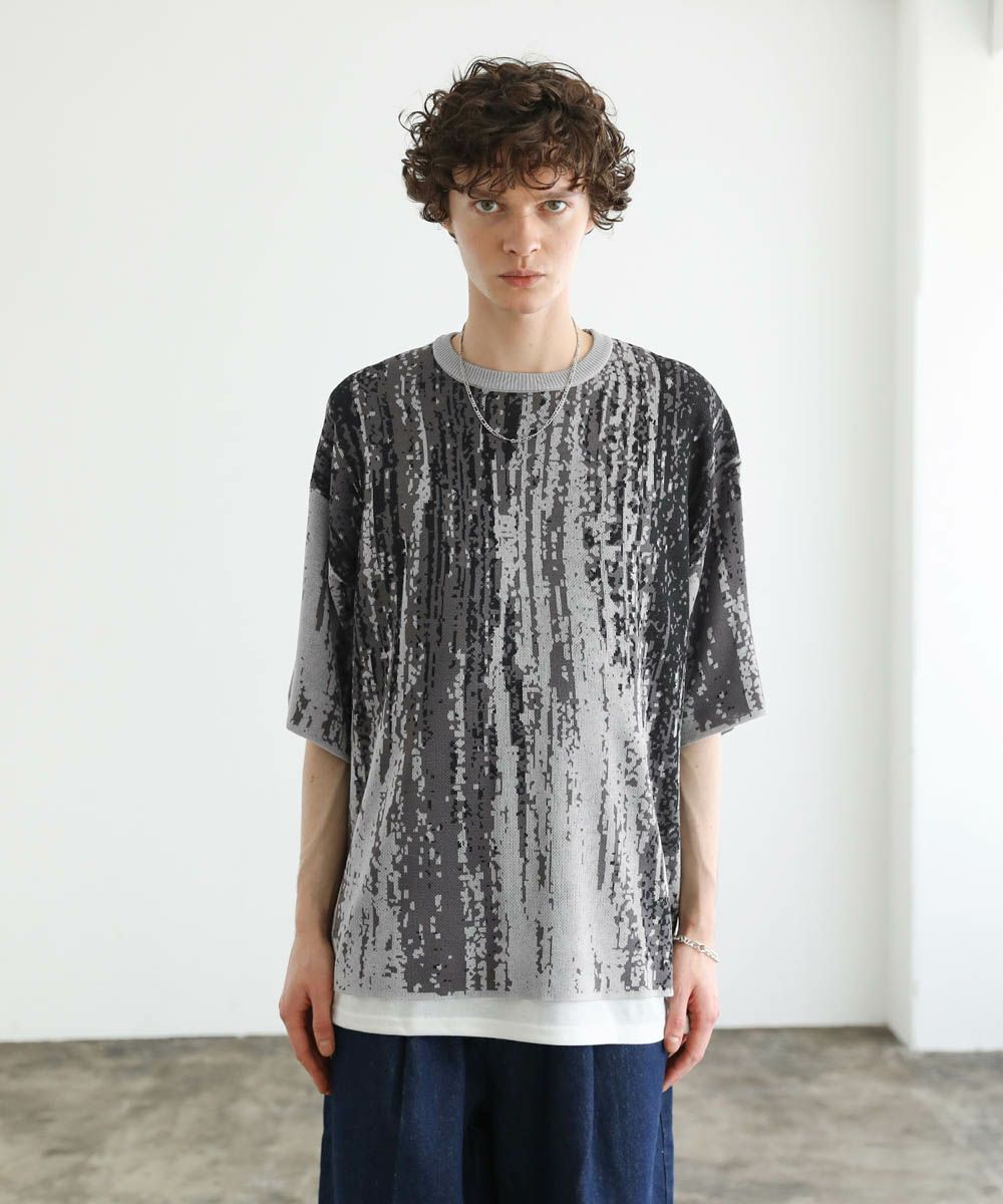 スタイリッシュな総柄デザインが目を惹くサマーニット。ゆったりとしたサイジングとドロップショルダーで今っぽいトレンドのシルエットに。サイドにはスリットが施されており、インナーとのレイヤードも収まり良く決まります。しっかりとした生地感のダブルジャガード編みニットなので、着用時に綺麗なシルエットを保ってくれるのもポイント。Tシャツ1枚よりも品よく着こなせる、1枚で着映えるおすすめのアイテムです。