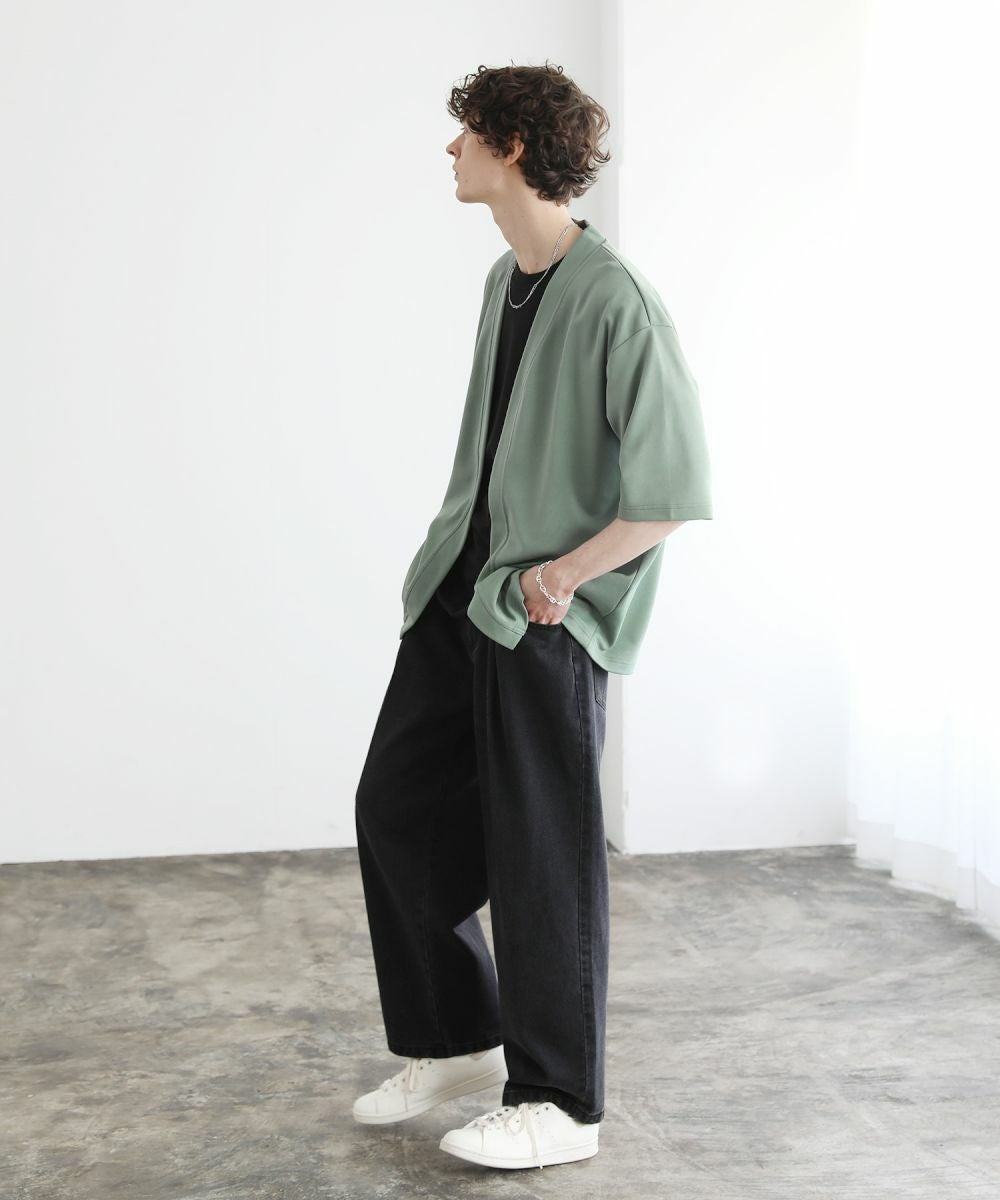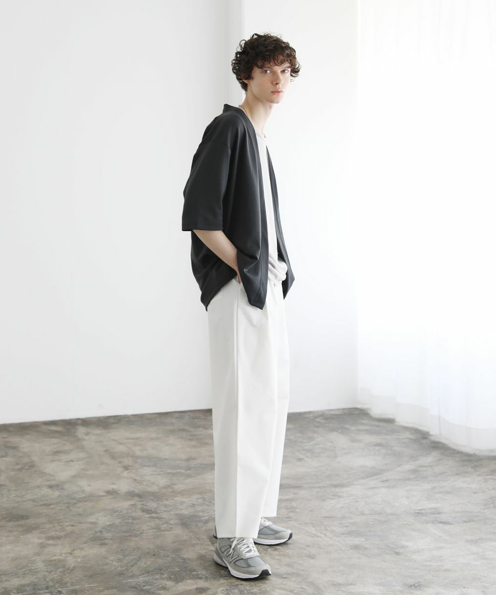 シンプルなデザインなので、様々なアイテムと相性抜群です。インナーにはタンクトップやTシャツ、ワイドスラックスやバギーパンツ、デニムパンツなど緩めのボトムと合わせたリラックス感のある着こなしがおすすめ。