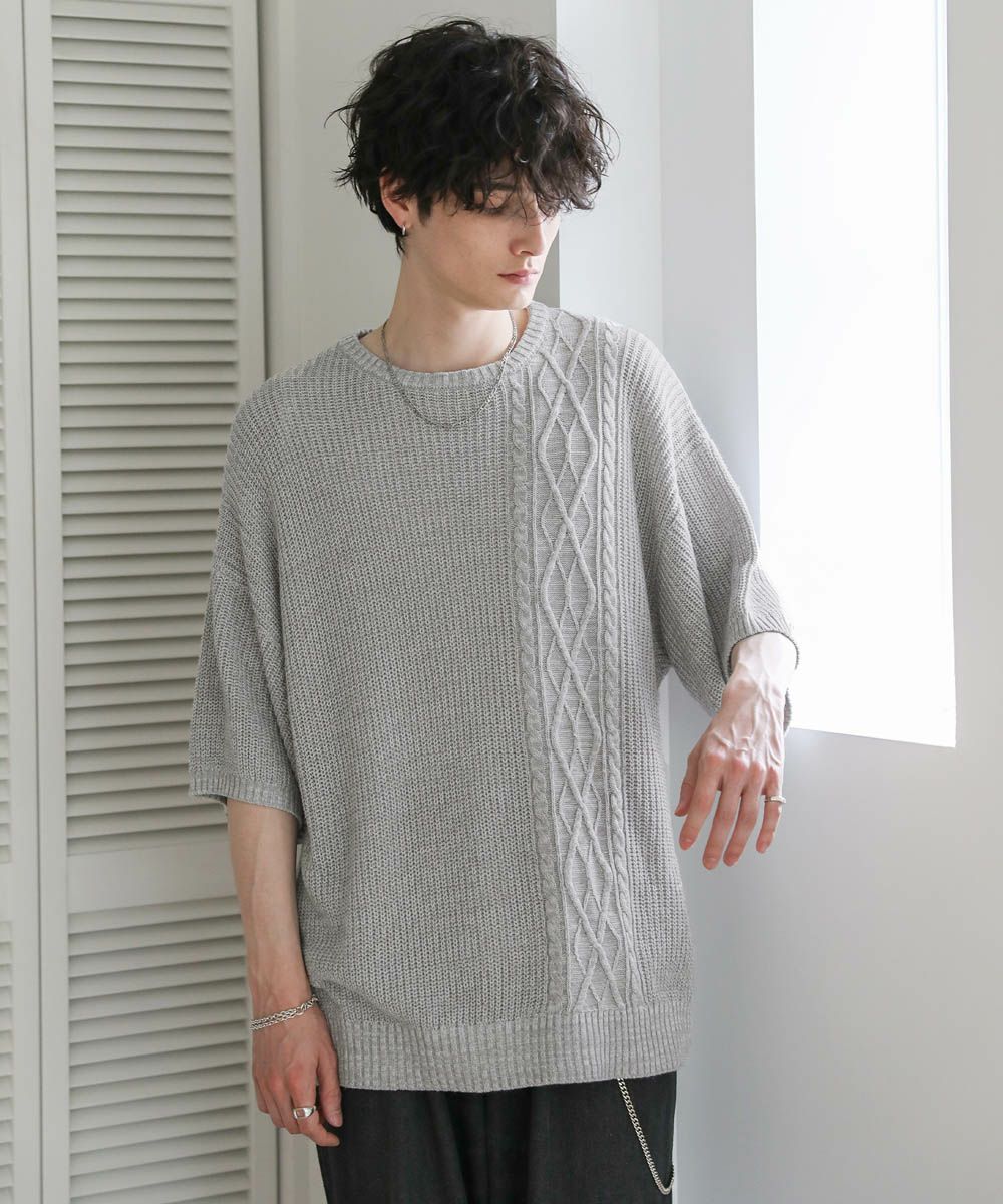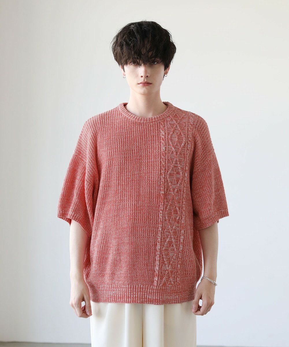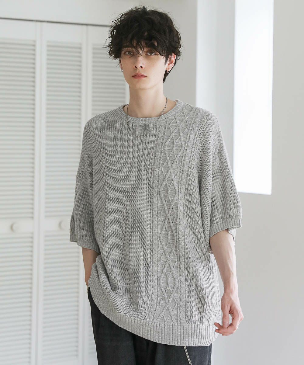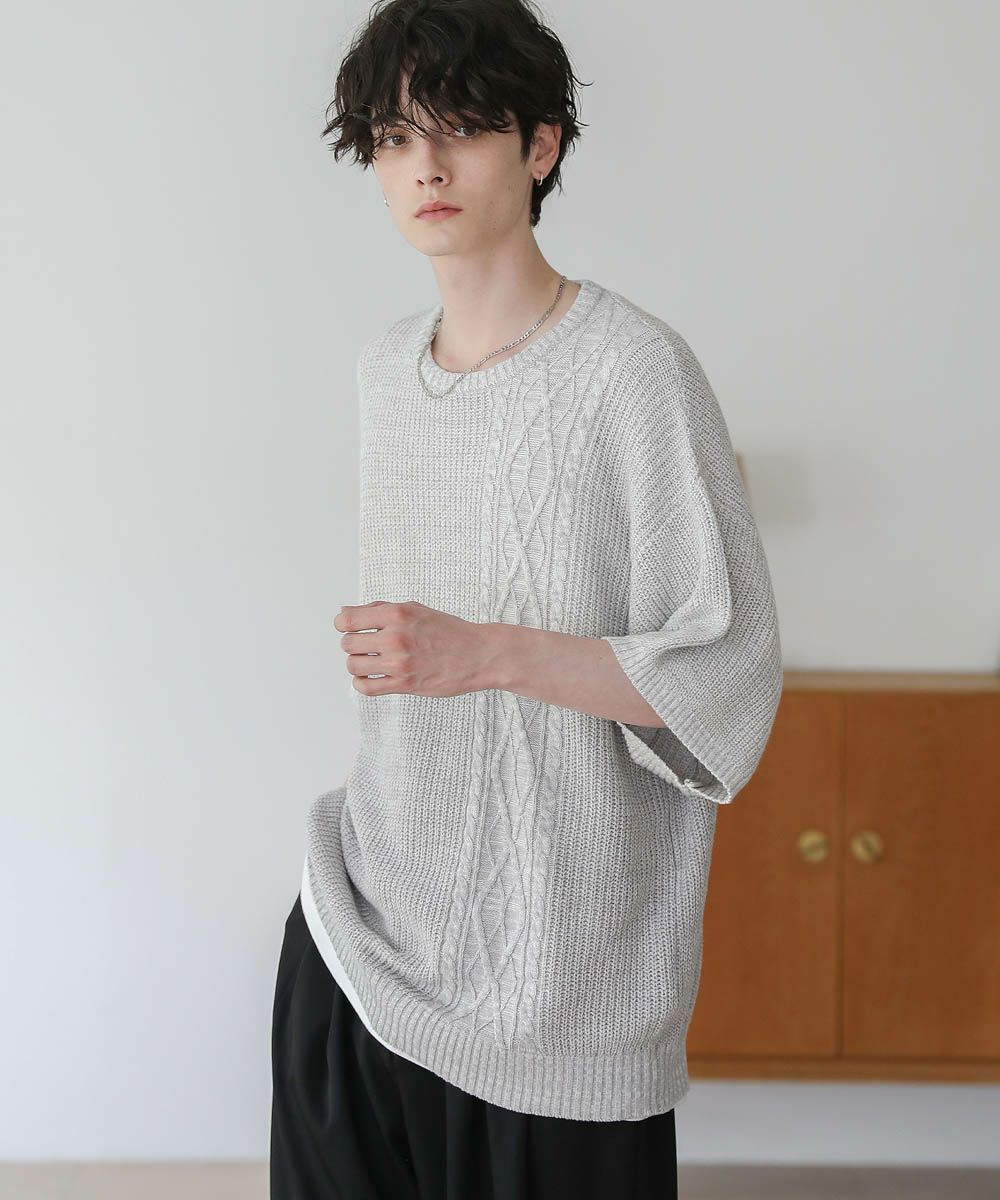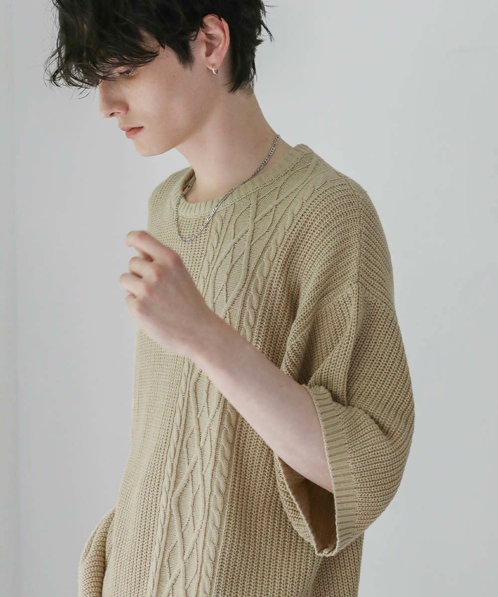ビッグシルエットでゆったりとカジュアルに着こなせる畦編みサマーニット。ケーブル柄の切り替えがアクセントになり、1枚で存在感のあるアイテムです。肩幅、身幅に余裕を持たせたオーバーサイズで、合わせるだけでトレンド感のあるコーデに。