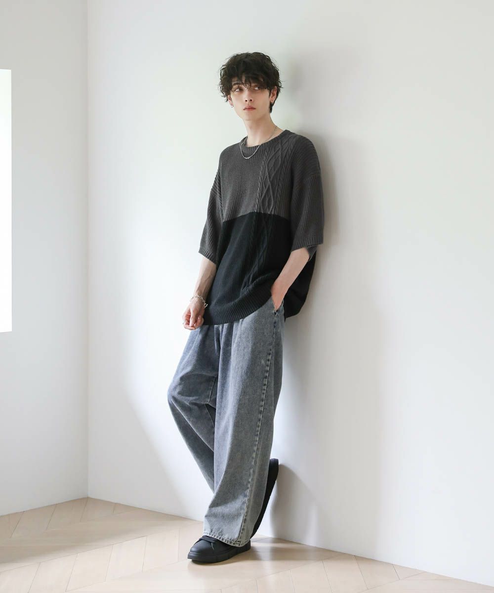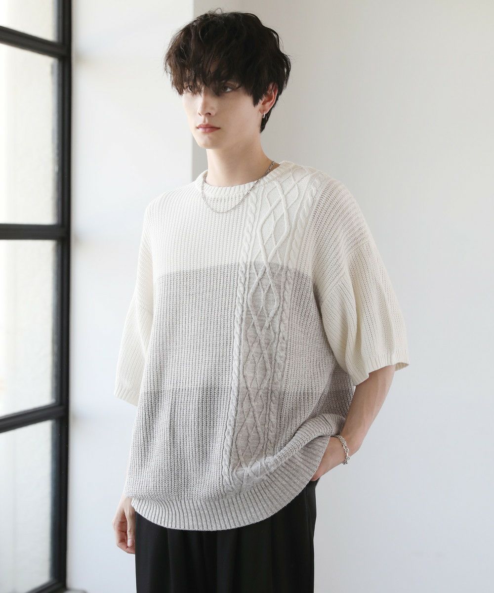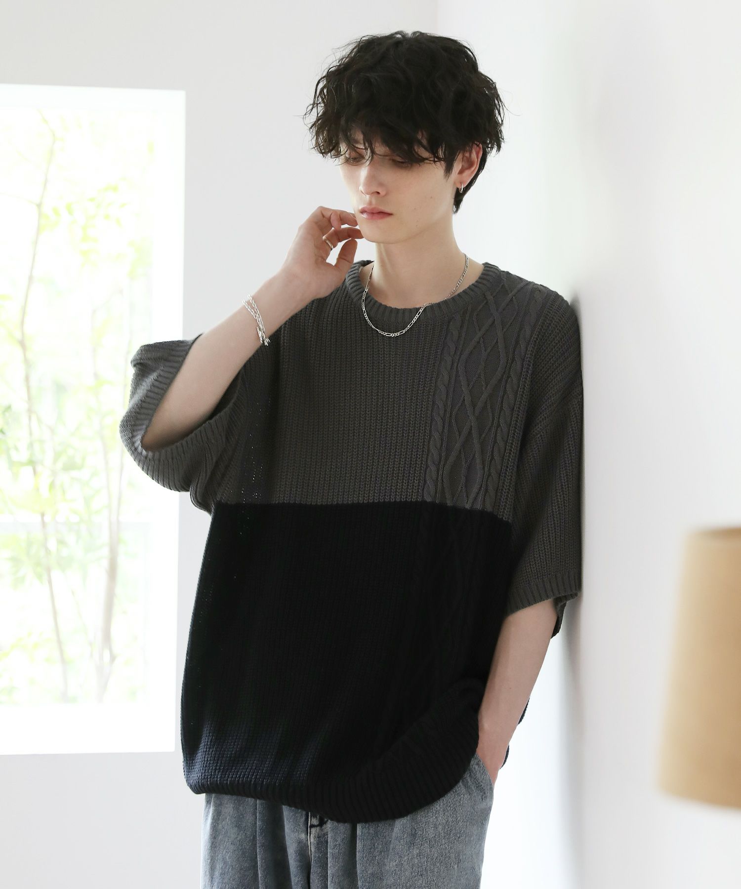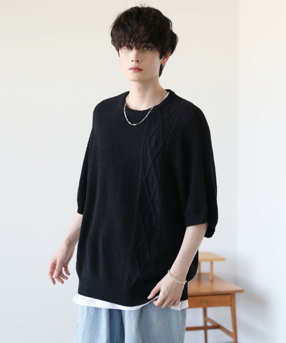 ビッグシルエットでゆったりとカジュアルに着こなせる畦編みサマーニット。ケーブル柄の切り替えがアクセントになり、1枚で存在感のあるアイテムです。肩幅、身幅に余裕を持たせたオーバーサイズで、合わせるだけでトレンド感のあるコーデに。