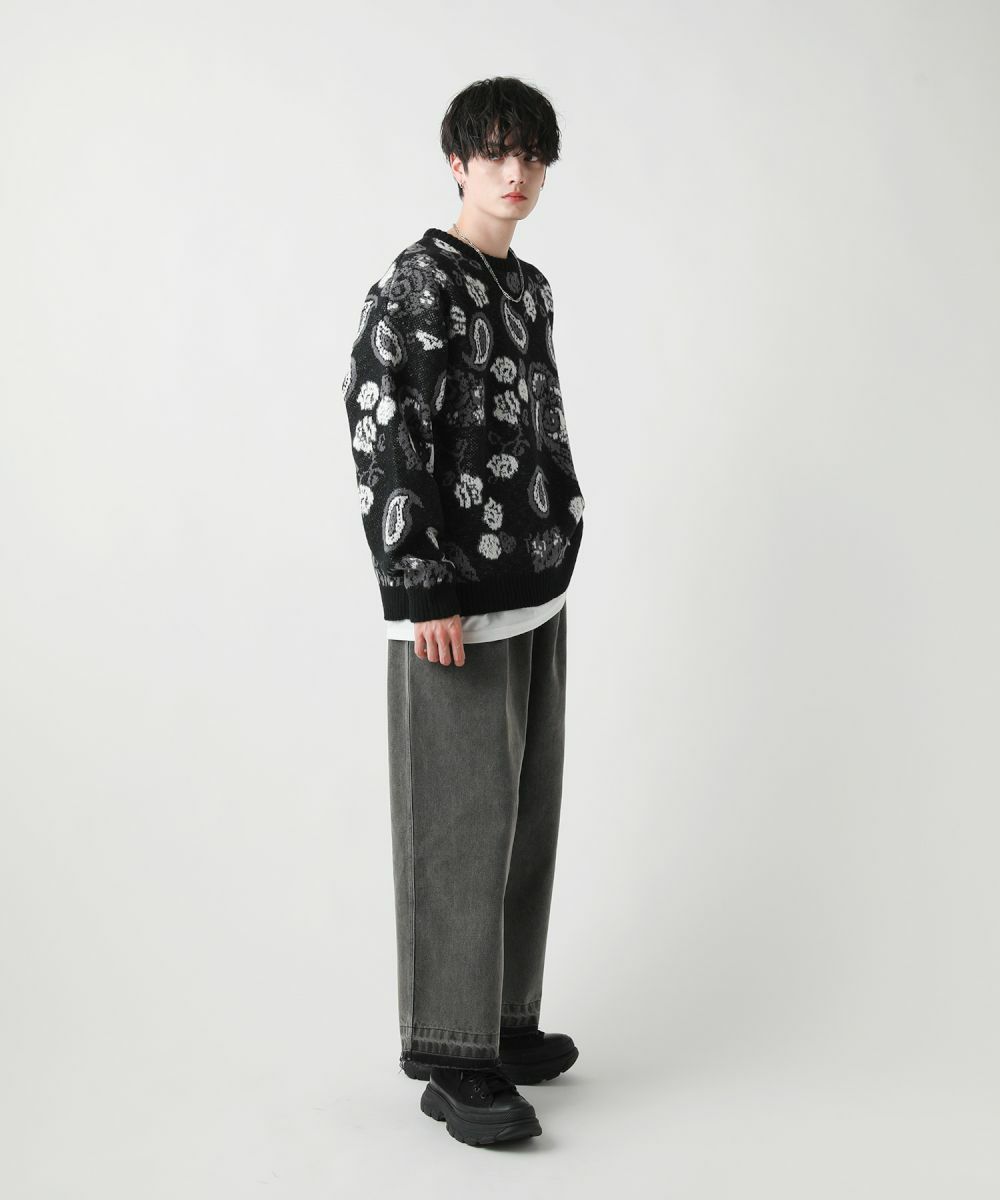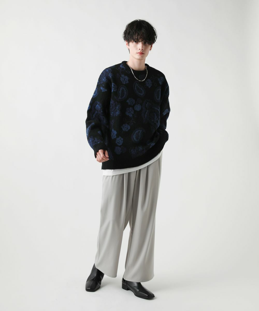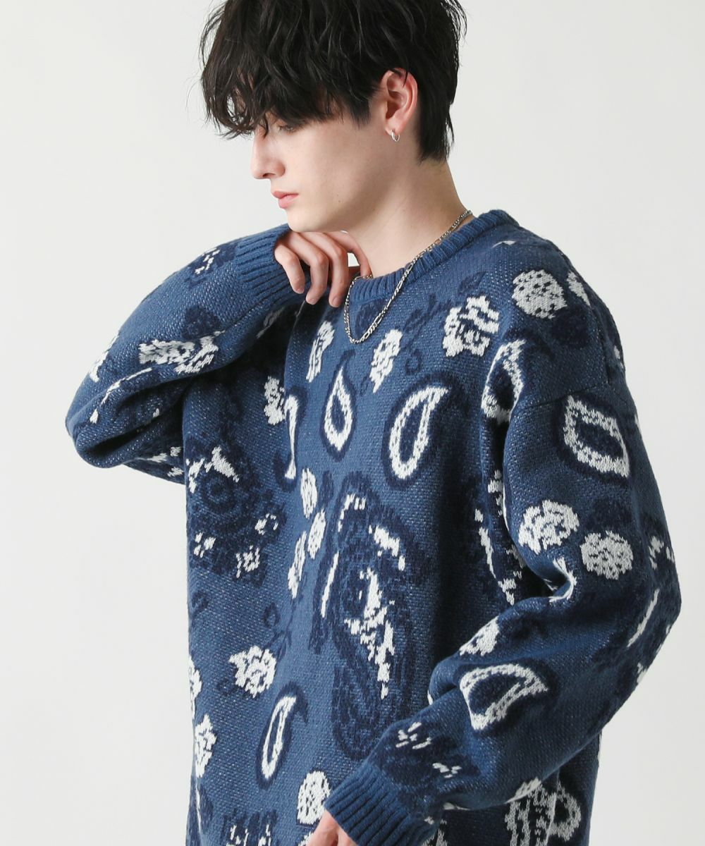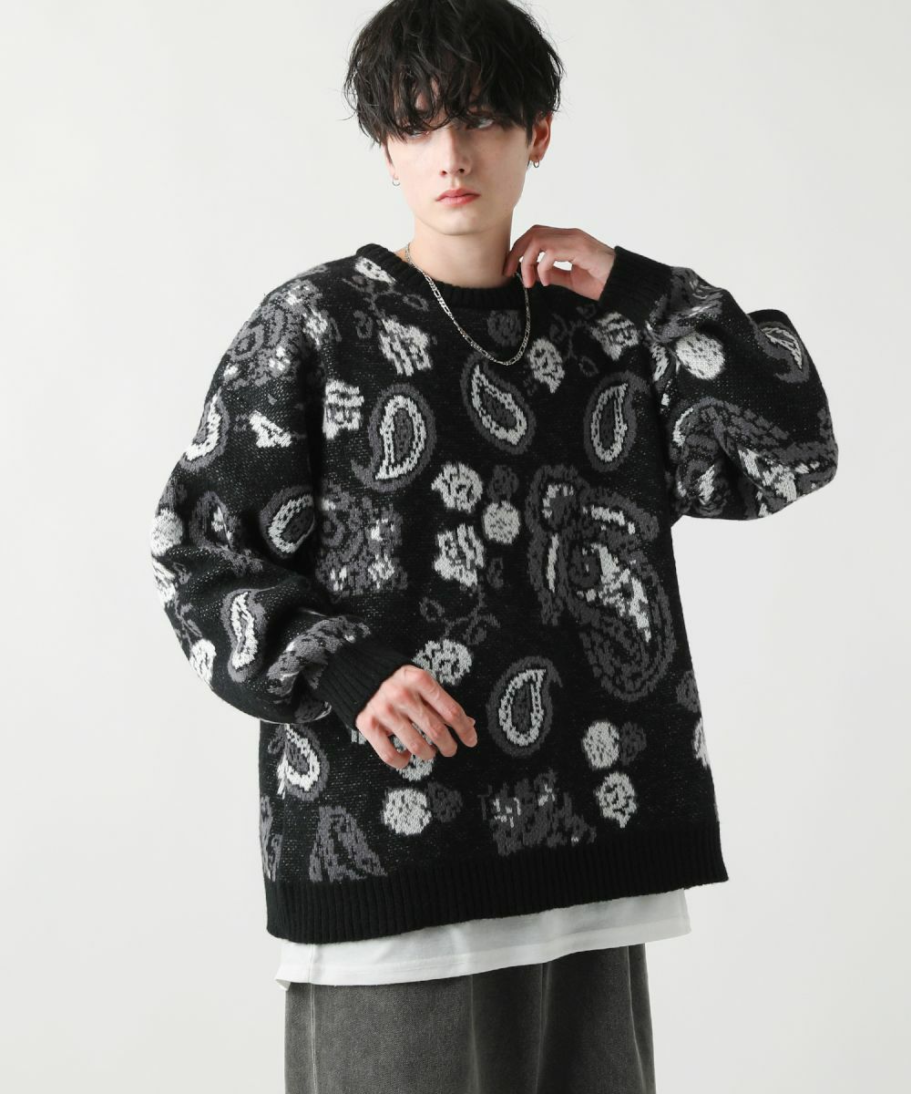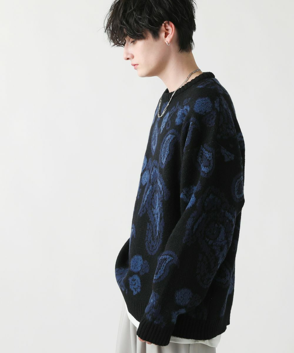ジャガードペイズリー柄オーバーサイズクルーネック長袖ニット