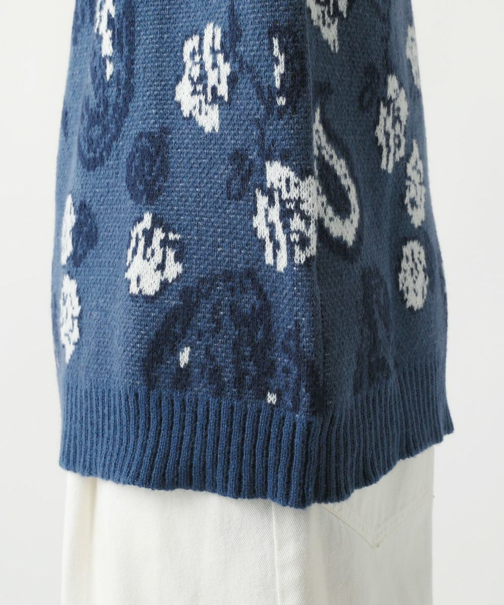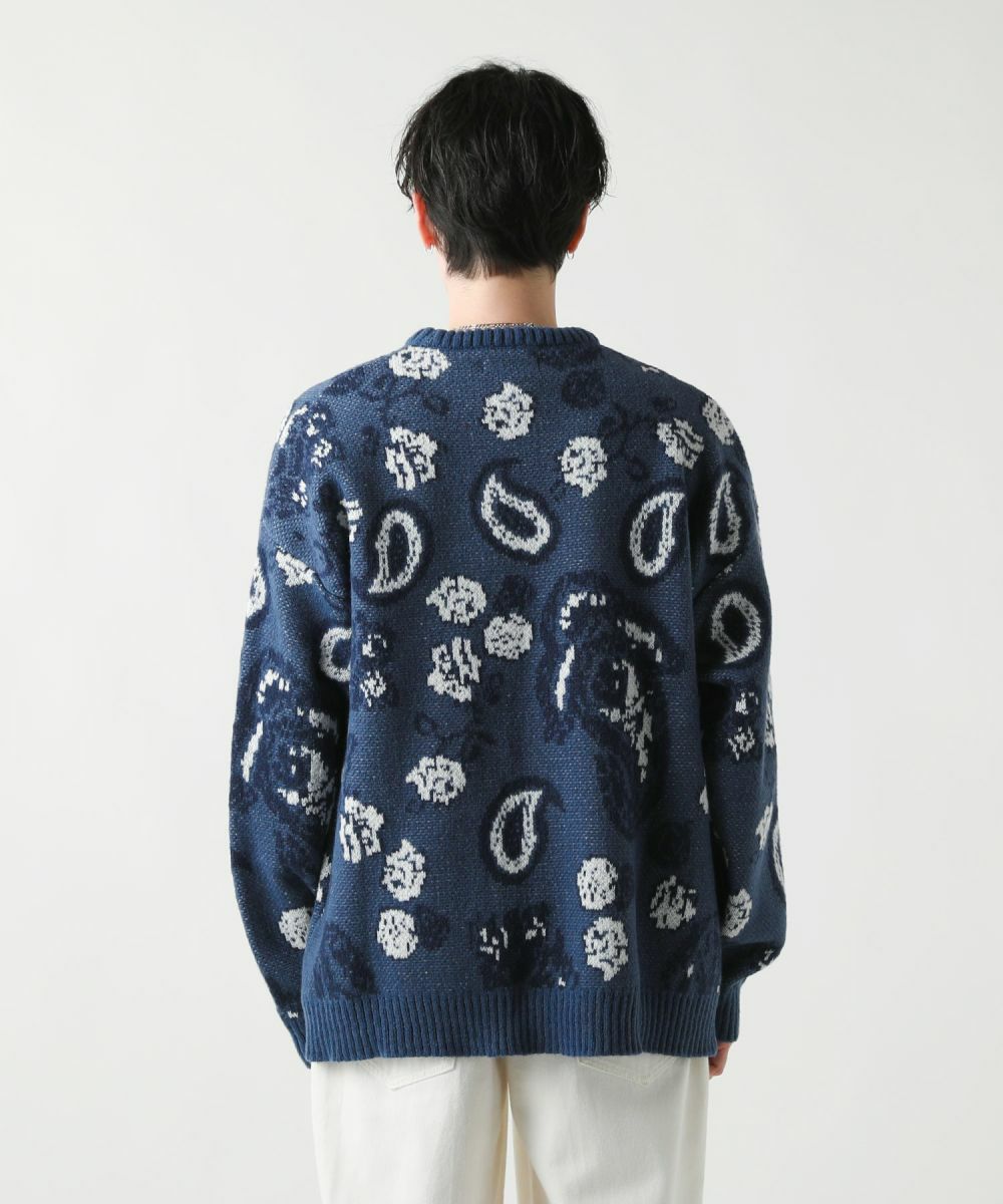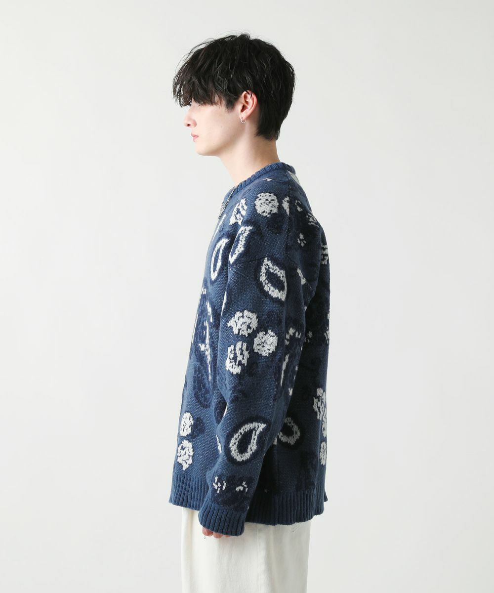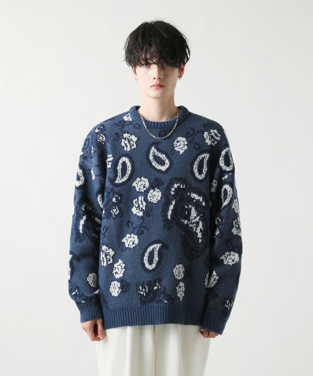 ペイズリー柄のデザインが映えるクルーネックニット。厚みのあるしっかりとした編み地に仕上げたため、柔らかく暖かい着心地です。ゆとりのある身幅でゆったりと着用でき、リラックス感漂う雰囲気のアイテム。首元と裾、袖にはリブ仕様で、寒い季節には風の侵入を防いでくれます。存在感のあるデザインで、1枚あると秋から春先まで着回すことのできる便利な一着です。