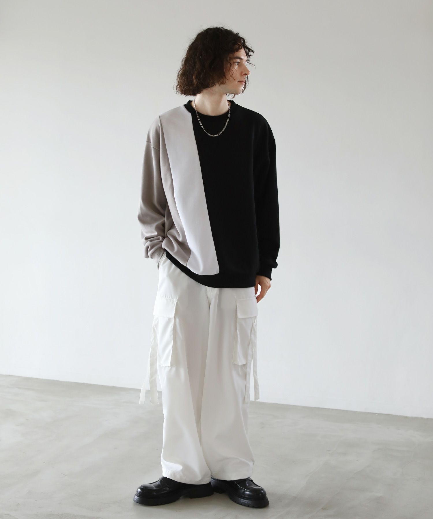 大胆な切り替デザインが印象的なトレーナー。ゆとりを持たせた身幅や肩幅でリラックス感のあるアイテムです。やや肉厚&伸縮性のあるポンチ素材を採用し、ロングシーズン活躍します。程よく光沢感があることで抜け感のあるファッショナブルなスタイルに仕上げてくれます。ブルー・ホワイト・ブラック・グレーを混ぜた配色により、合わせるアイテムを選ばず着回しやすいです。