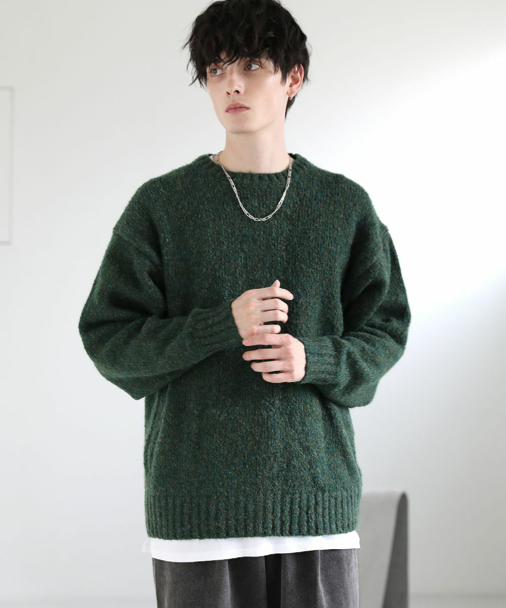 ふっくらとした温かさを感じられるウール混ミックスニット。複数のカラー糸で編まれた表情のあるメランジニットは、のっぺりしがちな冬のコーディネートに立体感をプラスしてくれます。オーバー過ぎず程よくゆとりのあるベーシックなシルエットで、シーンやアイテムを選ばず、マルチに着まわせる一着。首元・袖・裾部分にリブを施すことで、きれいなシルエットラインを実現。また隙間風の侵入を防ぎ、暖かく着用していただけます。カラーは、スタンダードなブラック系、こっくりとした深みのあるブラウン系、グリーン系の3色展開です。