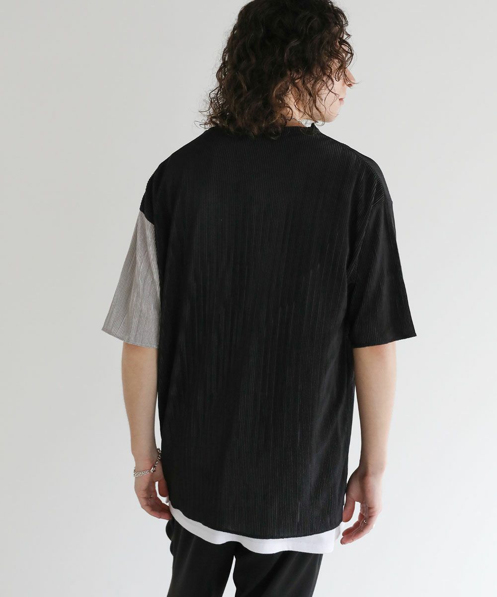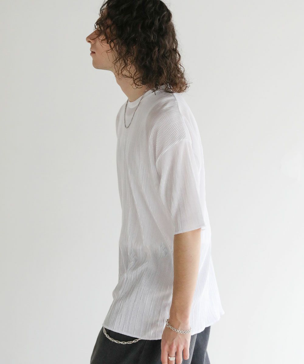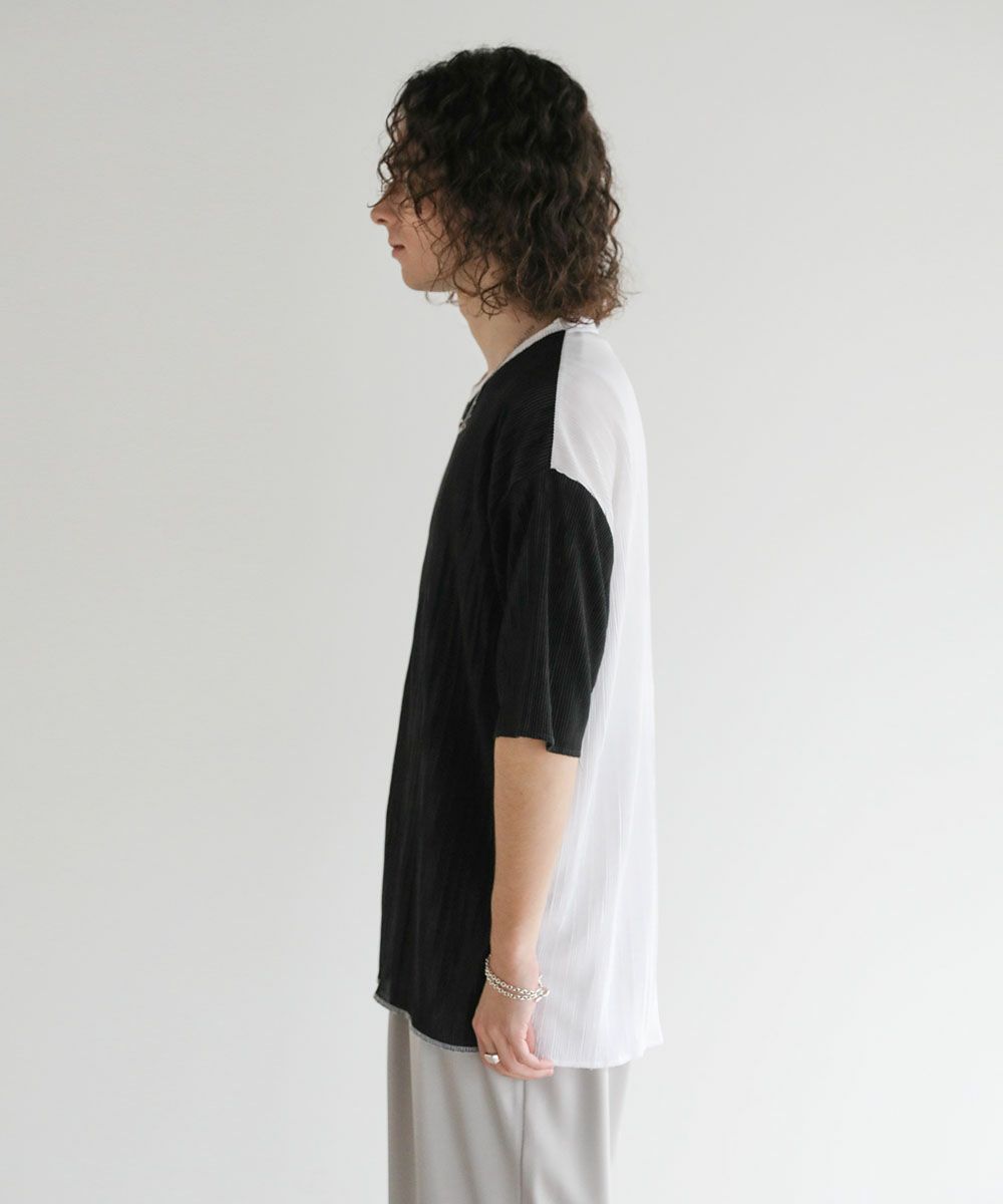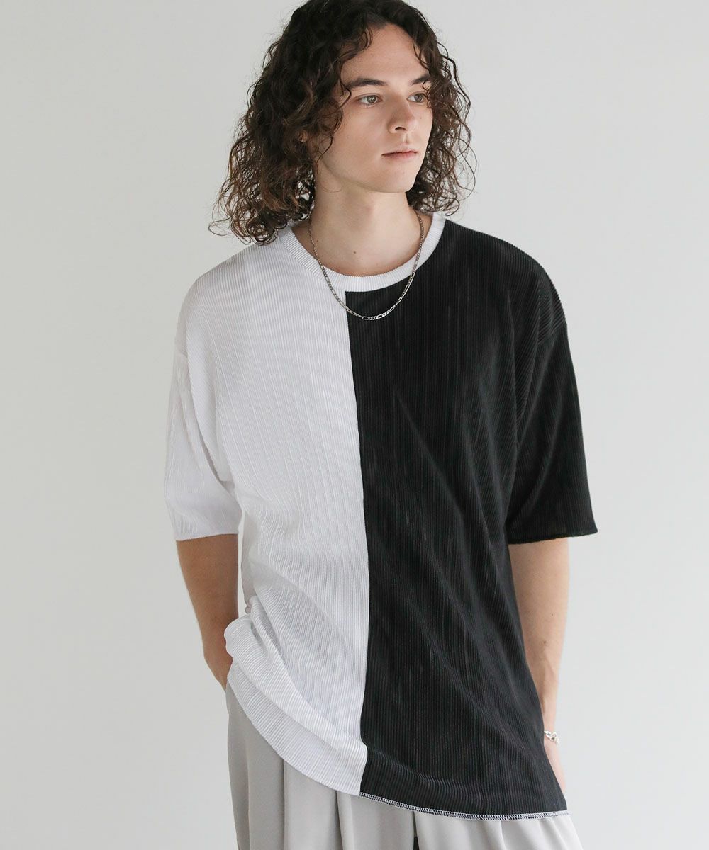 ストライププリーツ加工の立体感がニュアンスのある半袖Tシャツ。シンプルなボックスシルエットとクルーネックで合わせやすいデザイン。生地には凹凸があり、さらっとしたタッチと軽やかな着心地で、涼しく着用いただけます。ベーシックな単色のホワイト、ブラックと、着こなしのアクセントになる切替デザイン、ブラック×ホワイト、ブラック×シルバーの4カラー展開。落ち感のある薄手の素材とモノトーンの色味が、着こなしにモードな雰囲気を加えます。