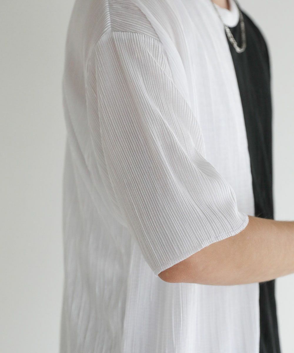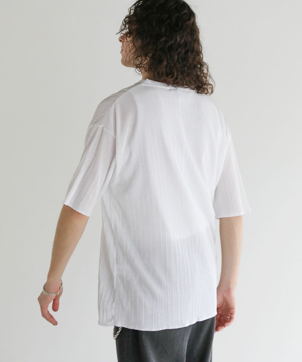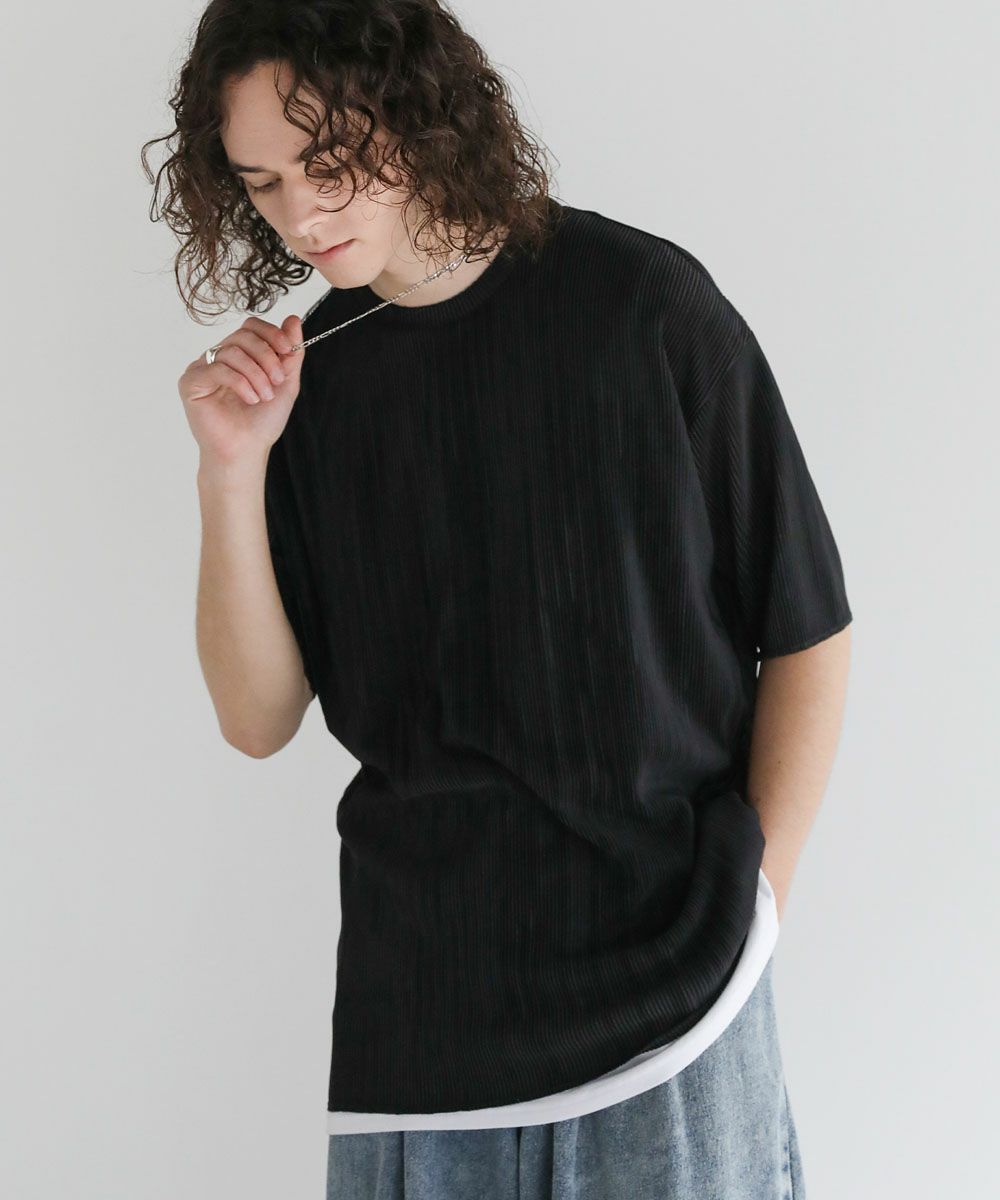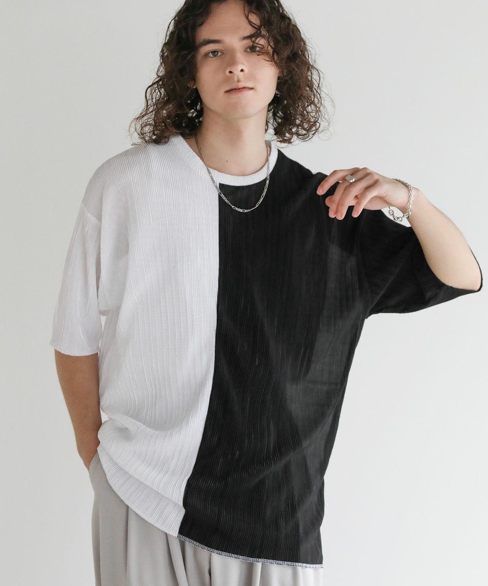 ストライププリーツ加工の立体感がニュアンスのある半袖Tシャツ。シンプルなボックスシルエットとクルーネックで合わせやすいデザイン。生地には凹凸があり、さらっとしたタッチと軽やかな着心地で、涼しく着用いただけます。ベーシックな単色のホワイト、ブラックと、着こなしのアクセントになる切替デザイン、ブラック×ホワイト、ブラック×シルバーの4カラー展開。落ち感のある薄手の素材とモノトーンの色味が、着こなしにモードな雰囲気を加えます。