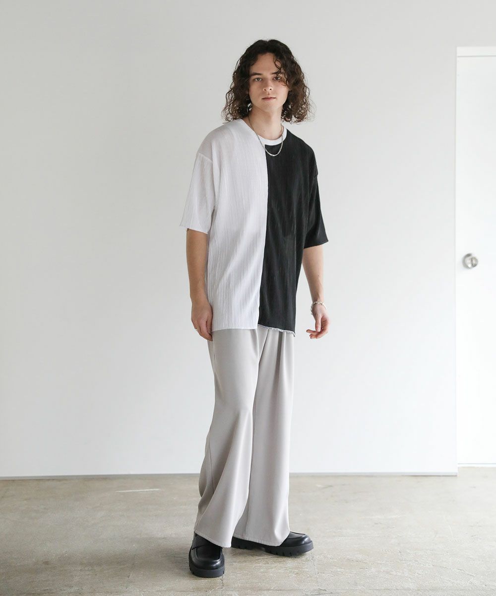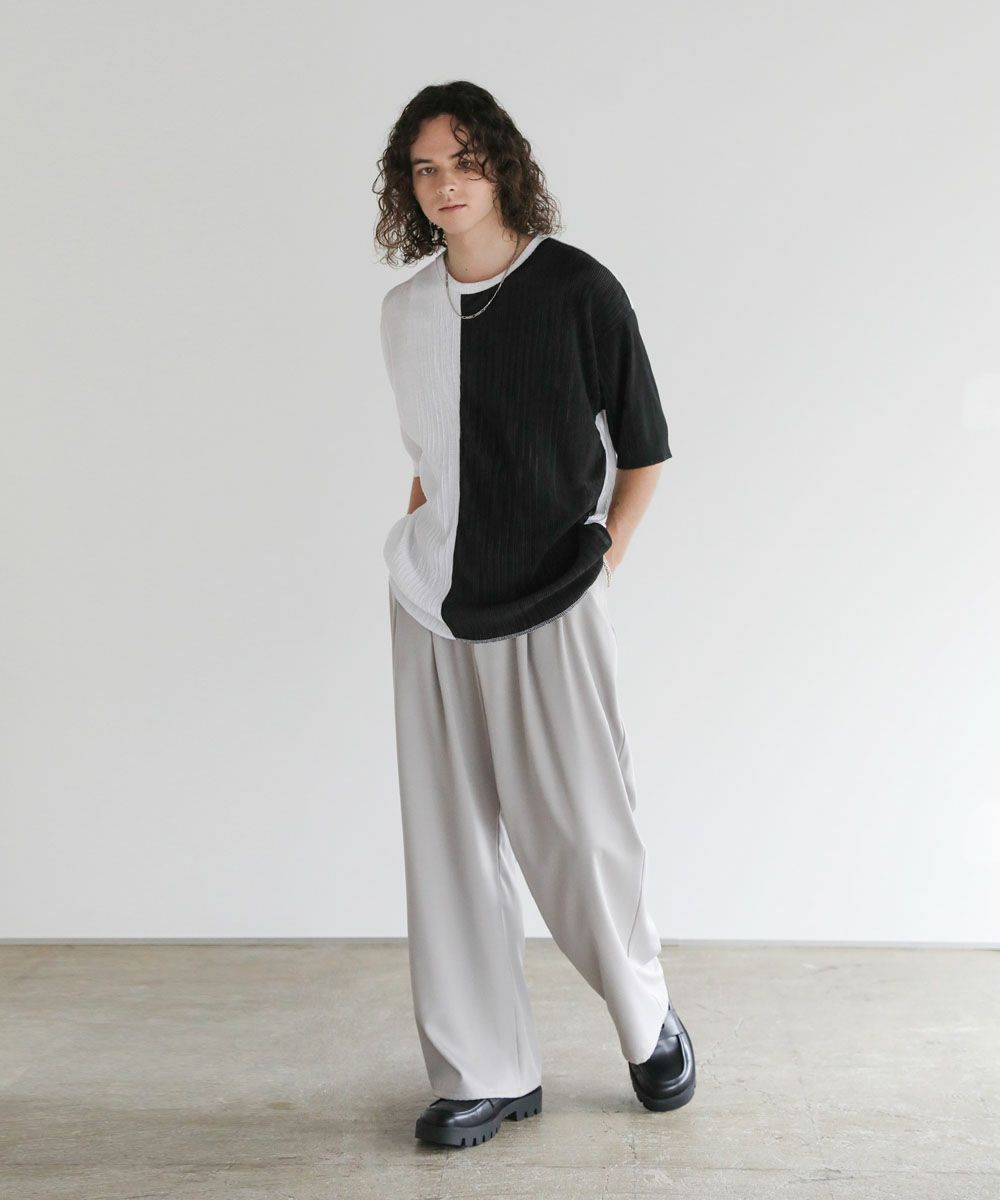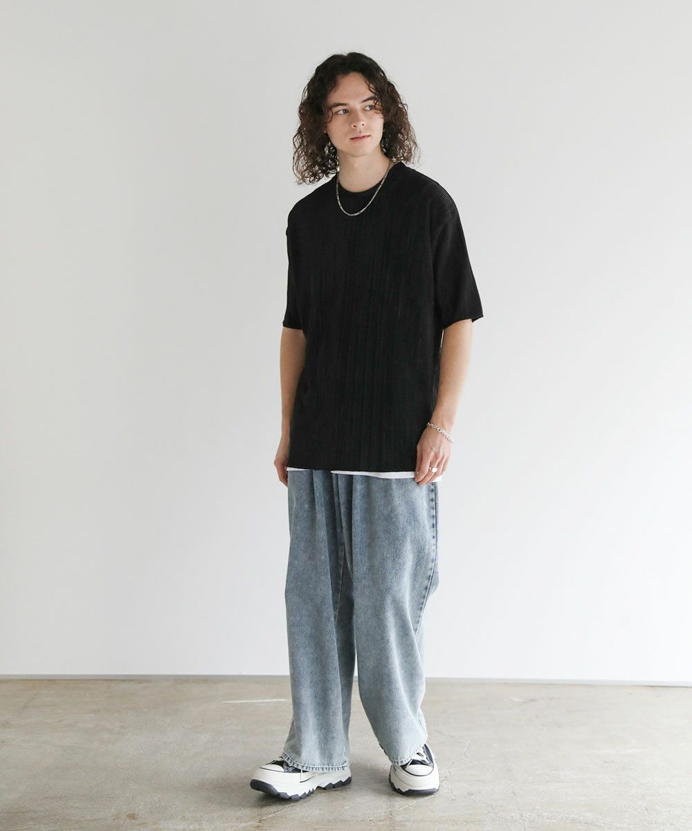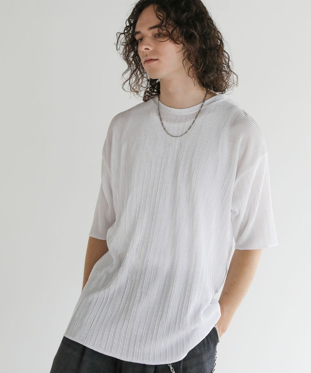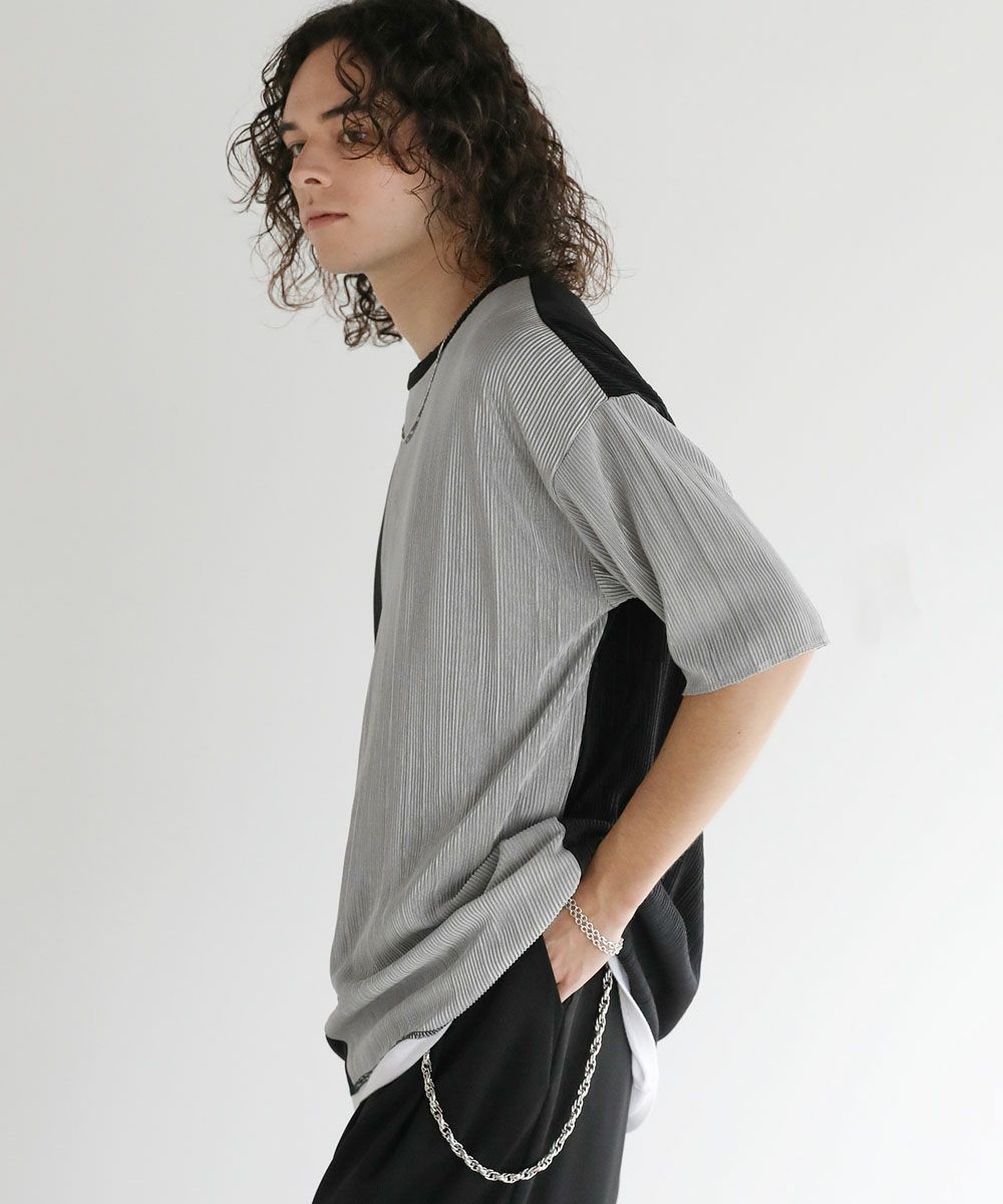 ストライププリーツ加工の立体感がニュアンスのある半袖Tシャツ。シンプルなボックスシルエットとクルーネックで合わせやすいデザイン。生地には凹凸があり、さらっとしたタッチと軽やかな着心地で、涼しく着用いただけます。ベーシックな単色のホワイト、ブラックと、着こなしのアクセントになる切替デザイン、ブラック×ホワイト、ブラック×シルバーの4カラー展開。落ち感のある薄手の素材とモノトーンの色味が、着こなしにモードな雰囲気を加えます。