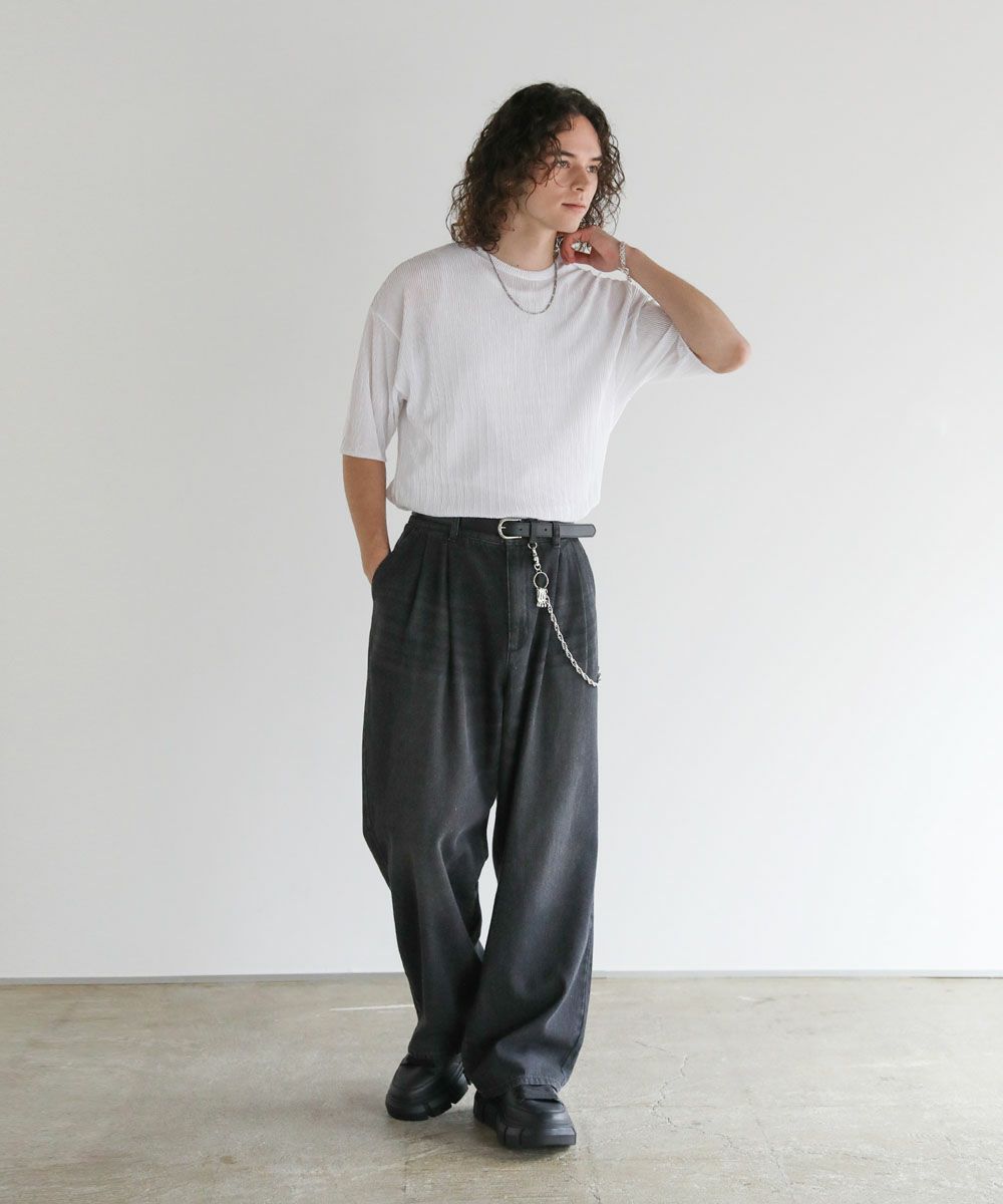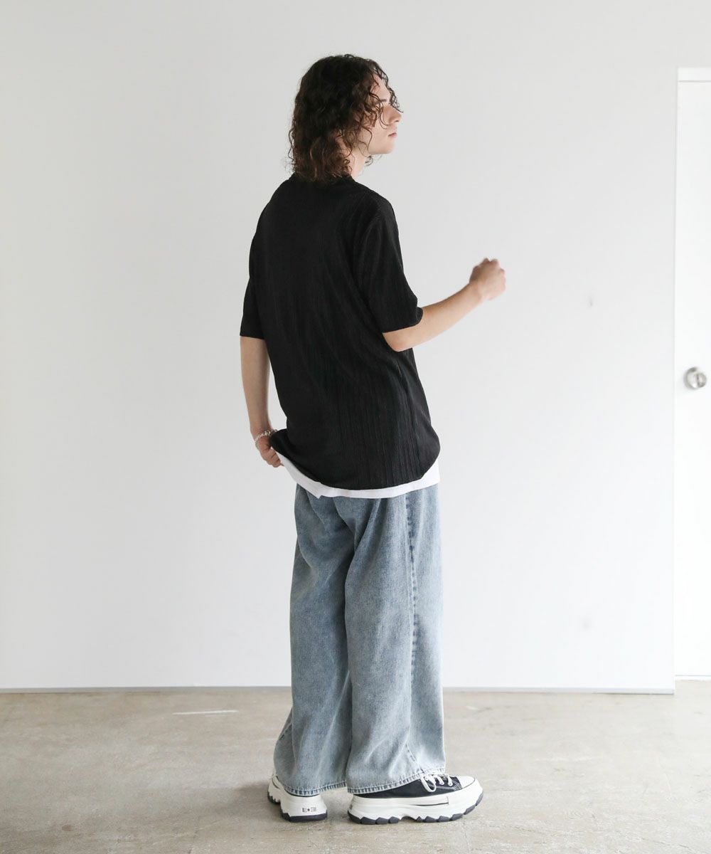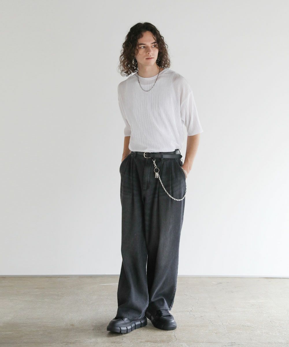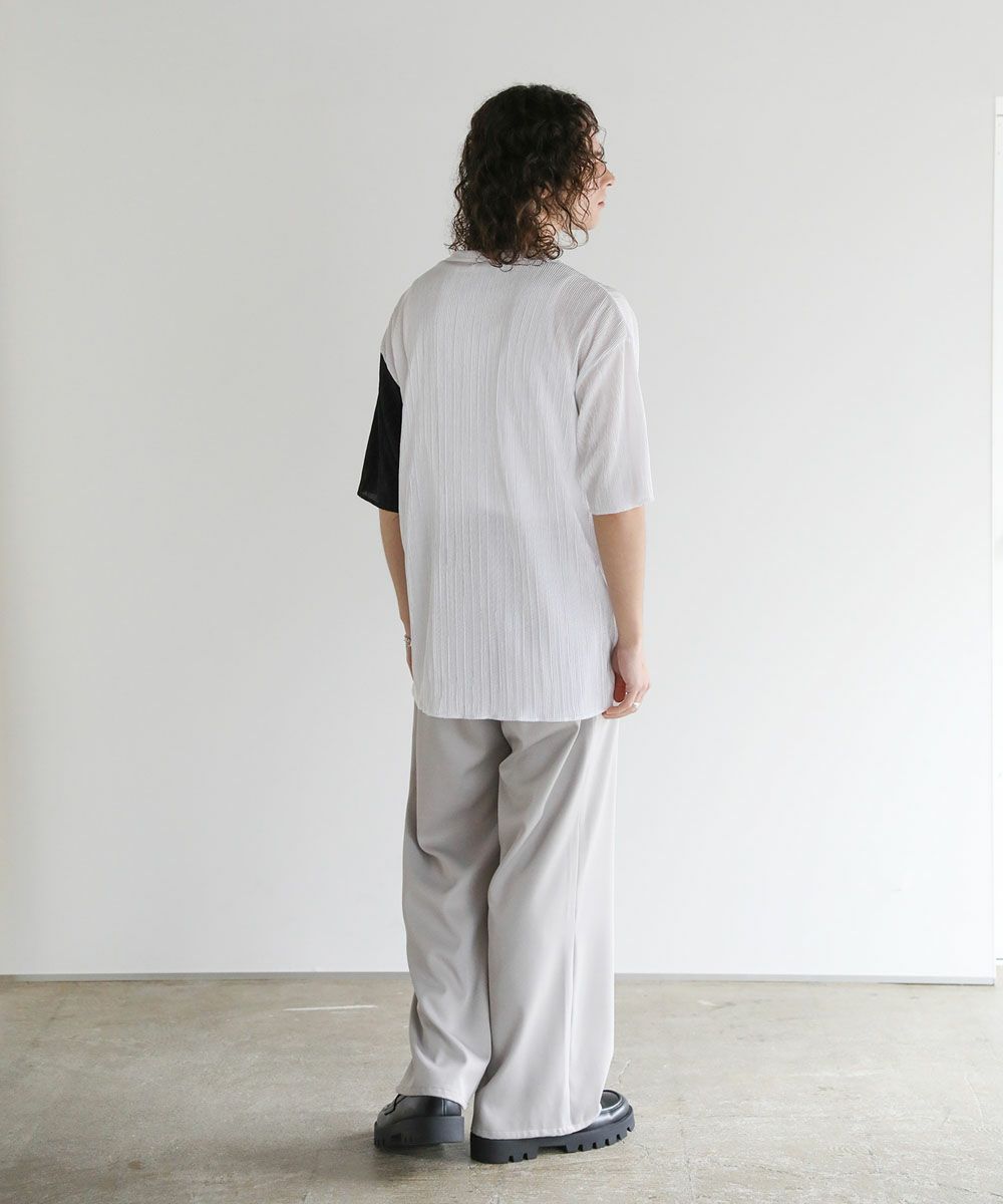 ストライププリーツ加工の立体感がニュアンスのある半袖Tシャツ。シンプルなボックスシルエットとクルーネックで合わせやすいデザイン。生地には凹凸があり、さらっとしたタッチと軽やかな着心地で、涼しく着用いただけます。ベーシックな単色のホワイト、ブラックと、着こなしのアクセントになる切替デザイン、ブラック×ホワイト、ブラック×シルバーの4カラー展開。落ち感のある薄手の素材とモノトーンの色味が、着こなしにモードな雰囲気を加えます。