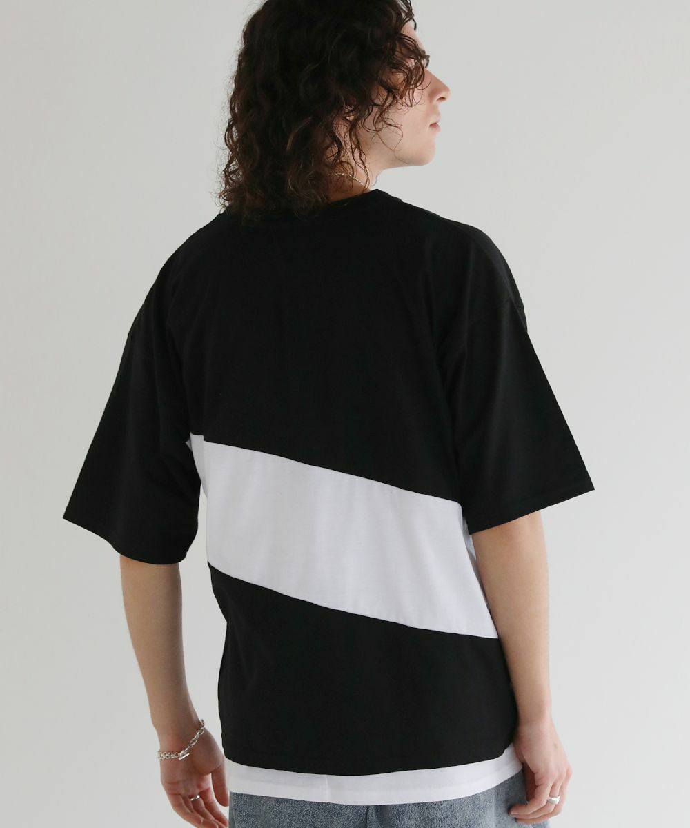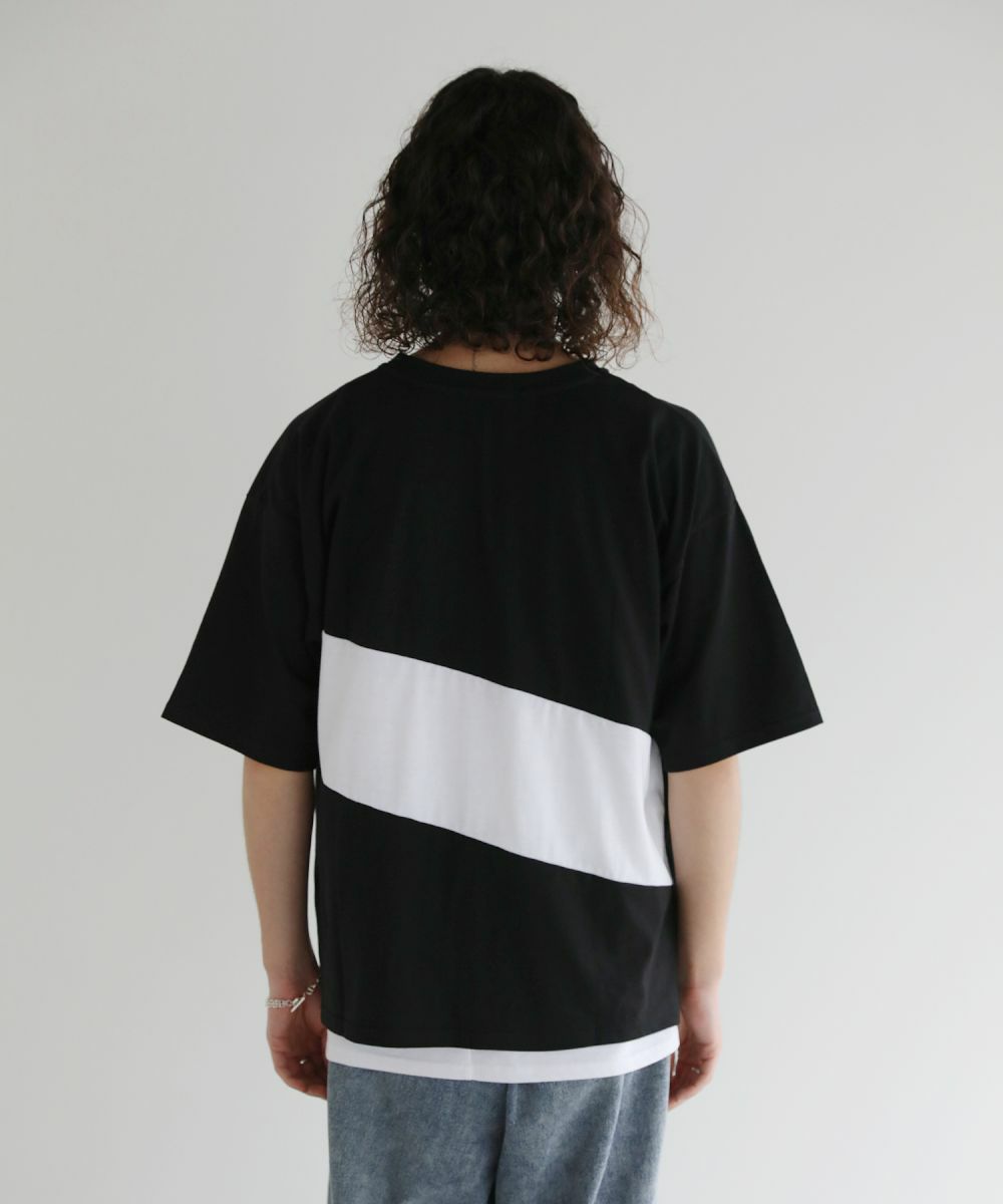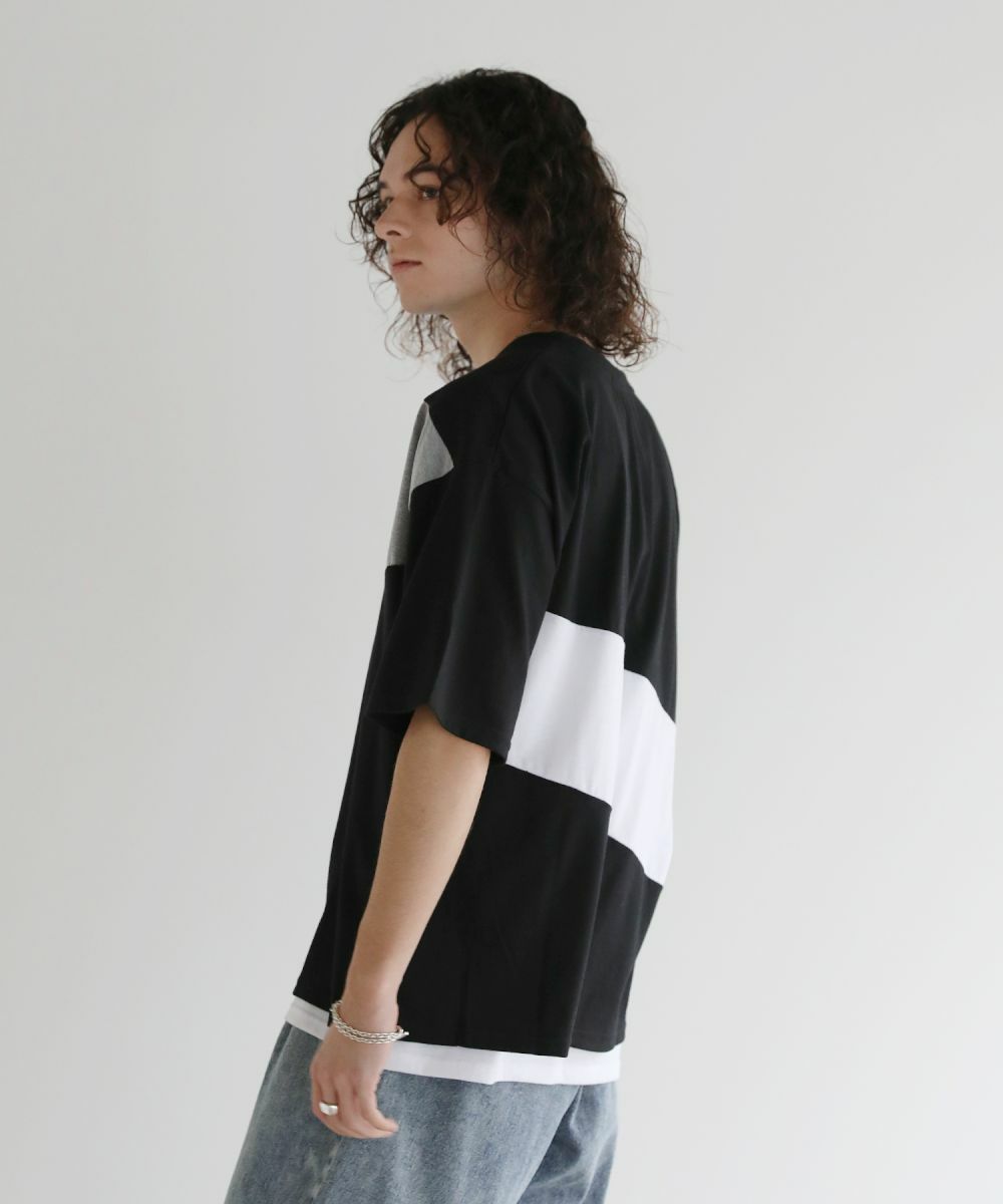 フロントとバックに一本通った切り替えラインデザインが特徴のTシャツ。ゆとりを持たせた身幅や肩幅で、5分袖デザインを採用しました。目を惹くデザインでコーディネートの主役になること間違いなしの1着。個性的ながらもモノトーンで派手になりすぎずコーデをまとめるデザインです。