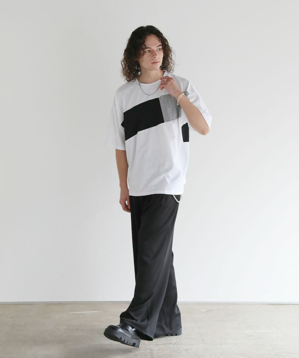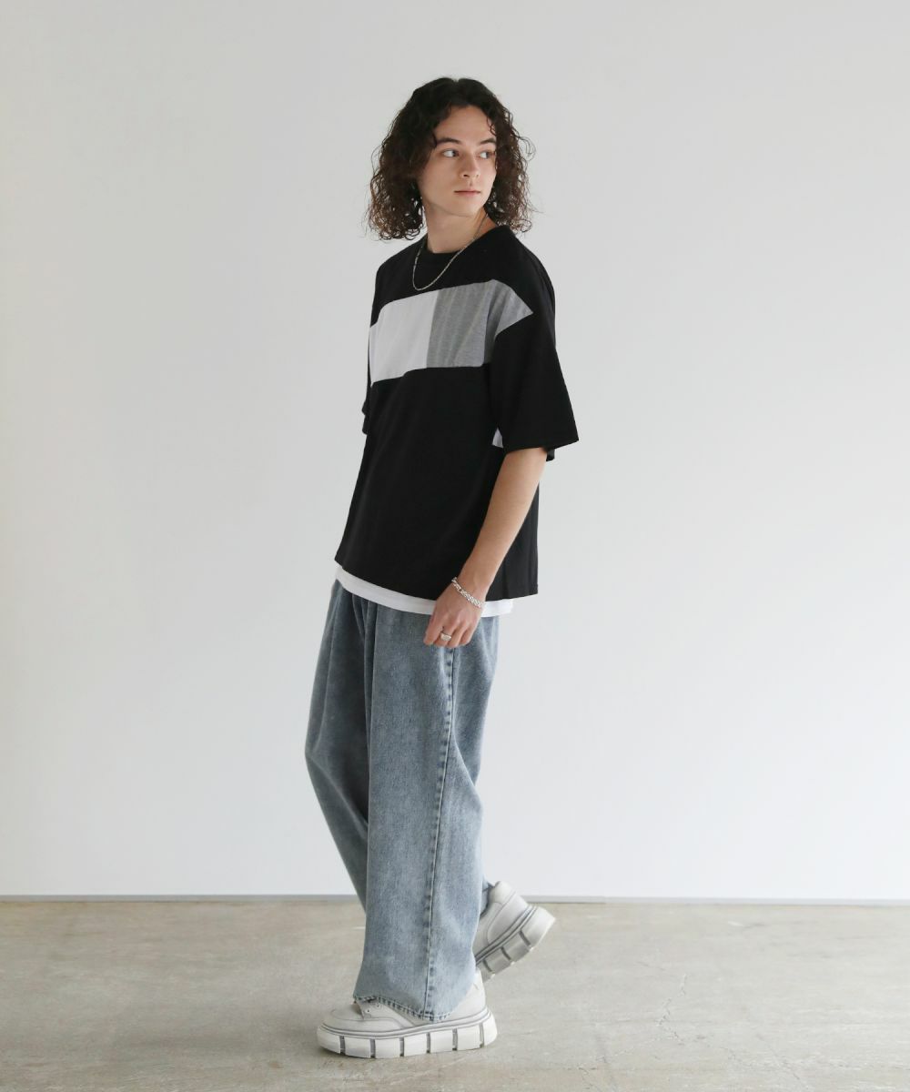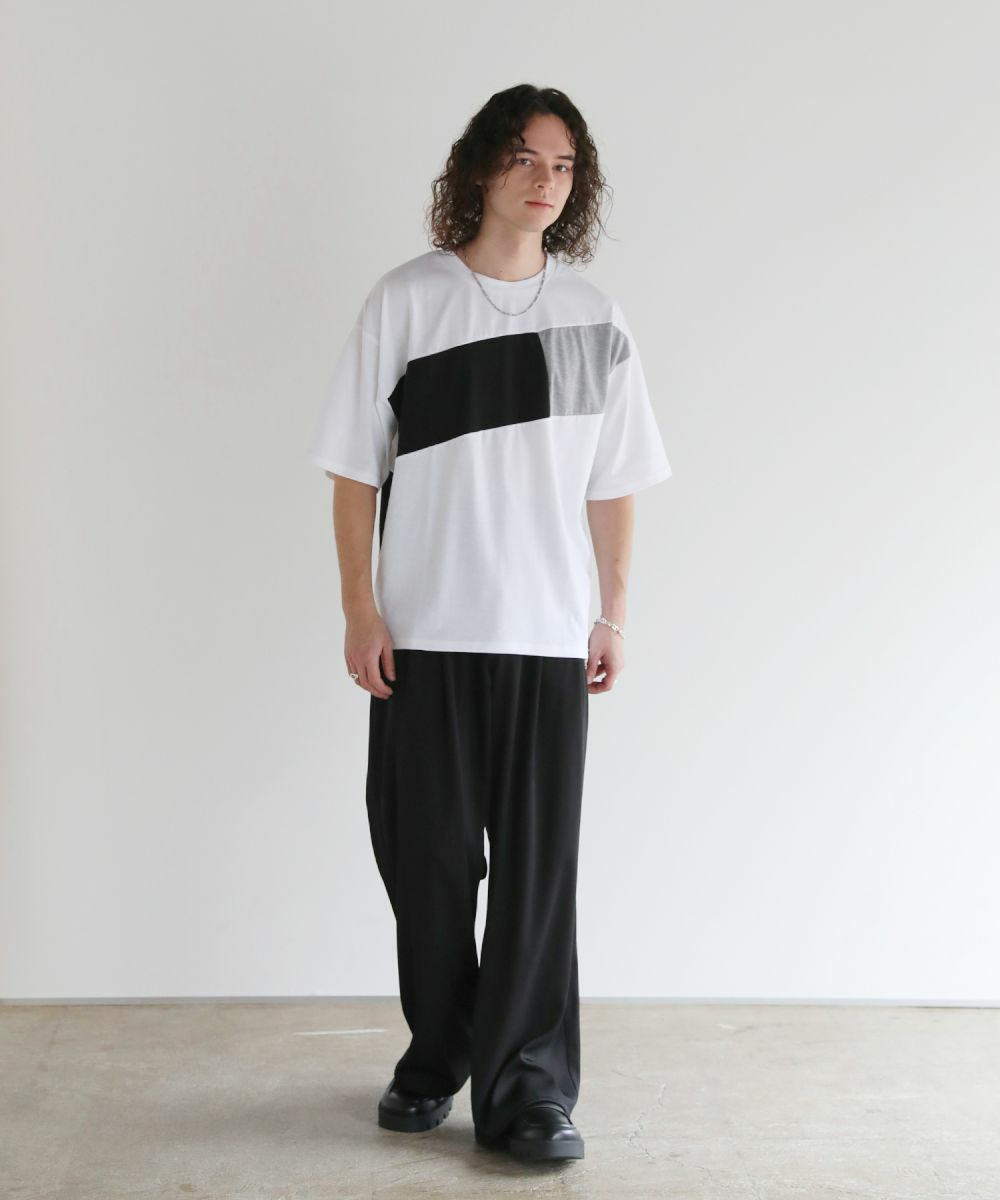 フロントとバックに一本通った切り替えラインデザインが特徴のTシャツ。ゆとりを持たせた身幅や肩幅で、5分袖デザインを採用しました。目を惹くデザインでコーディネートの主役になること間違いなしの1着。個性的ながらもモノトーンで派手になりすぎずコーデをまとめるデザインです。