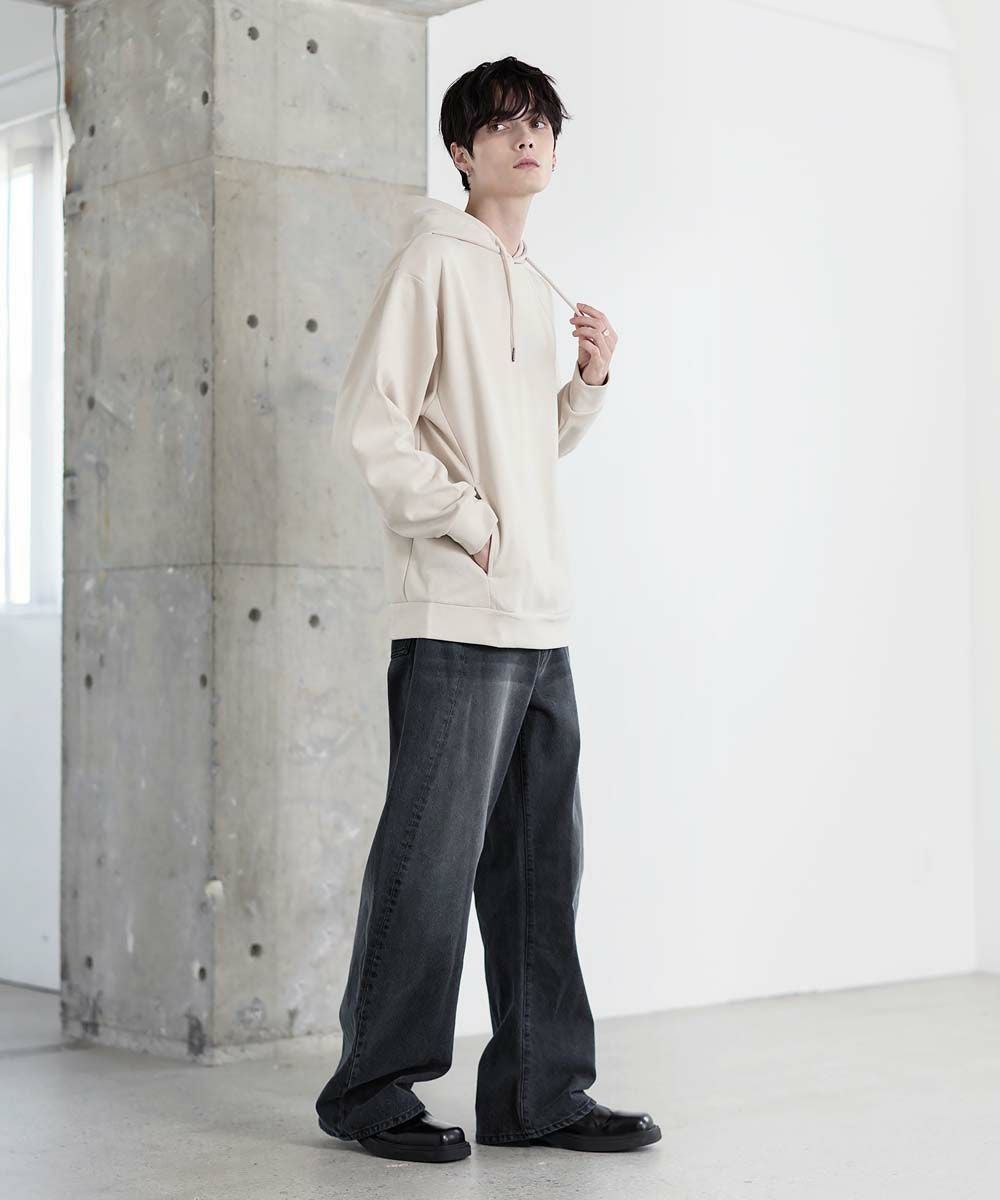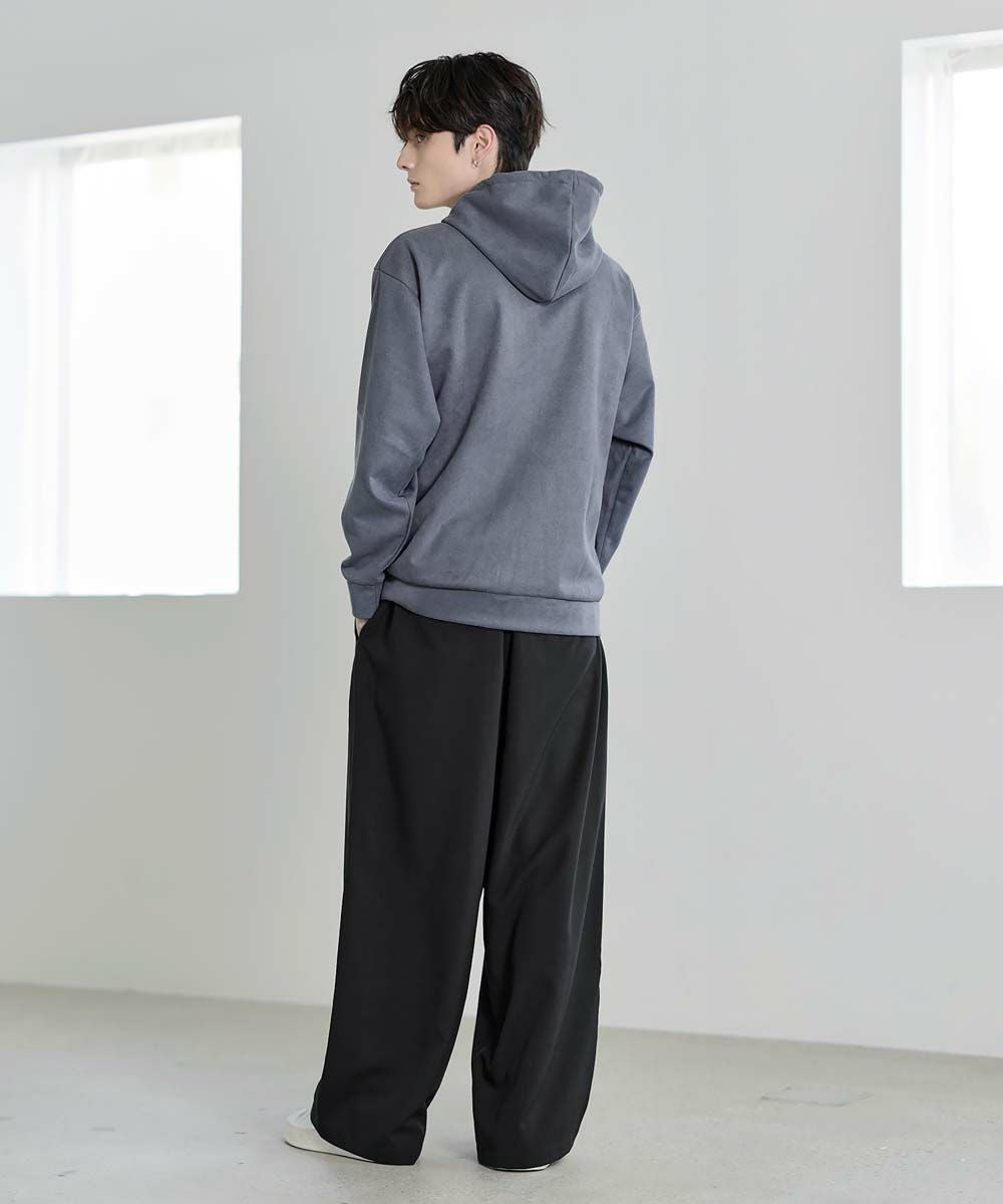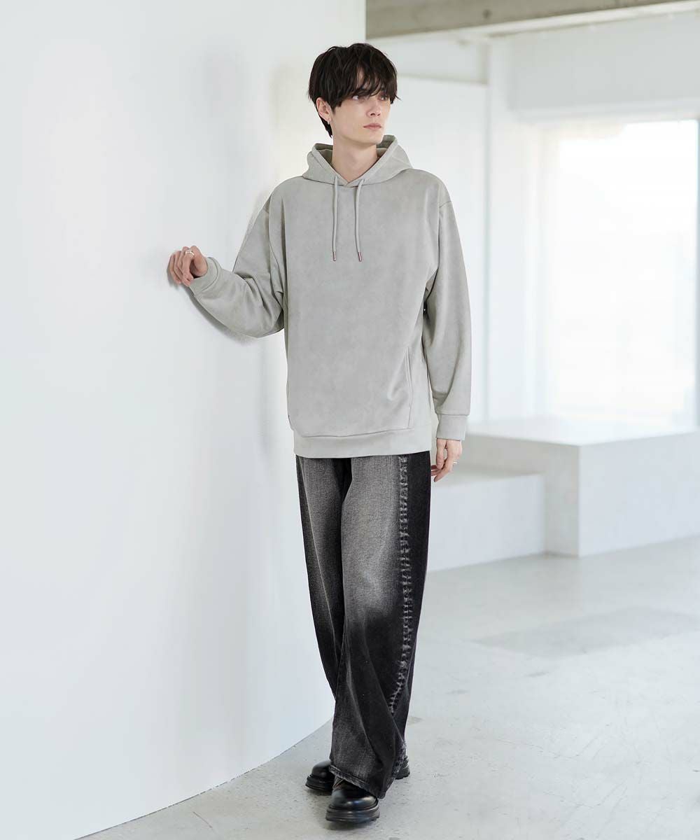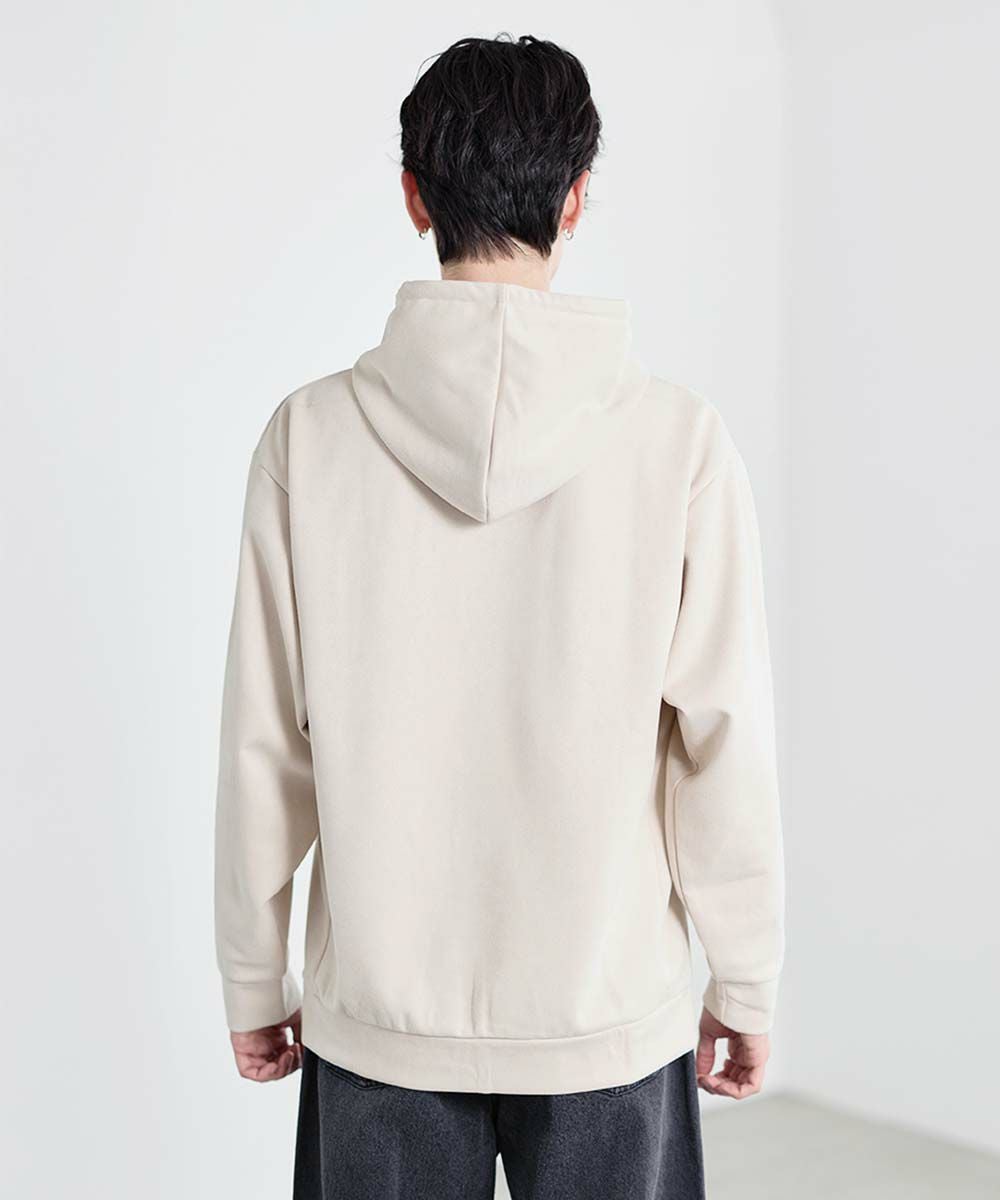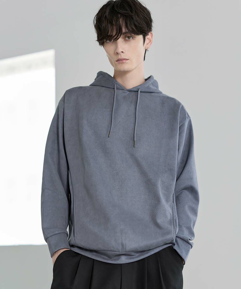 フェイクスウェード特有のしっとりとした手触りと柔らかな落ち感が、カジュアルなフーディに品を添えます。