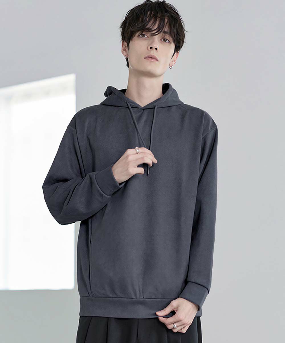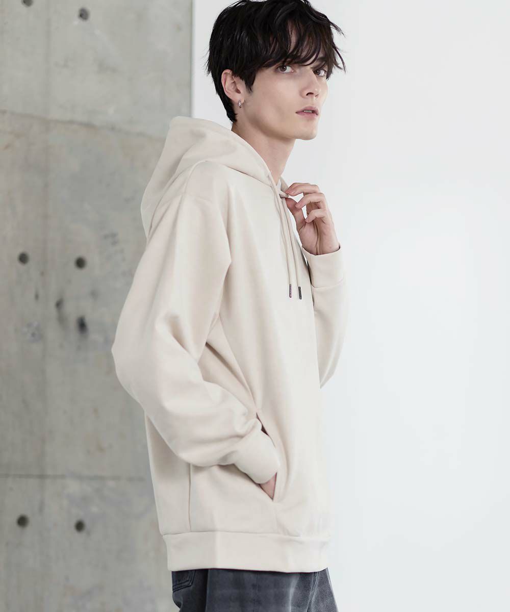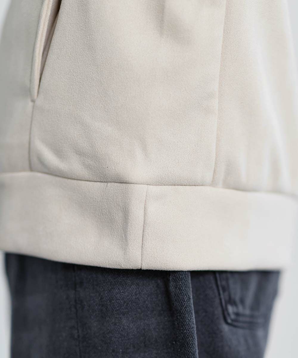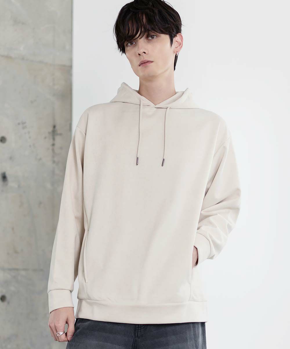 上品な印象のポリスウェード生地で仕立てたプルオーバーパーカー。 フェイクスウェード特有のしっとりとした手触りと柔らかな落ち感が、カジュアルなフーディに品を添えます。 余計なディテールを削ぎ落としたミニマルなデザインは、どんなスタイルにも自然に溶け込みながらも存在感を放ちます。 ややゆとりをもたせたシルエットは、リラックス感がありつつも野暮ったくならず、1枚での着用はもちろん、アウターのインナーとしてももすっきりと収まるバランスです。 素材のしなやかさが引き立つ自然なフードラインで、ほどよい抜け感と柔らかな雰囲気をプラス。 リラックスしたムードの中にも上品さが宿る一着です。
