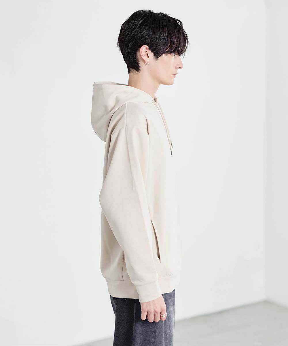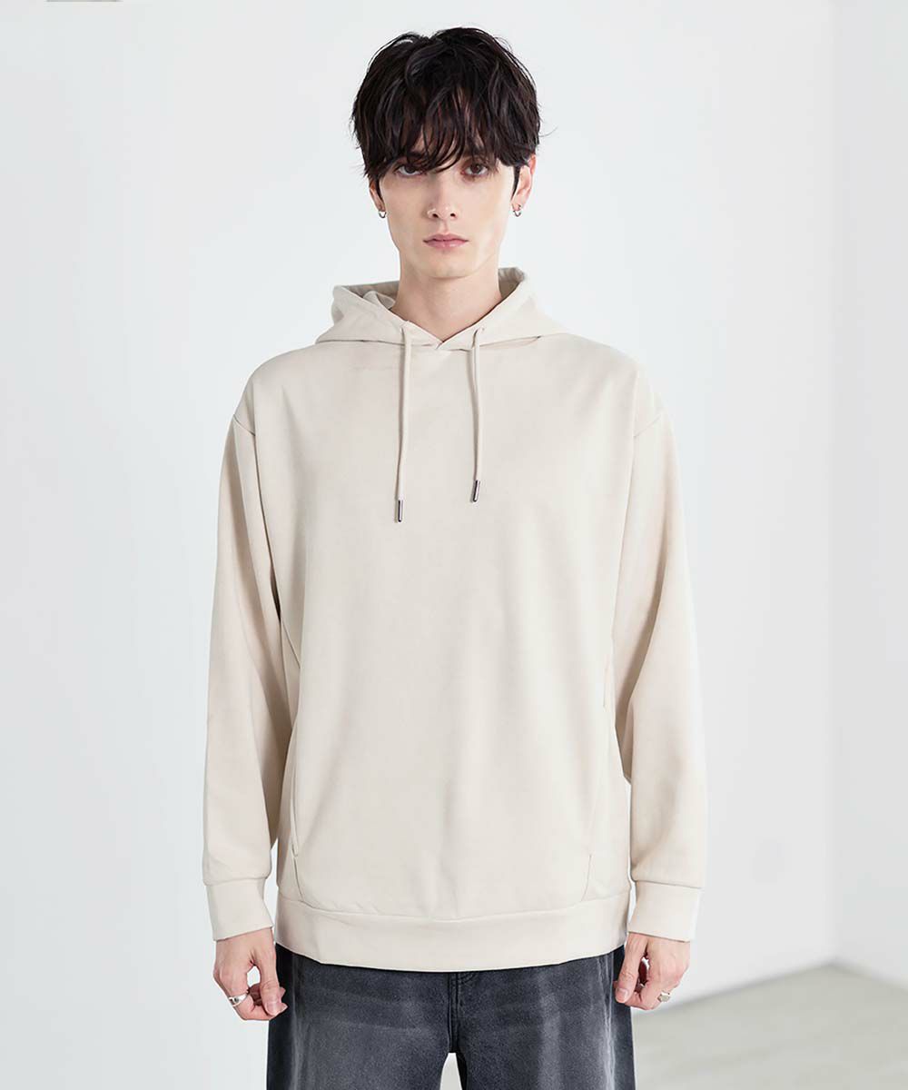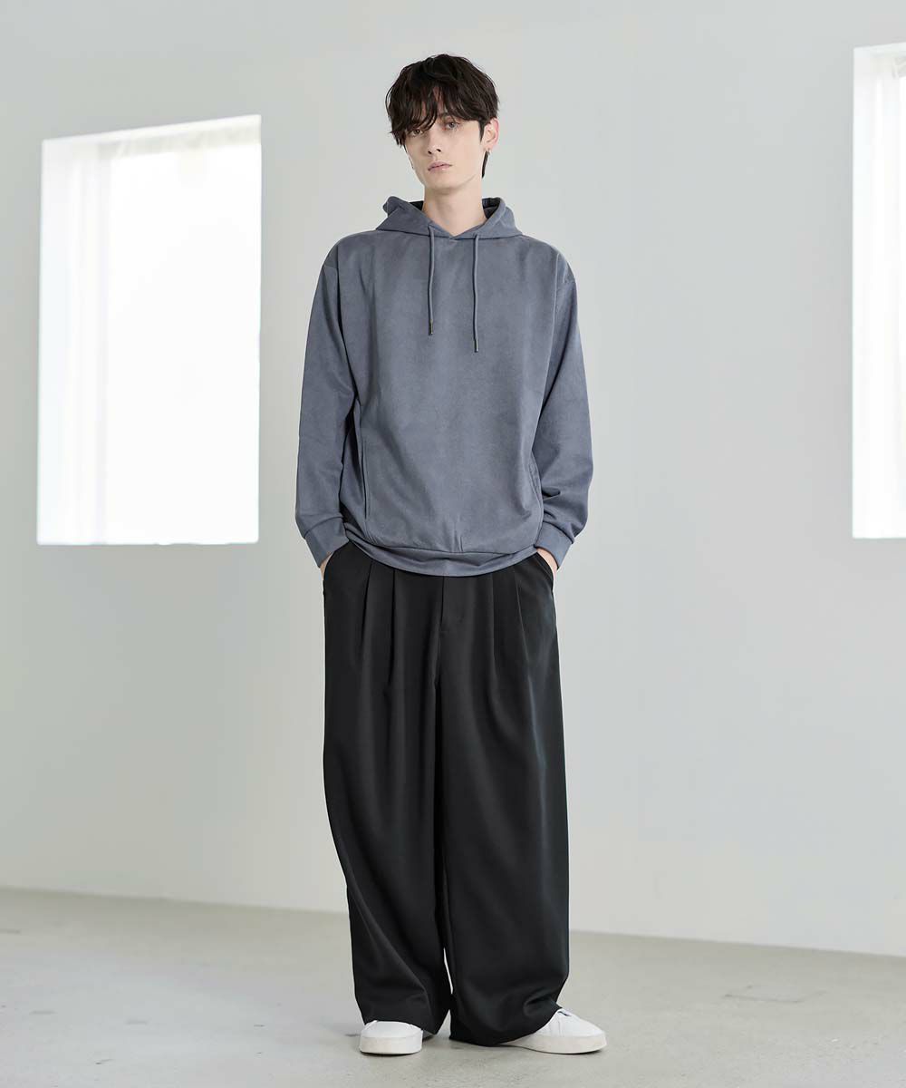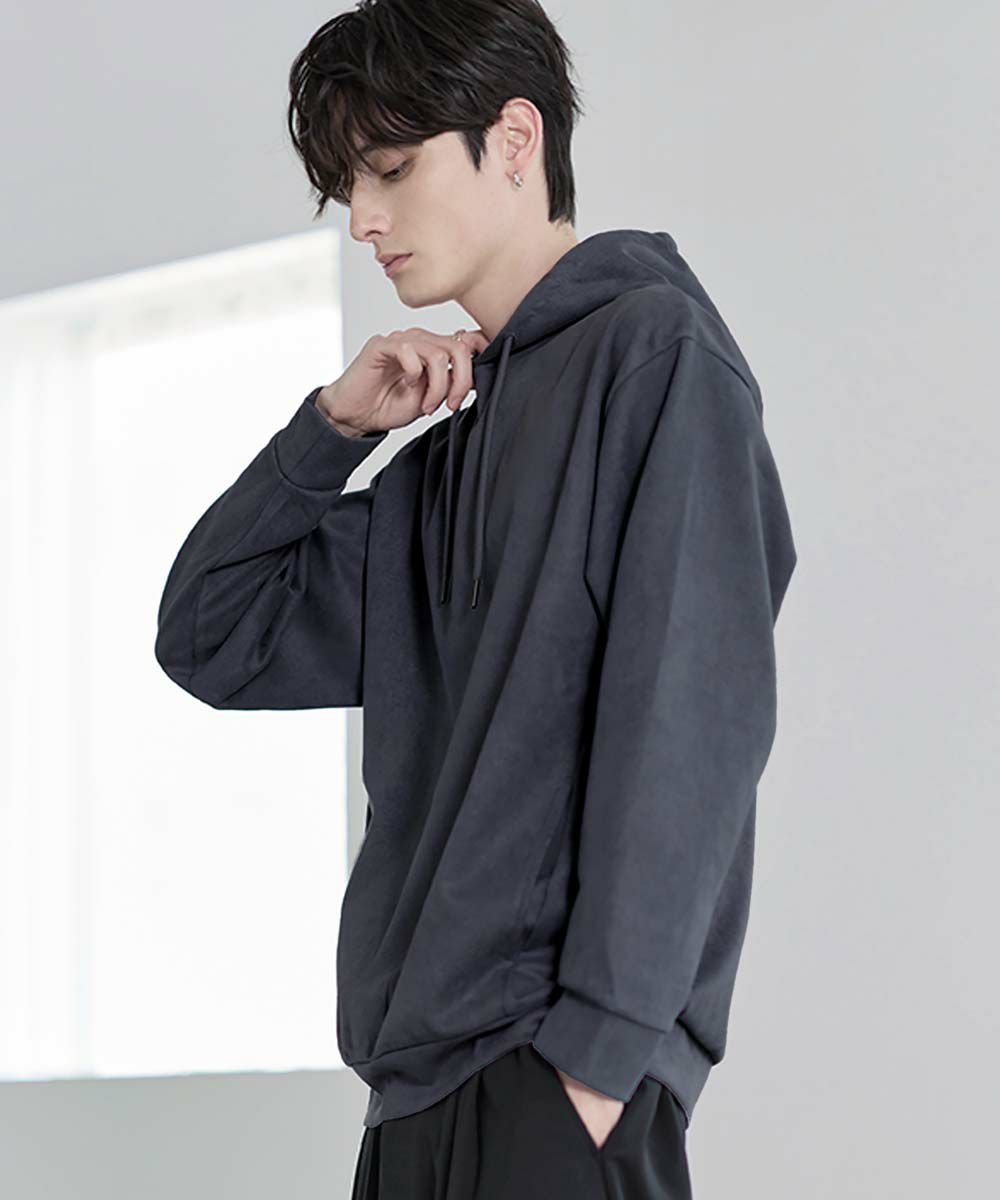 上品な印象のポリスウェード生地で仕立てたプルオーバーパーカー。 フェイクスウェード特有のしっとりとした手触りと柔らかな落ち感が、カジュアルなフーディに品を添えます。 余計なディテールを削ぎ落としたミニマルなデザインは、どんなスタイルにも自然に溶け込みながらも存在感を放ちます。 ややゆとりをもたせたシルエットは、リラックス感がありつつも野暮ったくならず、1枚での着用はもちろん、アウターのインナーとしてももすっきりと収まるバランスです。 素材のしなやかさが引き立つ自然なフードラインで、ほどよい抜け感と柔らかな雰囲気をプラス。 リラックスしたムードの中にも上品さが宿る一着です。