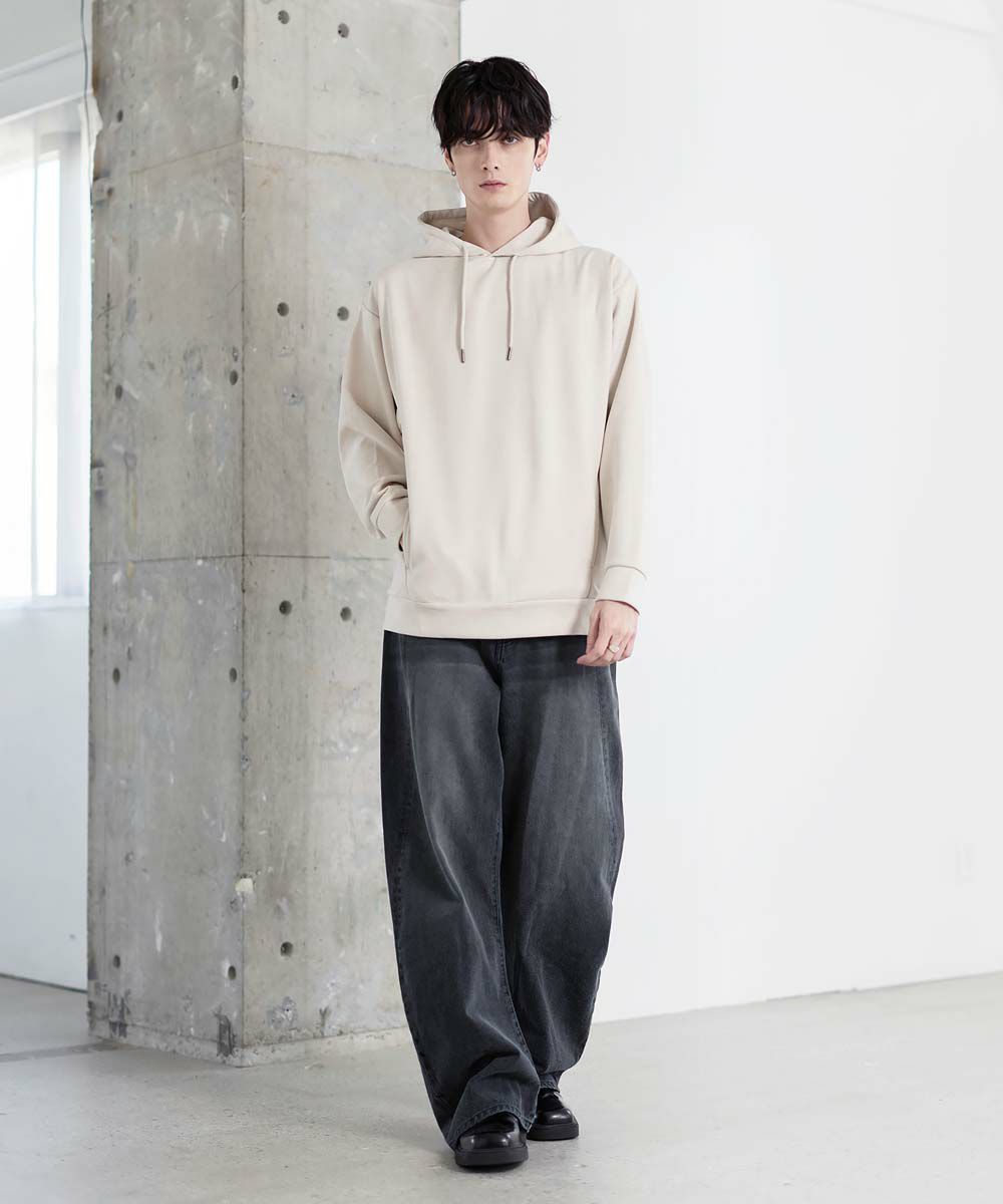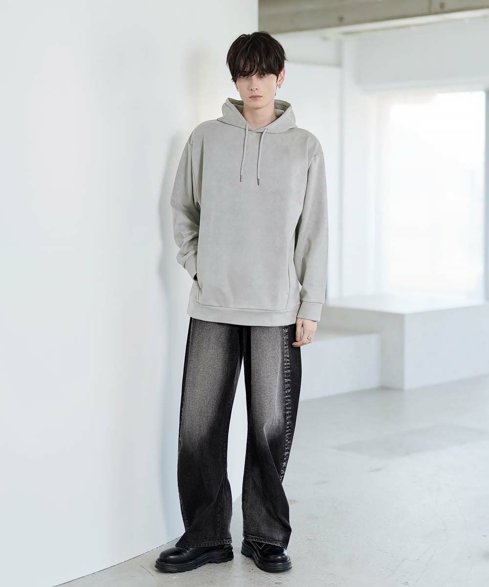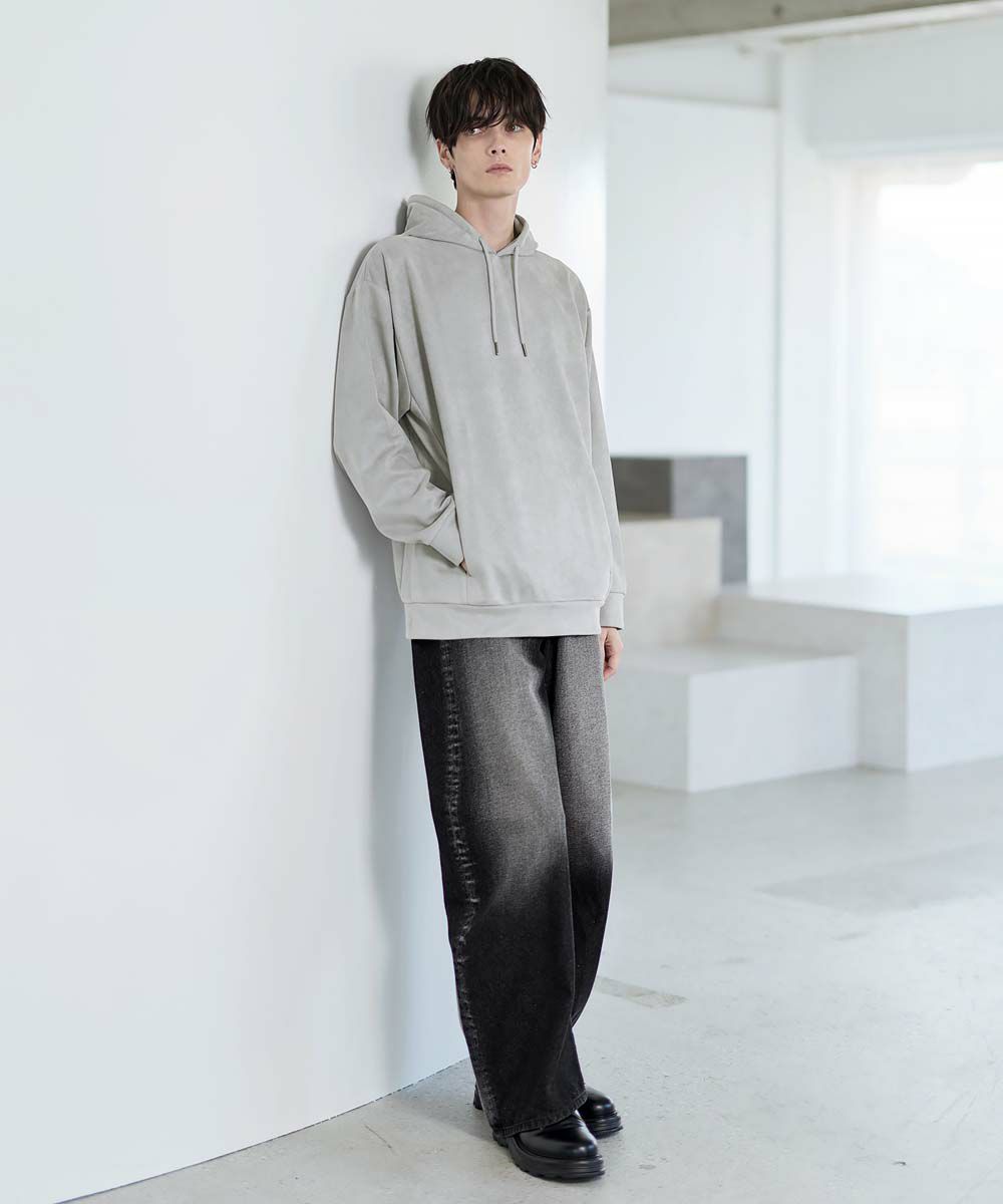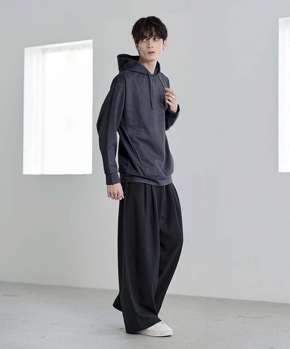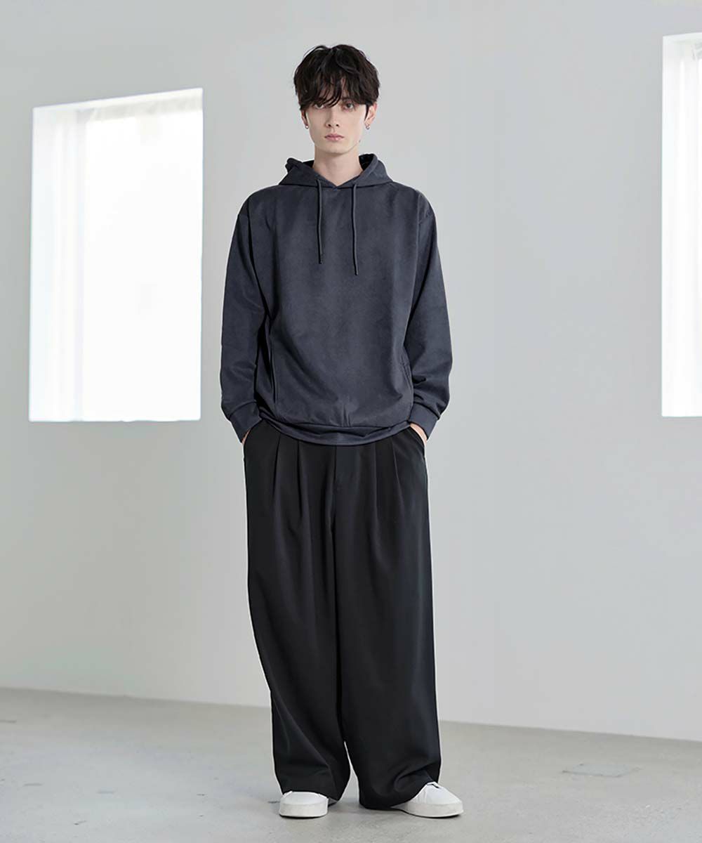 上品な印象のポリスウェード生地で仕立てたプルオーバーパーカー。 フェイクスウェード特有のしっとりとした手触りと柔らかな落ち感が、カジュアルなフーディに品を添えます。 余計なディテールを削ぎ落としたミニマルなデザインは、どんなスタイルにも自然に溶け込みながらも存在感を放ちます。 ややゆとりをもたせたシルエットは、リラックス感がありつつも野暮ったくならず、1枚での着用はもちろん、アウターのインナーとしてももすっきりと収まるバランスです。 素材のしなやかさが引き立つ自然なフードラインで、ほどよい抜け感と柔らかな雰囲気をプラス。 リラックスしたムードの中にも上品さが宿る一着です。