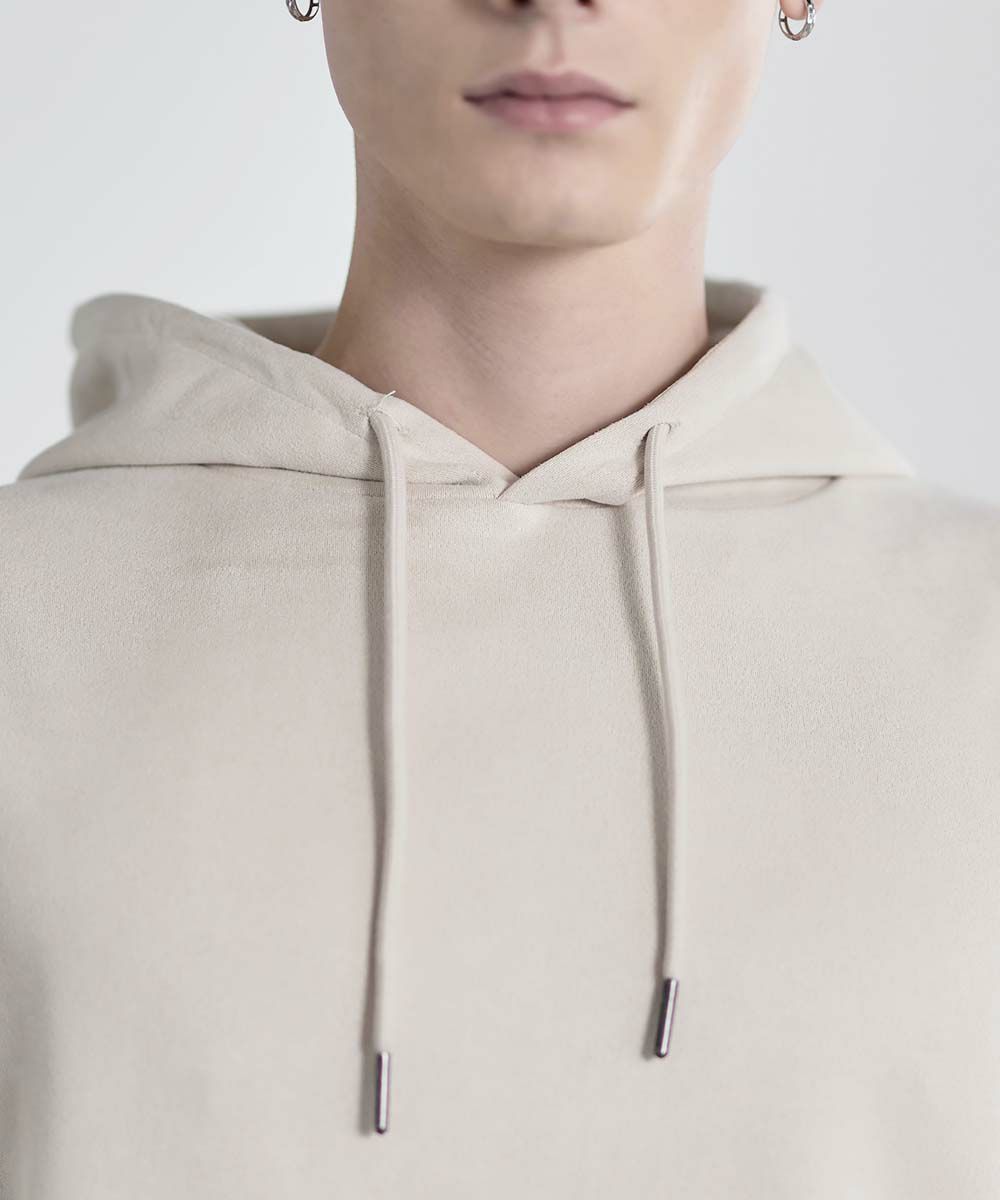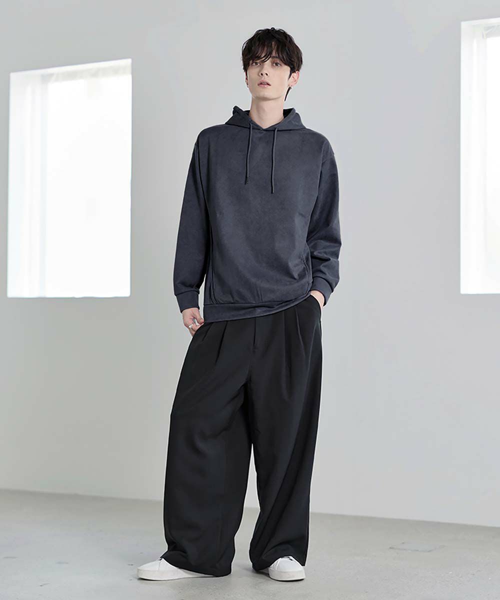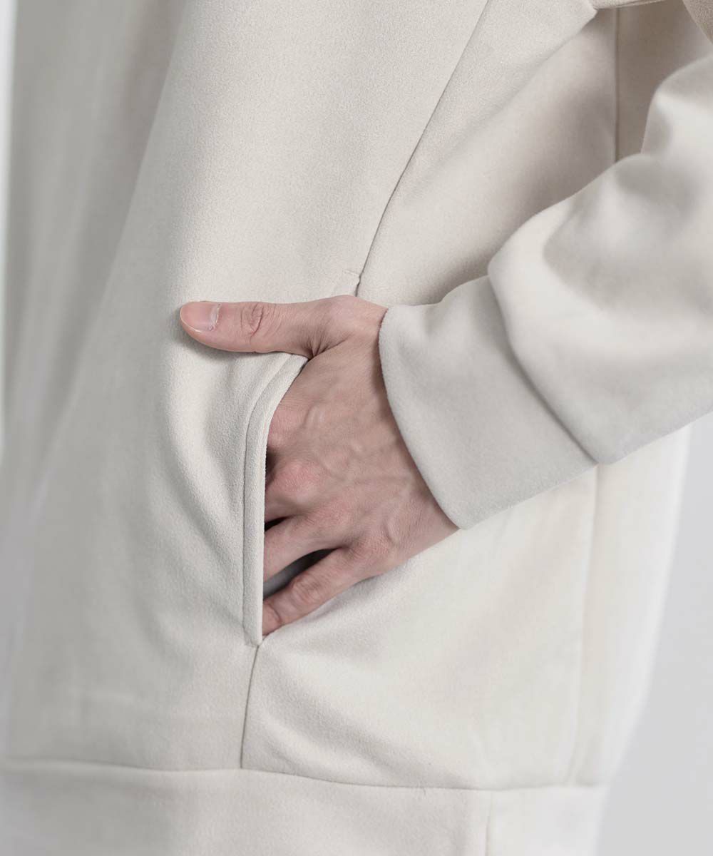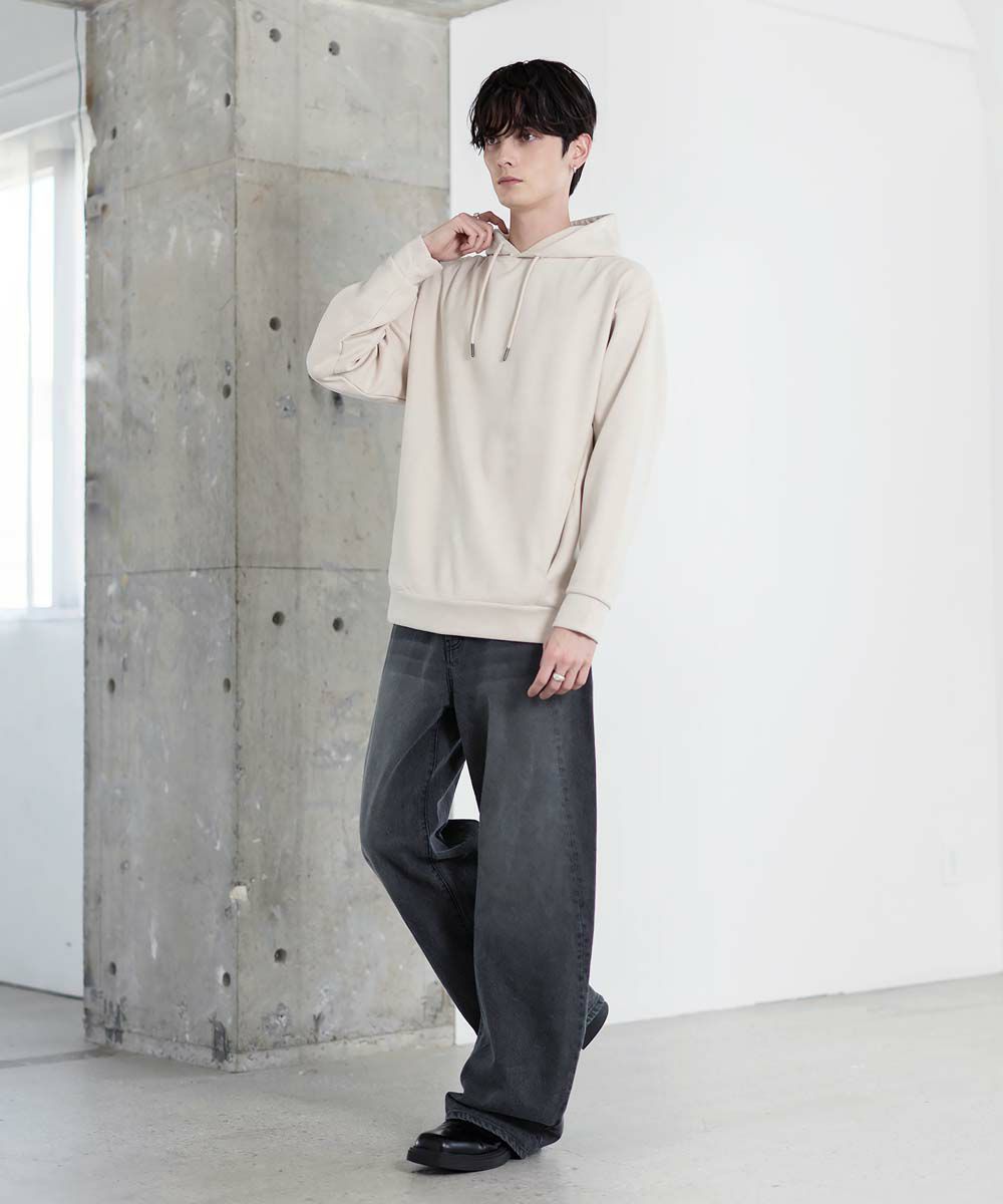 上品な印象のポリスウェード生地で仕立てたプルオーバーパーカー。 フェイクスウェード特有のしっとりとした手触りと柔らかな落ち感が、カジュアルなフーディに品を添えます。 余計なディテールを削ぎ落としたミニマルなデザインは、どんなスタイルにも自然に溶け込みながらも存在感を放ちます。 ややゆとりをもたせたシルエットは、リラックス感がありつつも野暮ったくならず、1枚での着用はもちろん、アウターのインナーとしてももすっきりと収まるバランスです。 素材のしなやかさが引き立つ自然なフードラインで、ほどよい抜け感と柔らかな雰囲気をプラス。 リラックスしたムードの中にも上品さが宿る一着です。