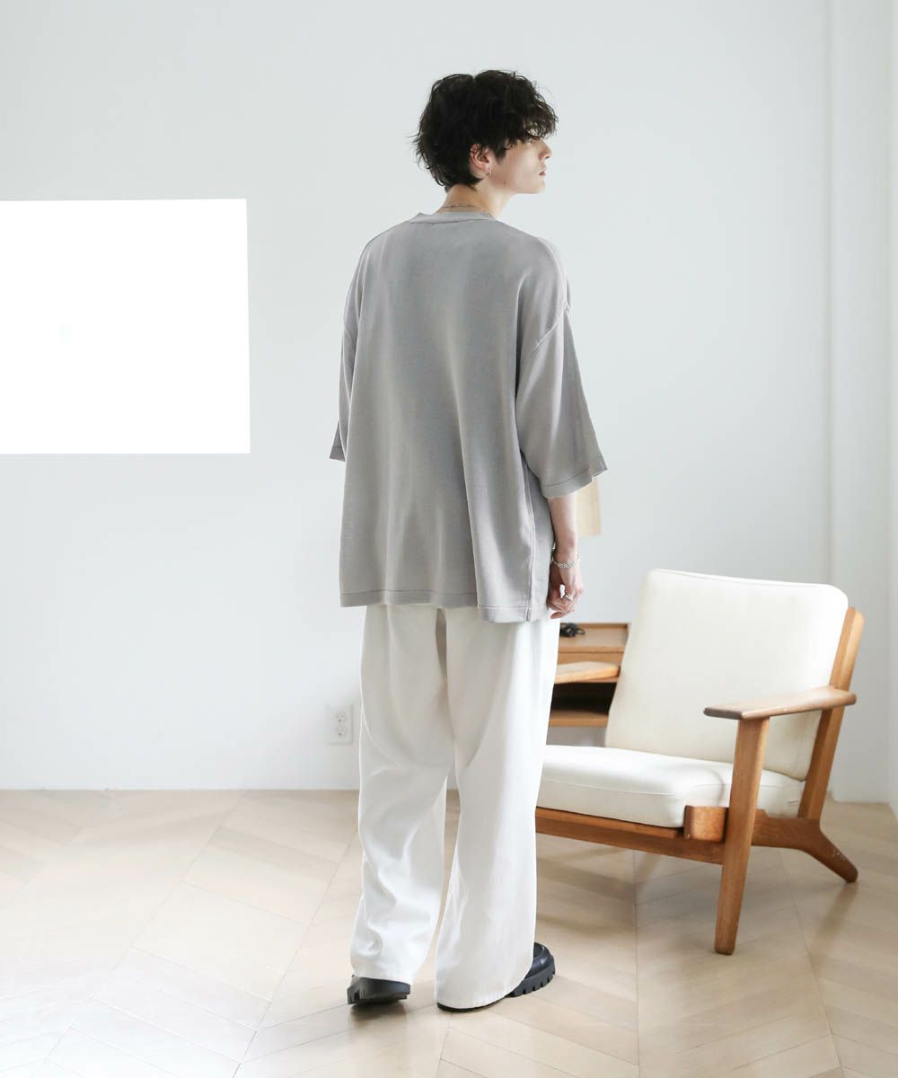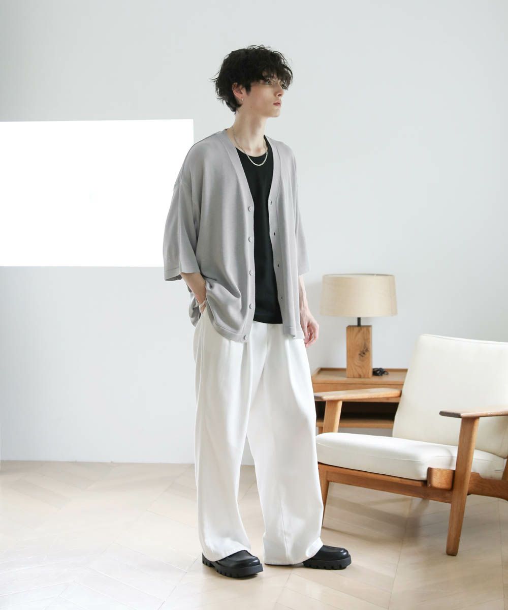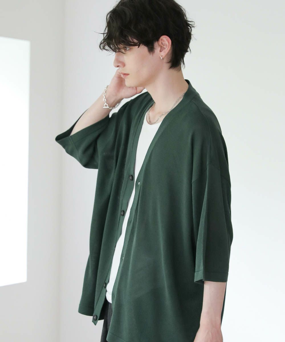 汗ばむ夏に欠かせない、ドライな半袖ニットカーディガン。肩の落ちたドロップショルダー、肘まで掛かる長めの袖丈など、トレンドを押さえたリラックス感のあるシルエットが魅力です。深めのVネックラインですっきりと着こなせる、抜け感のあるアイテム。シンプルで飽きの来ないデザインなので、カジュアルからきれいめまで様々なスタイリングをお楽しみいただけます。